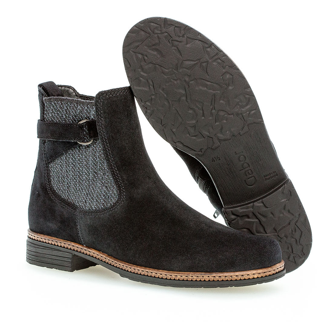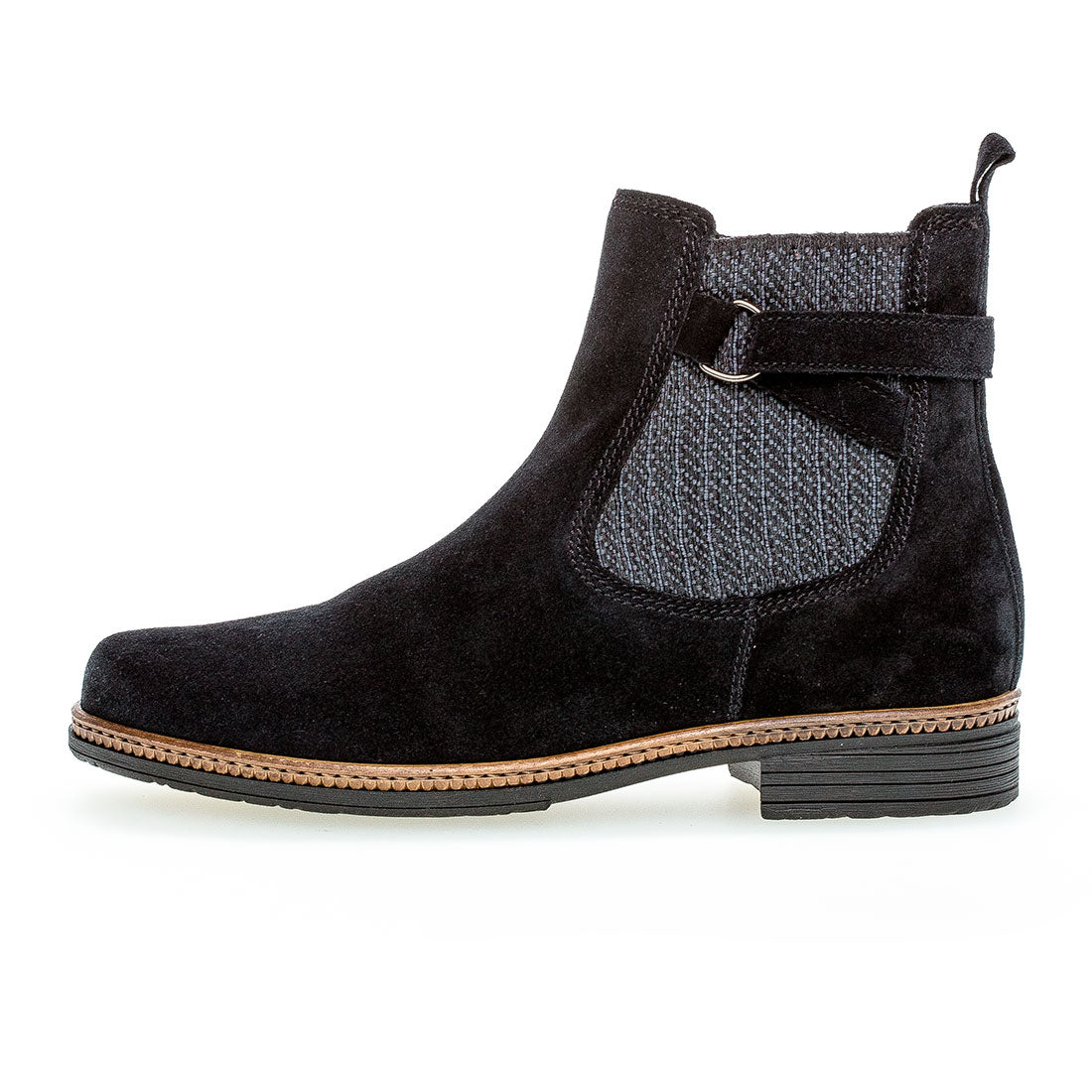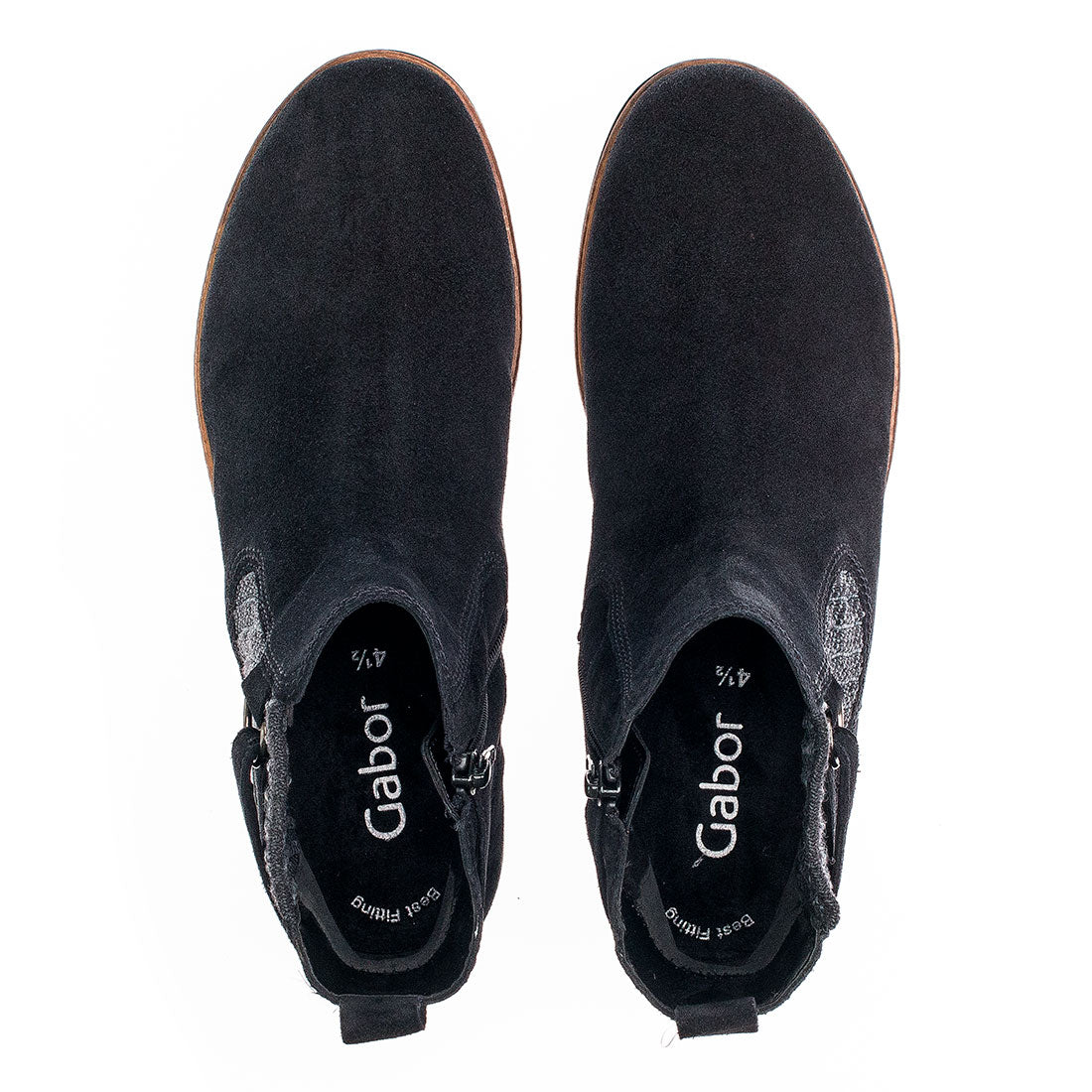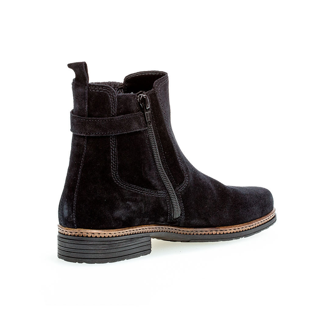 Kort mørkeblå ruskind støvle med elastik på ydersiden og lynlås på indersiden. Gummisål og hæl på 2 cm. Skafthøjde 14 cm. Optifit udtagelig indlægssål. Vidde F + Best Fitting for 2 mm ekstra plads i forfoden/trædefladen. lunt Melange for.
