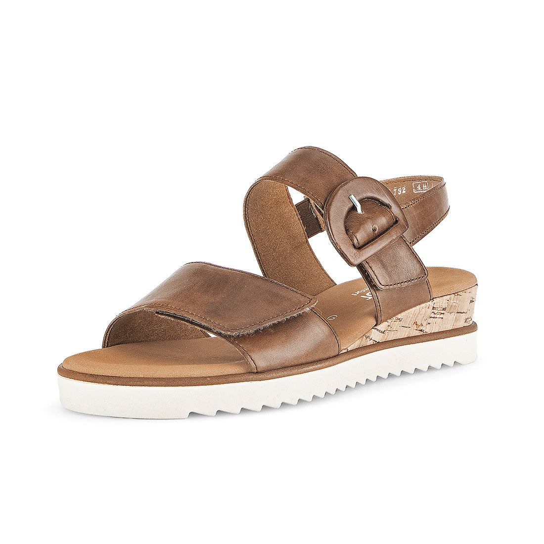 Brun skind sandal med velcrolukning ved vrist og forfod. Brun læderindersål med Comfort vidde G for ekstra bredde. Lav korkkile på 2,5 cm med gummisål.