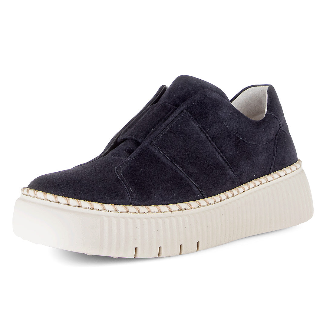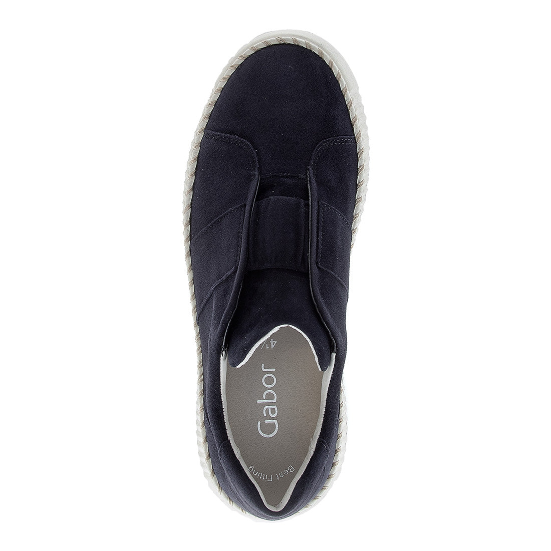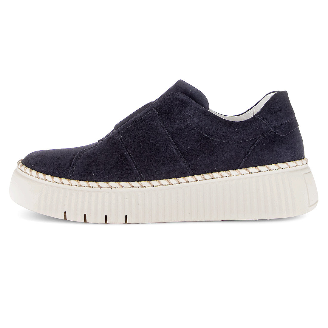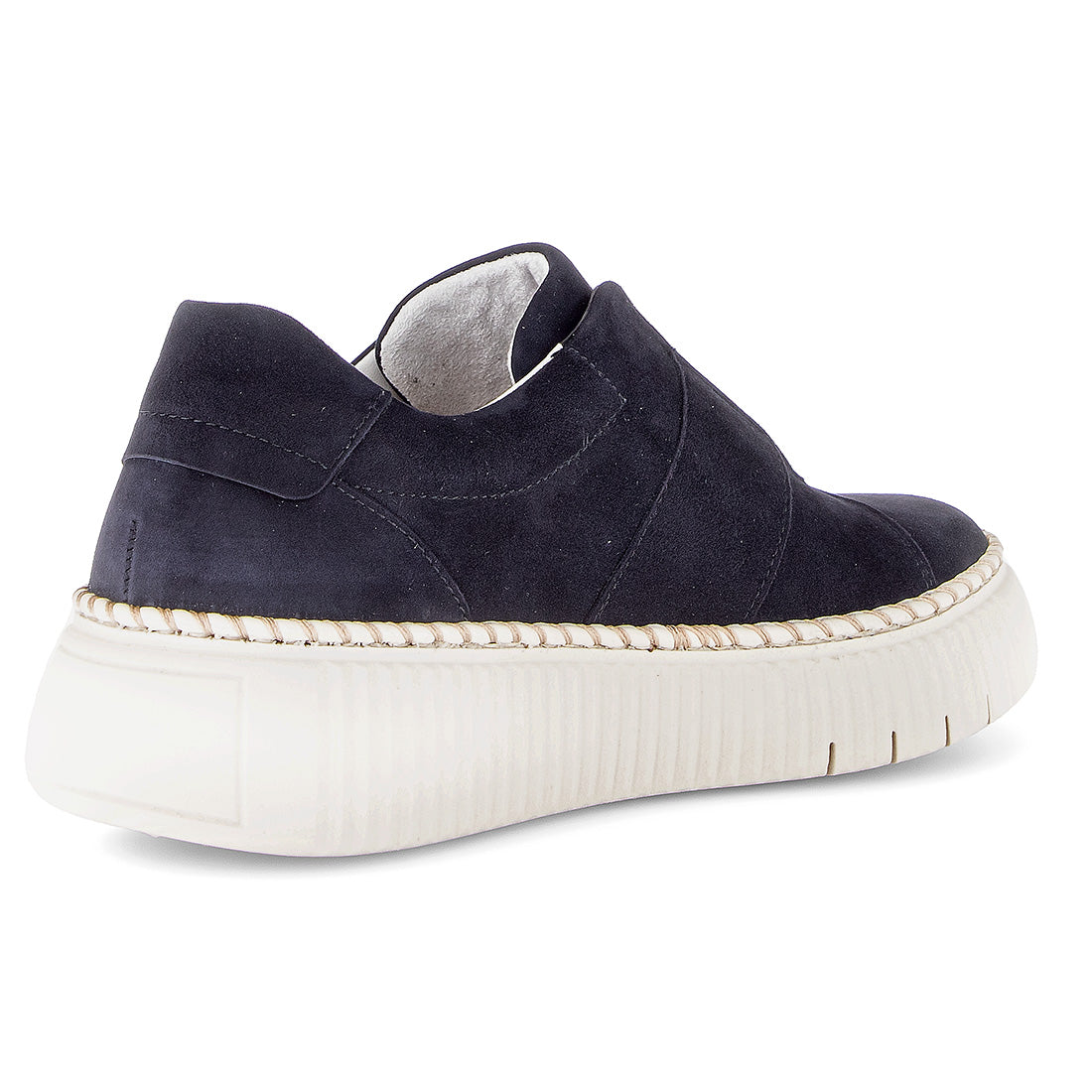Sneaker i mørkeblå ruskind med rynket elastikrem og grå streger omkring sålen. Skoen har Optifit udtagelig læder indlægessål. Best Fitting for 2 mm ekstra bredde i forfoden. Gummisål med høj plateau og kile på 1,5 cm