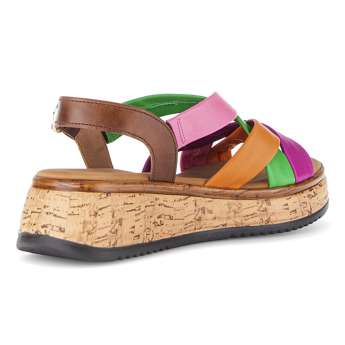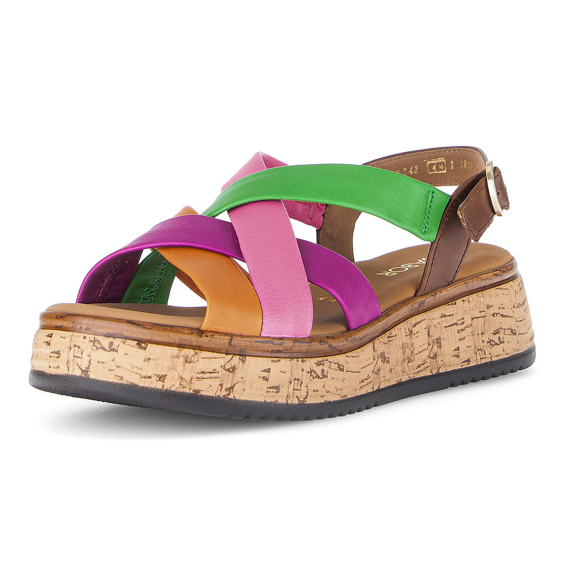 Sandal i flere farver, pink, lilla, orange, grøn og brun skind med remme der krydser. Sandalen lukkes med et spænde på bagremmen. Comfort vidde G. Kork look kilehæl som er 2,5 cm foran og 4,5 cm bag til.