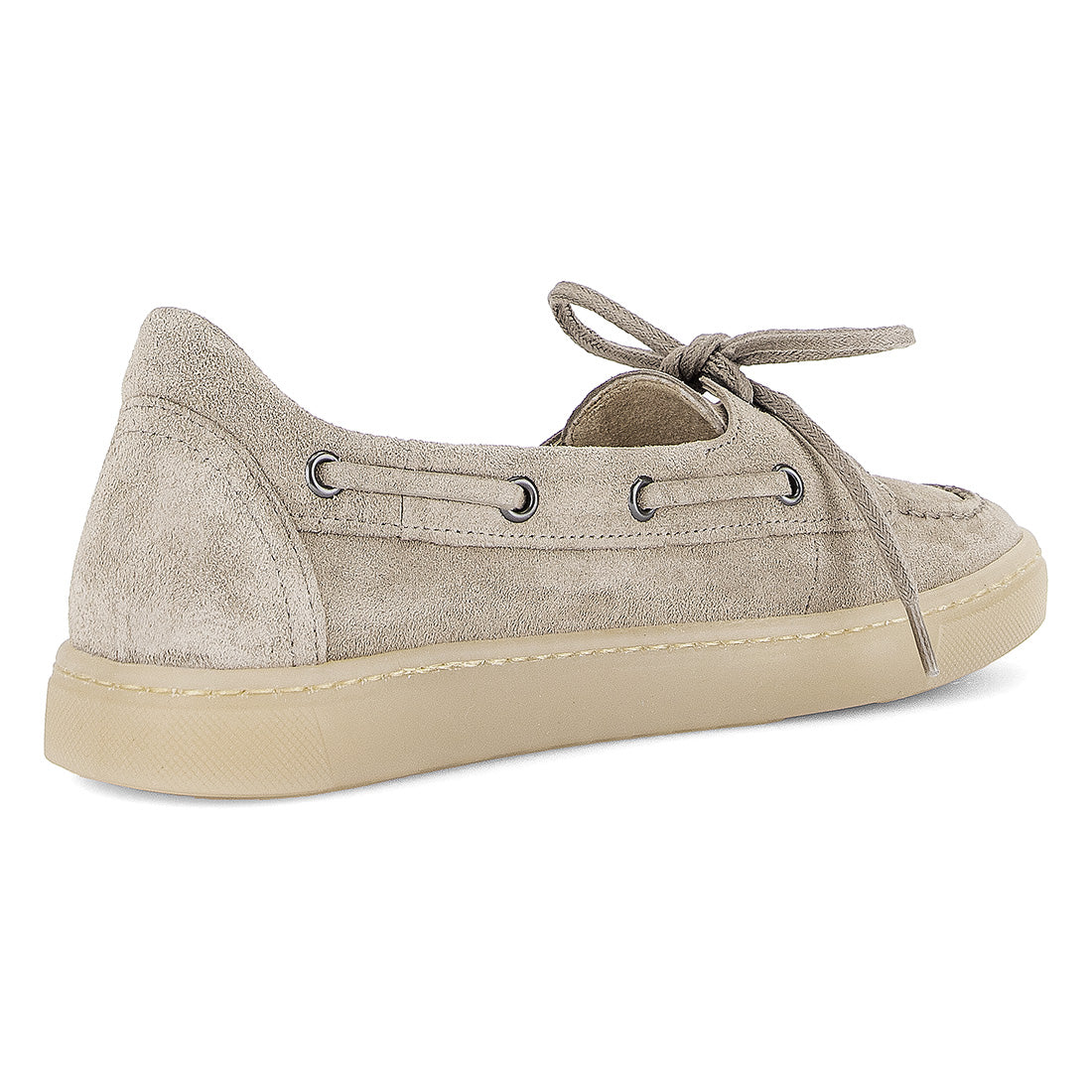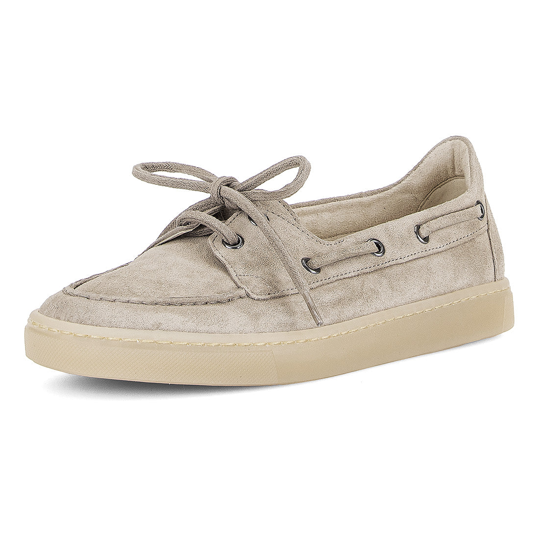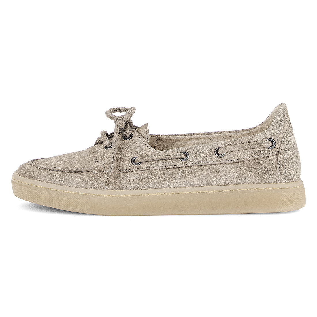Sand ruskind snøresko med sejler look. Lys gummisål med 1,5 cm kile. Skoen har Comfort vidde H og har Optifit udtagelig læder indlægssål.