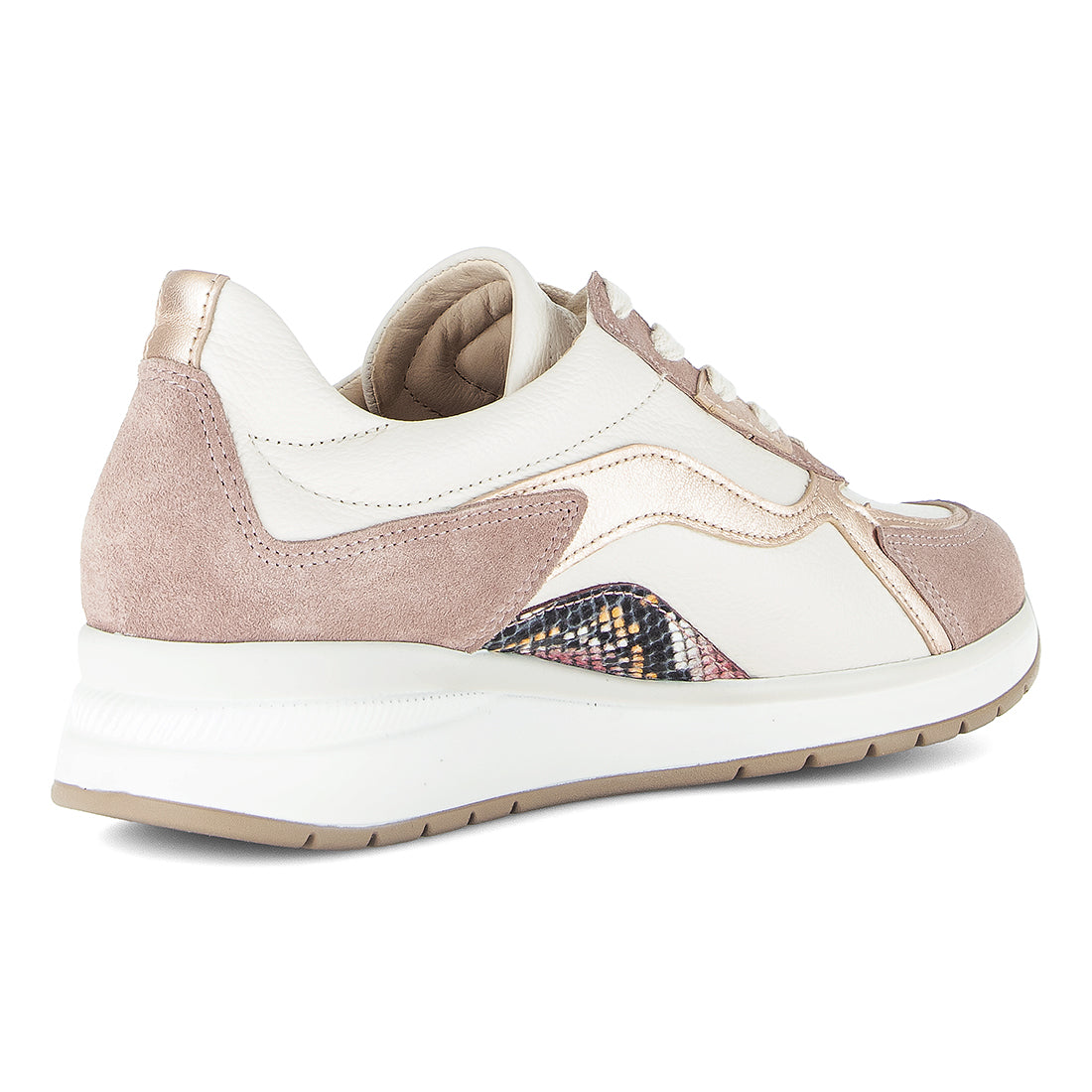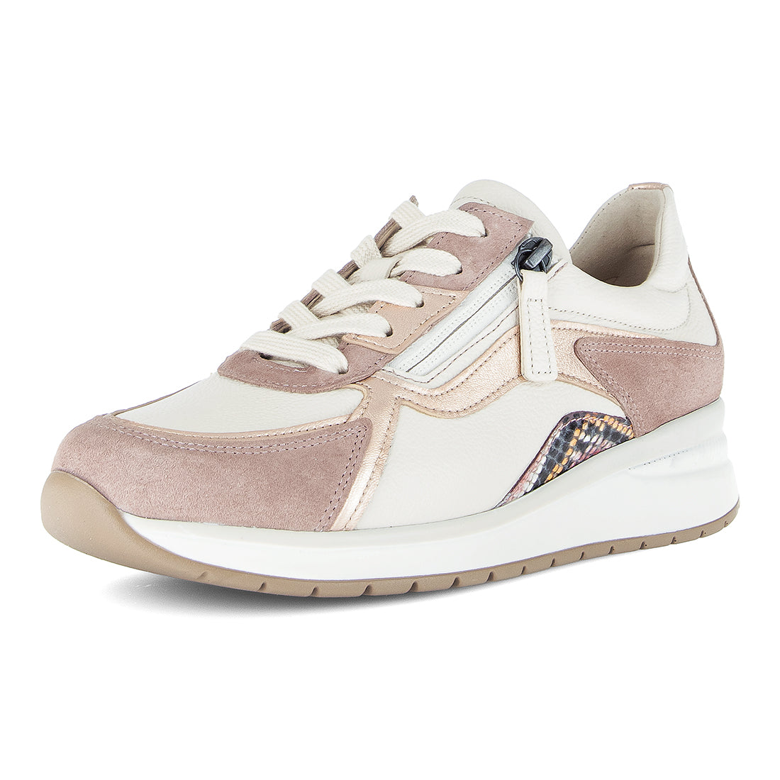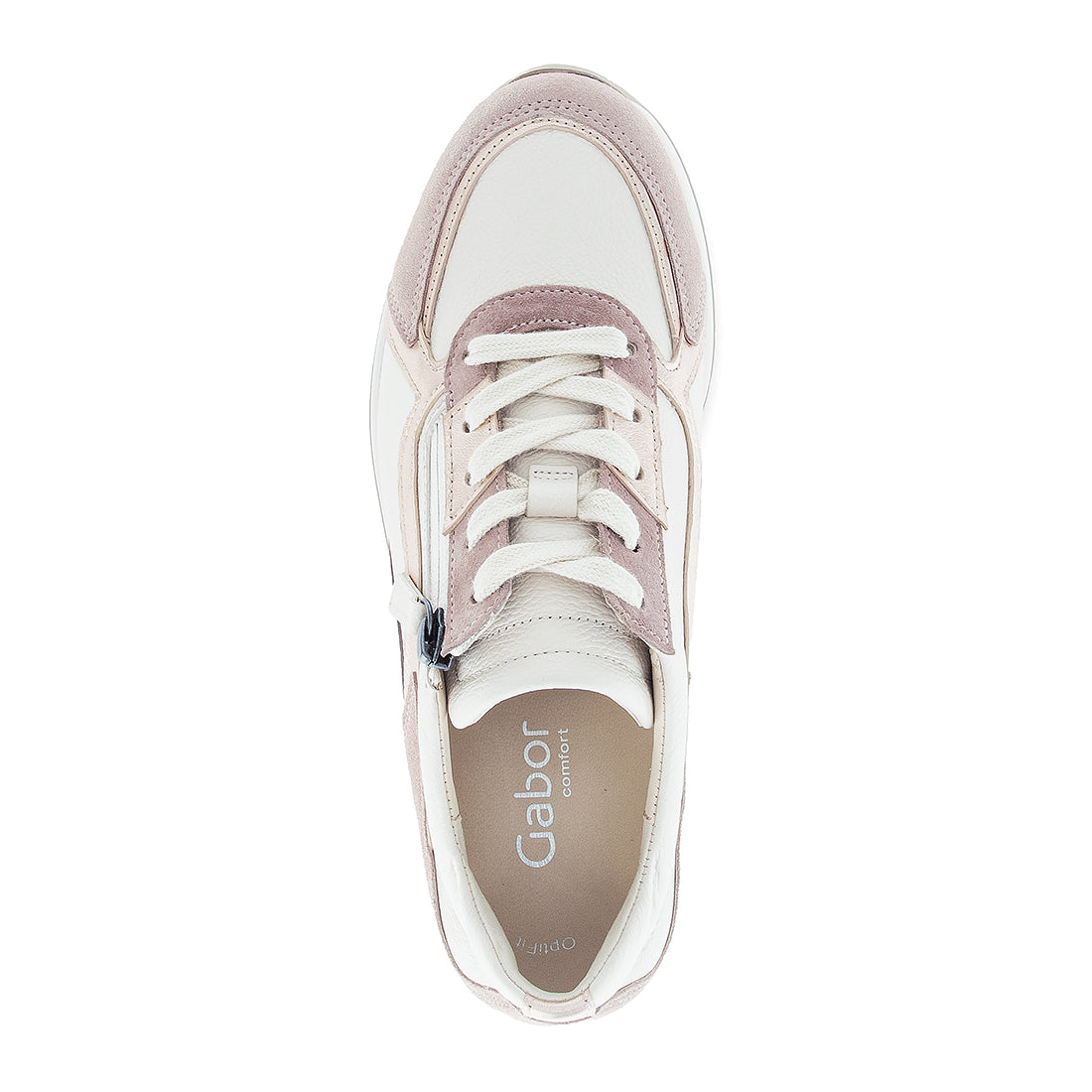 Sneaker i sand skind med rosa ruskind og lidt guld skind. Skoen har snøre og lynlås og har Optifit udtagelig læder indlægessål. Comfort vidde K som er Gabors aller bredeste. Gummisål med kile på 2,5 cm
