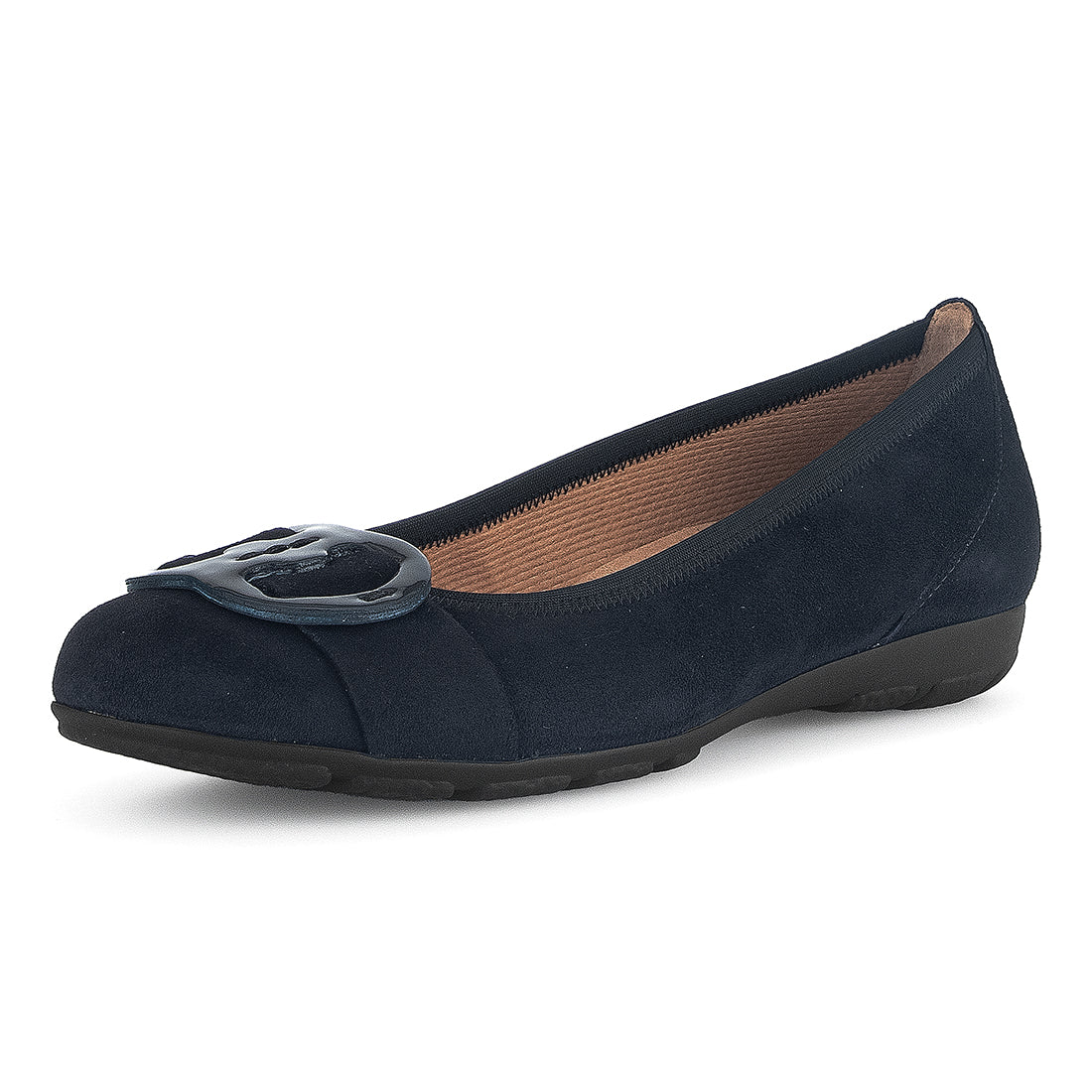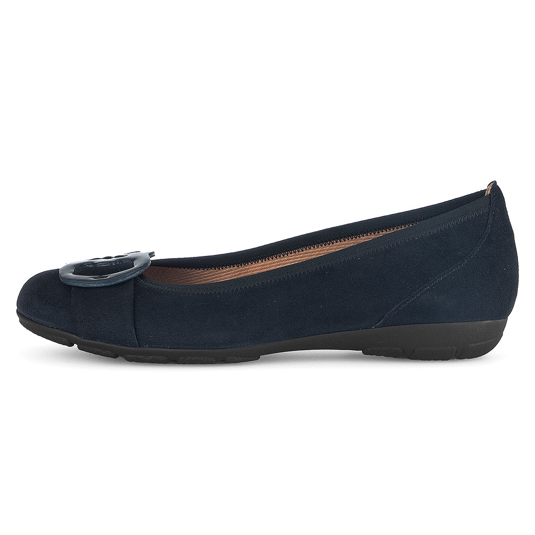 Blå ruskind ballerina med skind betrukket spænde. Let gummisål 2 cm hæl. Almindelig vidde F+ Best Fitting for et par ekstra millimeter plads i forfoden/trædefladen.
