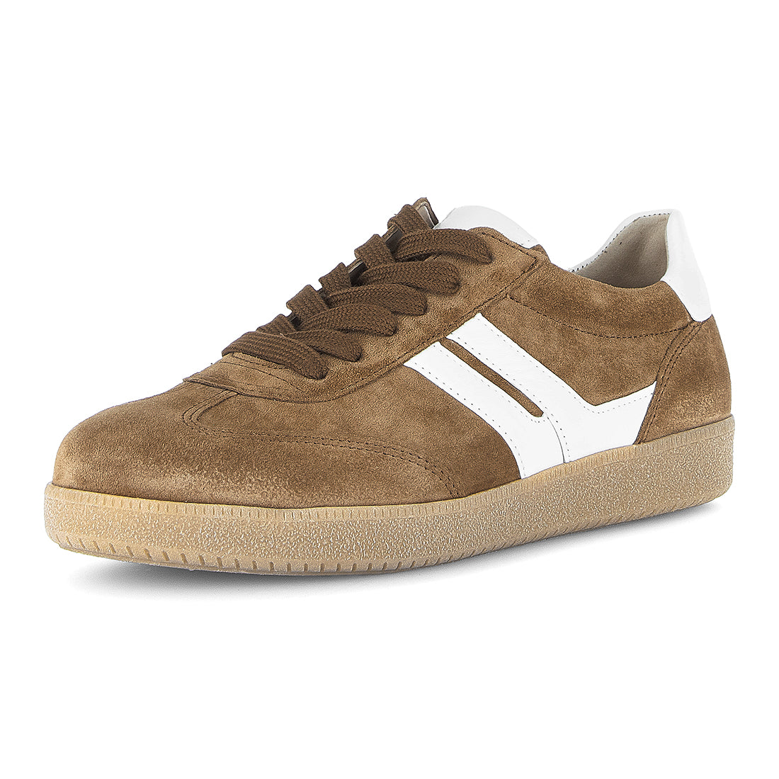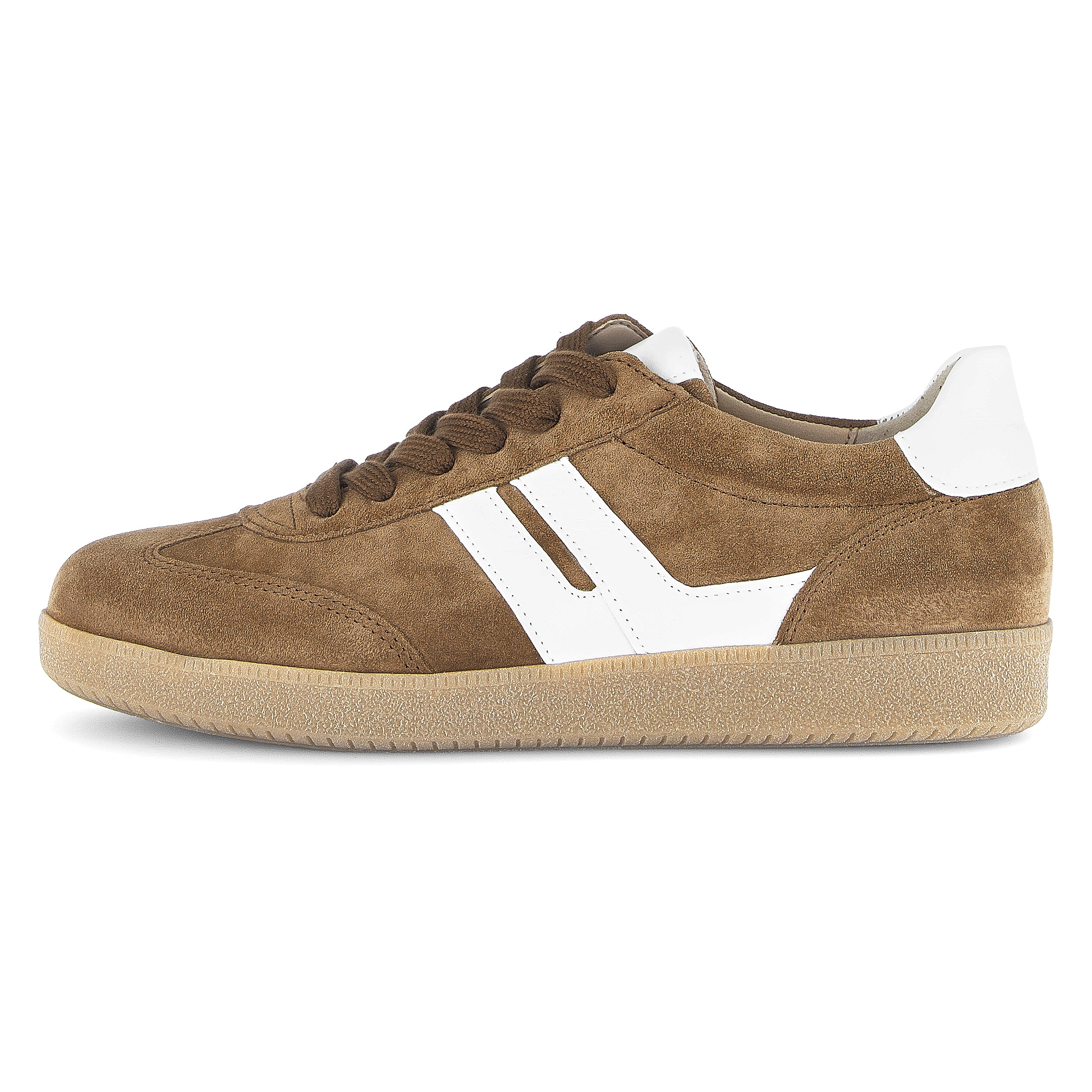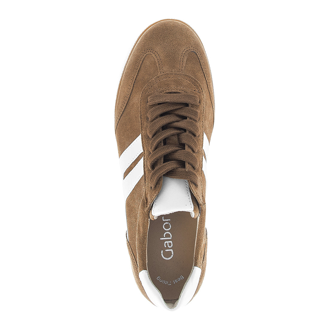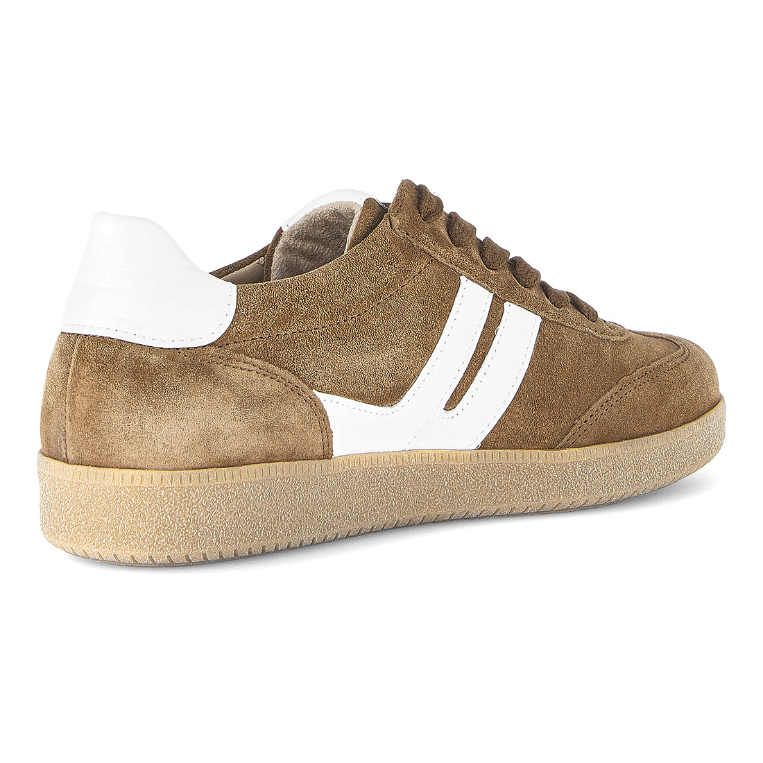 Sneaker i brun ruskind og hvid skind med guld sktriber. Skoen har Optifit udtagelig læder indlægessål. Amindelig vidde F + Best Fitting for 2 mm ekstra bredde i forfoden. Gummisål med kile på 2 cm