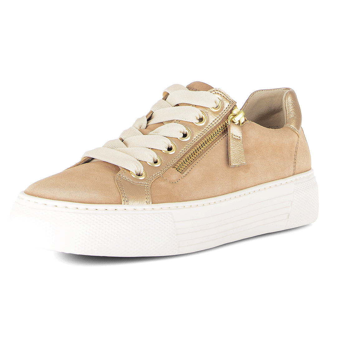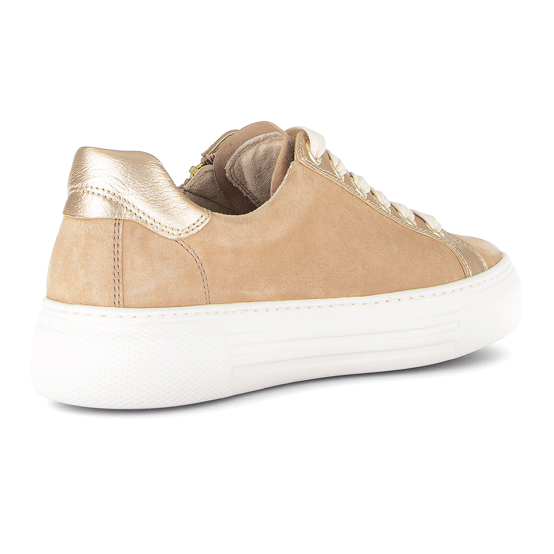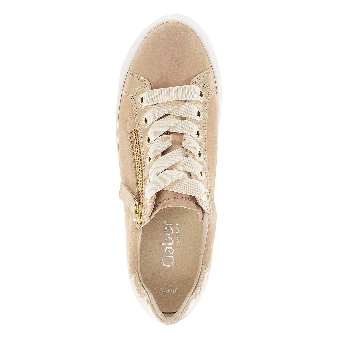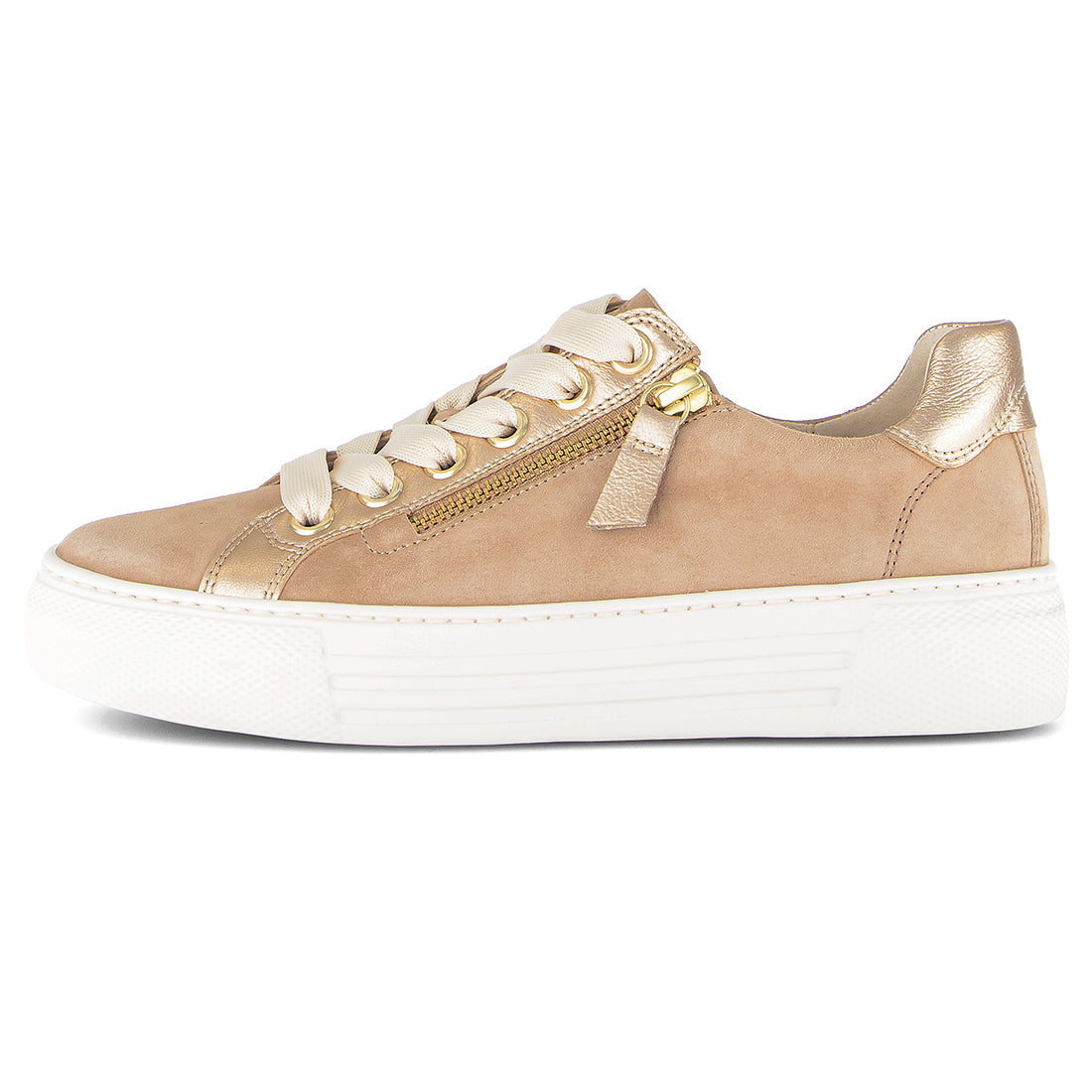 Sand ruskind sneaker med guld skind detaljer. Skoen har lynlås i den ene side og snøre. Optifit udtagelig læder indersål med Comfort vidde G og let frotte for indvendigt.. Hvid gummisål med kile på 1,5 cm.