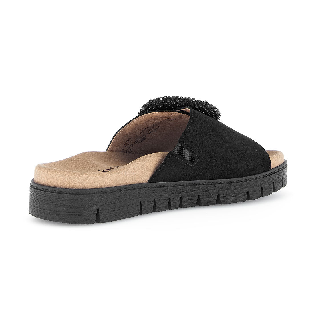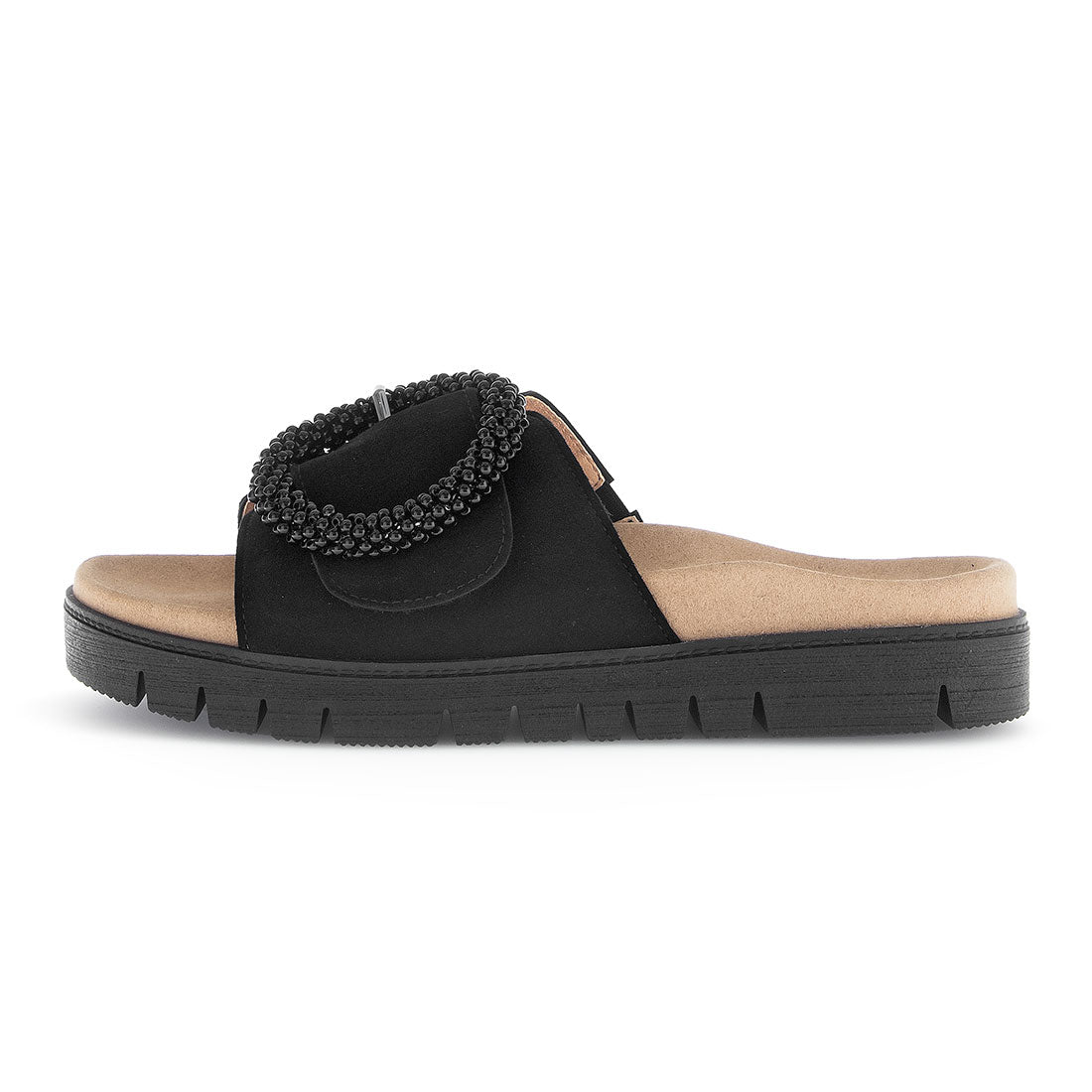 Sort ruskind sandal / mules med velcrorem og rundt spænde . Let at smutte i med Amindelig vidde F + Best Fitting for et par ekstra millimeter plads i forfoden. Sandalen har god anatomisk formet indersåler som støtter godt. Kilehæl 1 cm