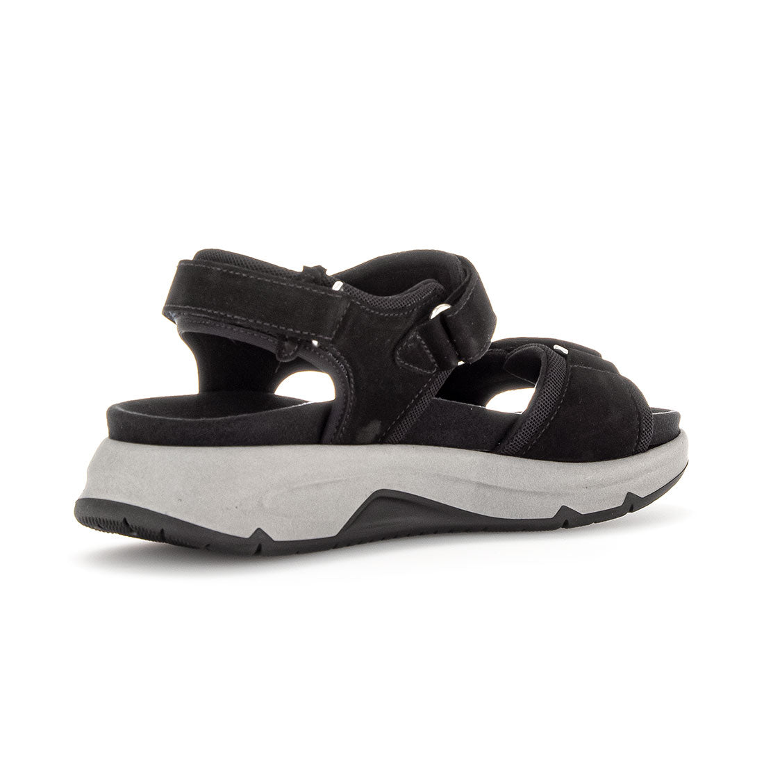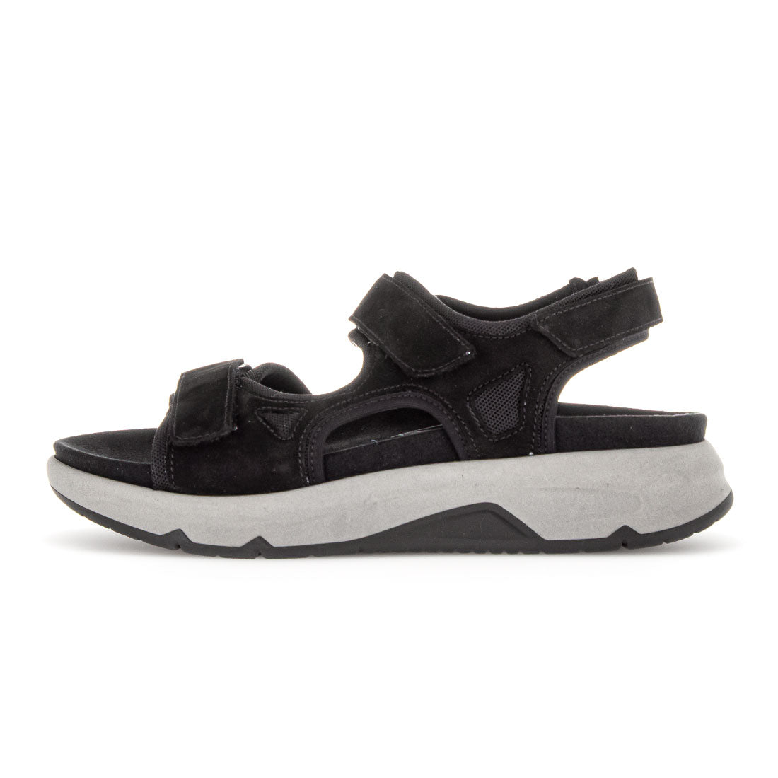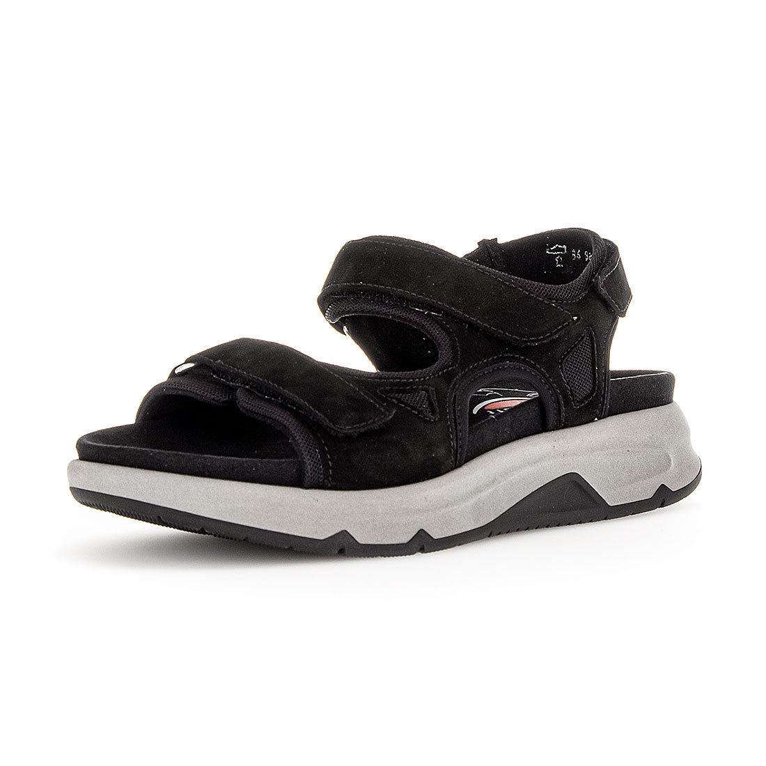 Sort nubuck sandal med velcro lukning over vristen og foran. Optifit udtagelig indersål med Comfort vidde G. Gummisål med kile 1,5 cm. Rollingsoft er stødabsoberende og sålens bue understøtter fodens naturlige bevægelse.