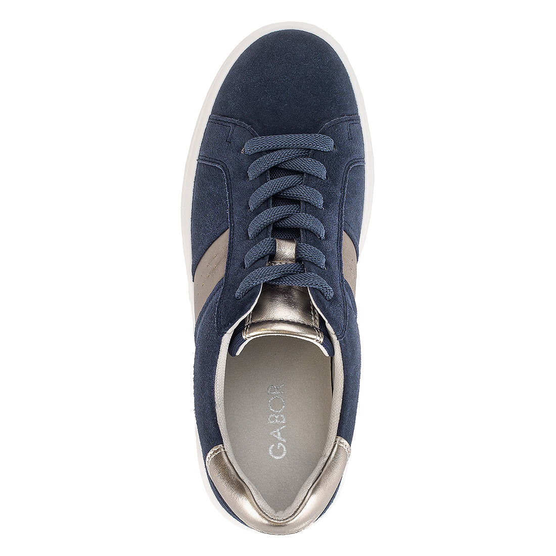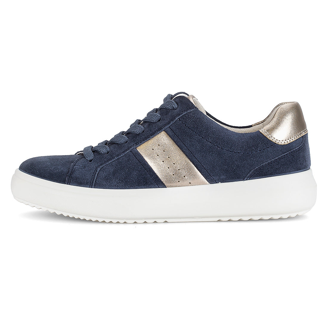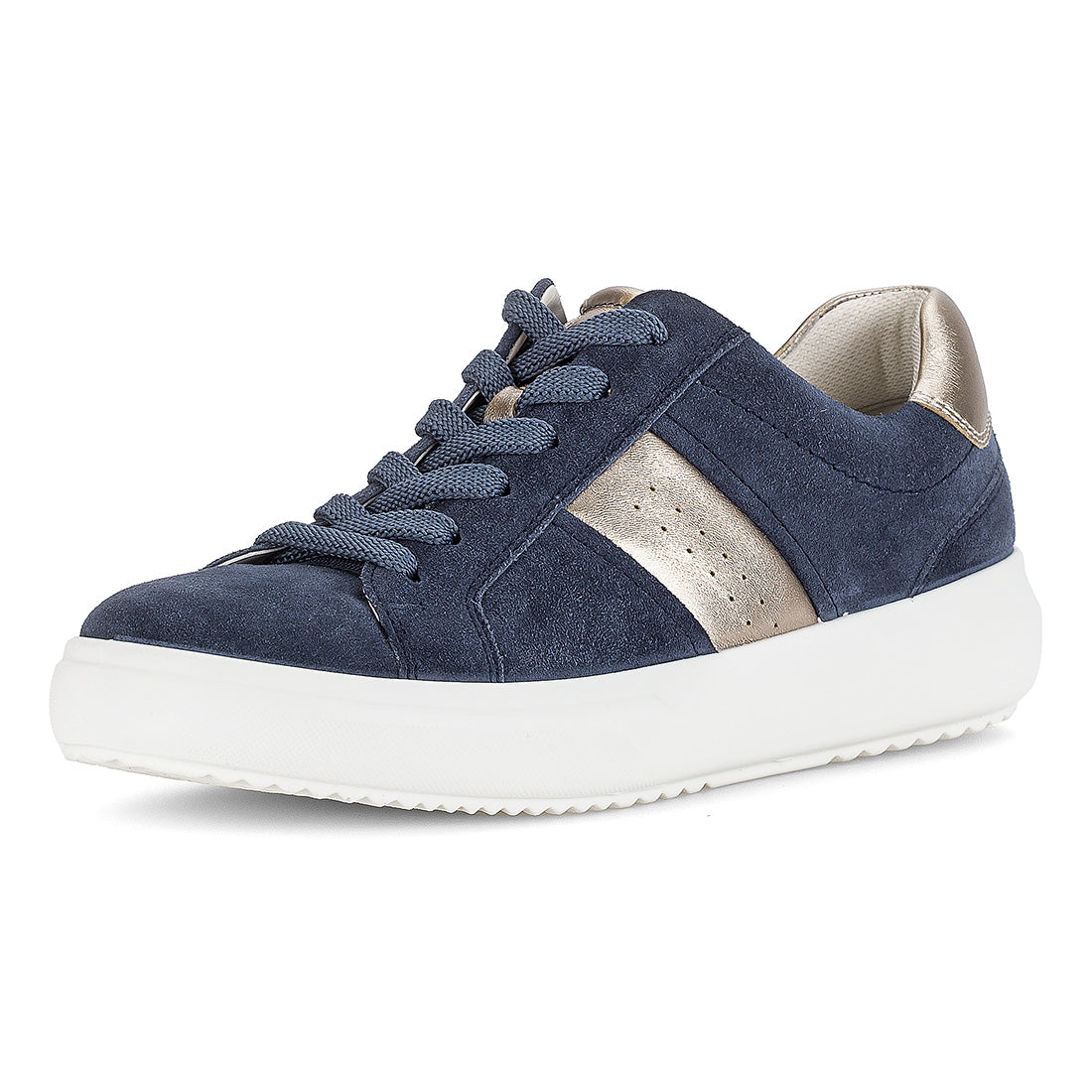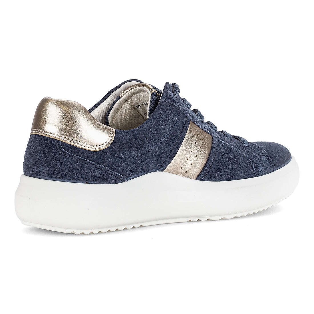 Sneaker i blå ruskind med guld skind . Skoen har Optifit udtagelig læder indlægessål. Amindelig vidde F + Best Fitting for et par millimeter ekstra plads i trædefladen. Gummisål med kile på 1 cm