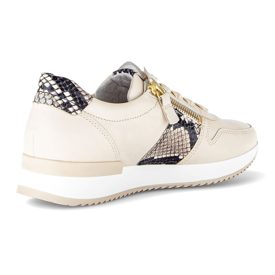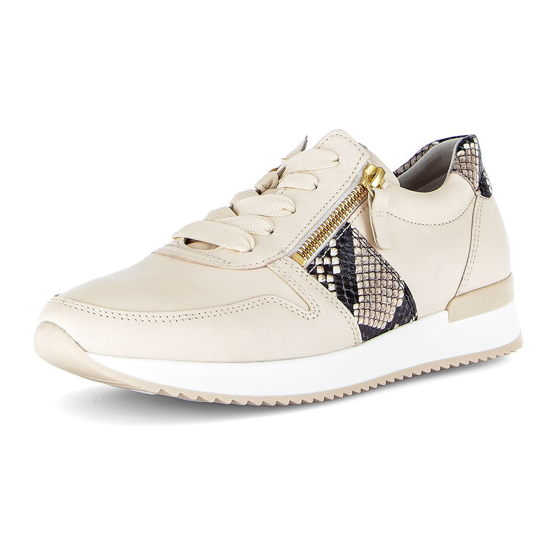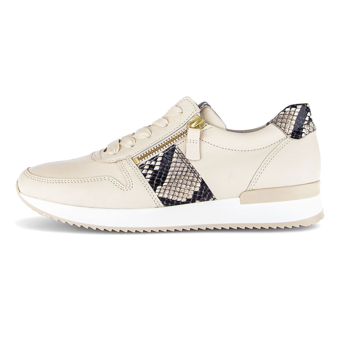 Flot creme skind sneaker med dyreprint stribe i siden + på hælen. Skoen har snøre og lylås i siden, er med gummisål og skindforet indvendig og med udtagelig indlægessål. Best Fitting for 2 mm ekstra bredde i forfoden.