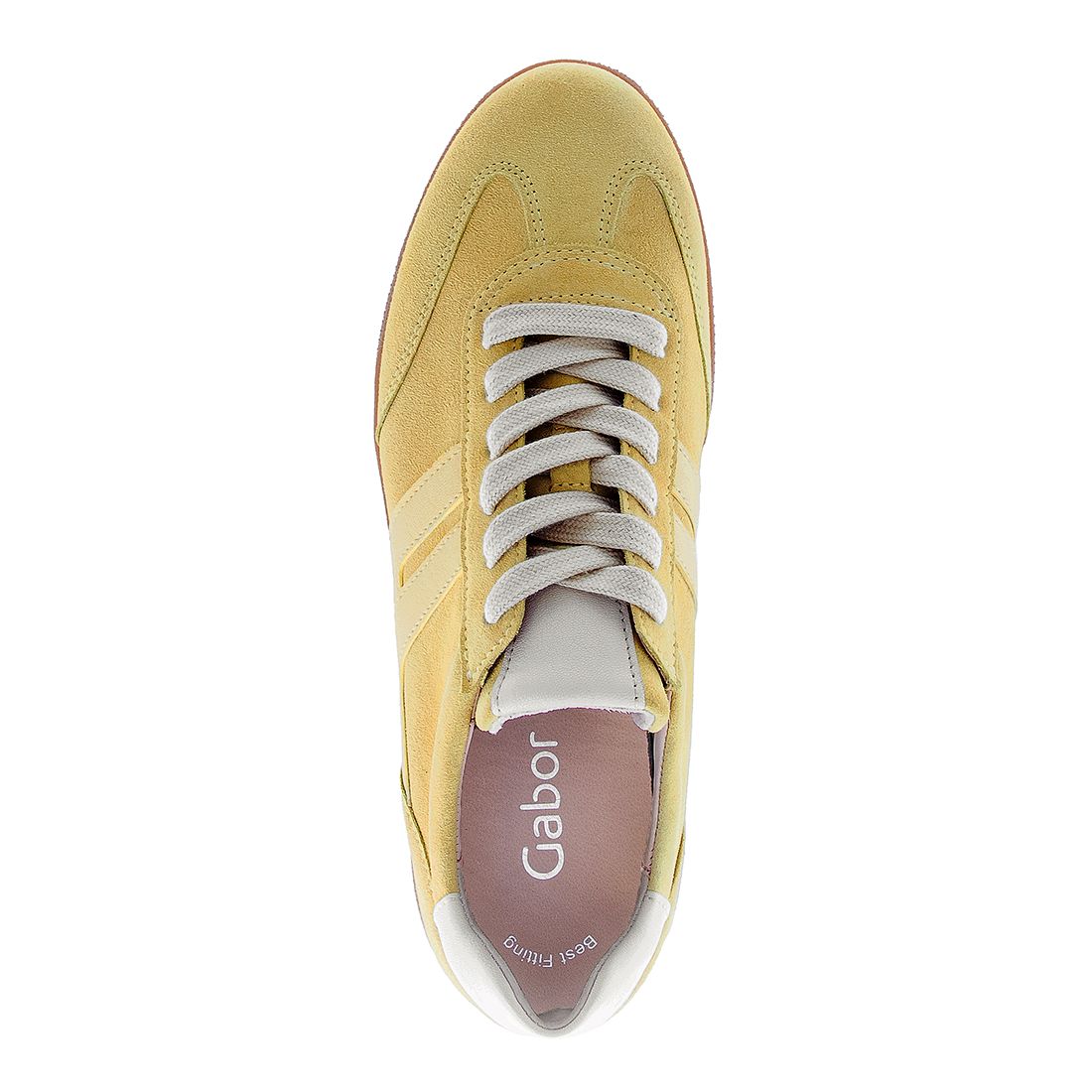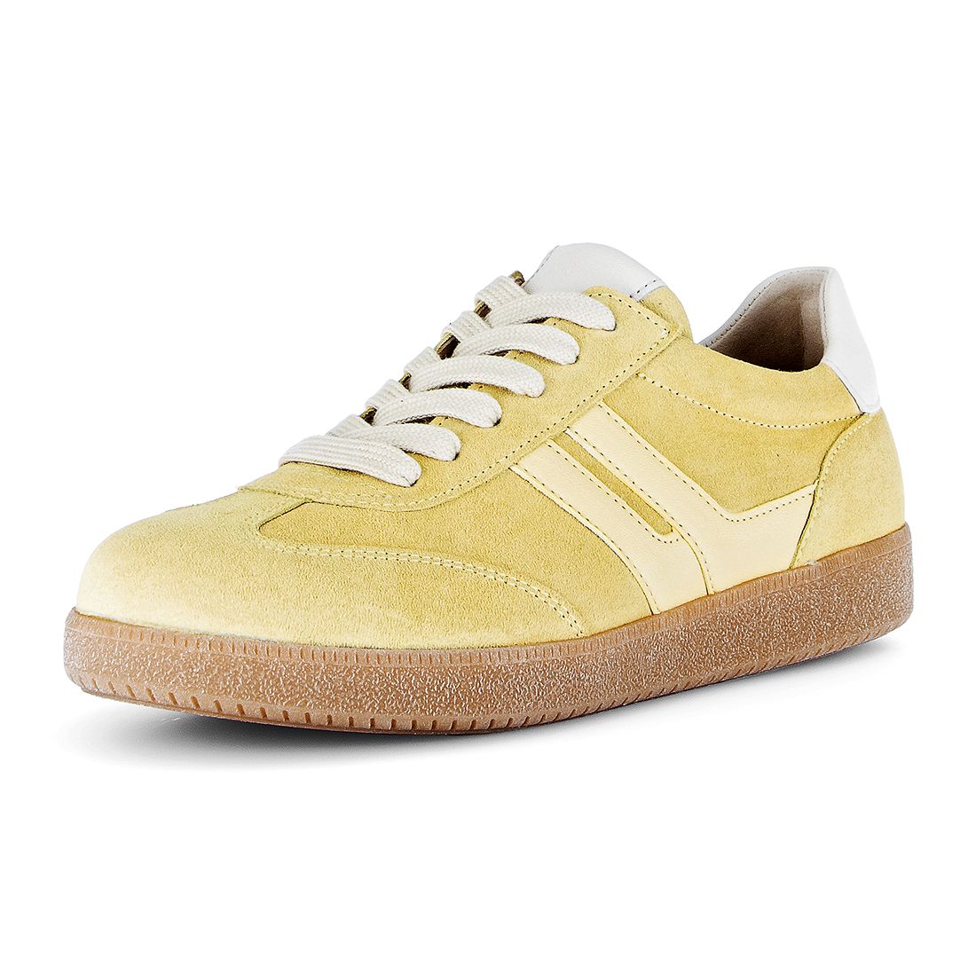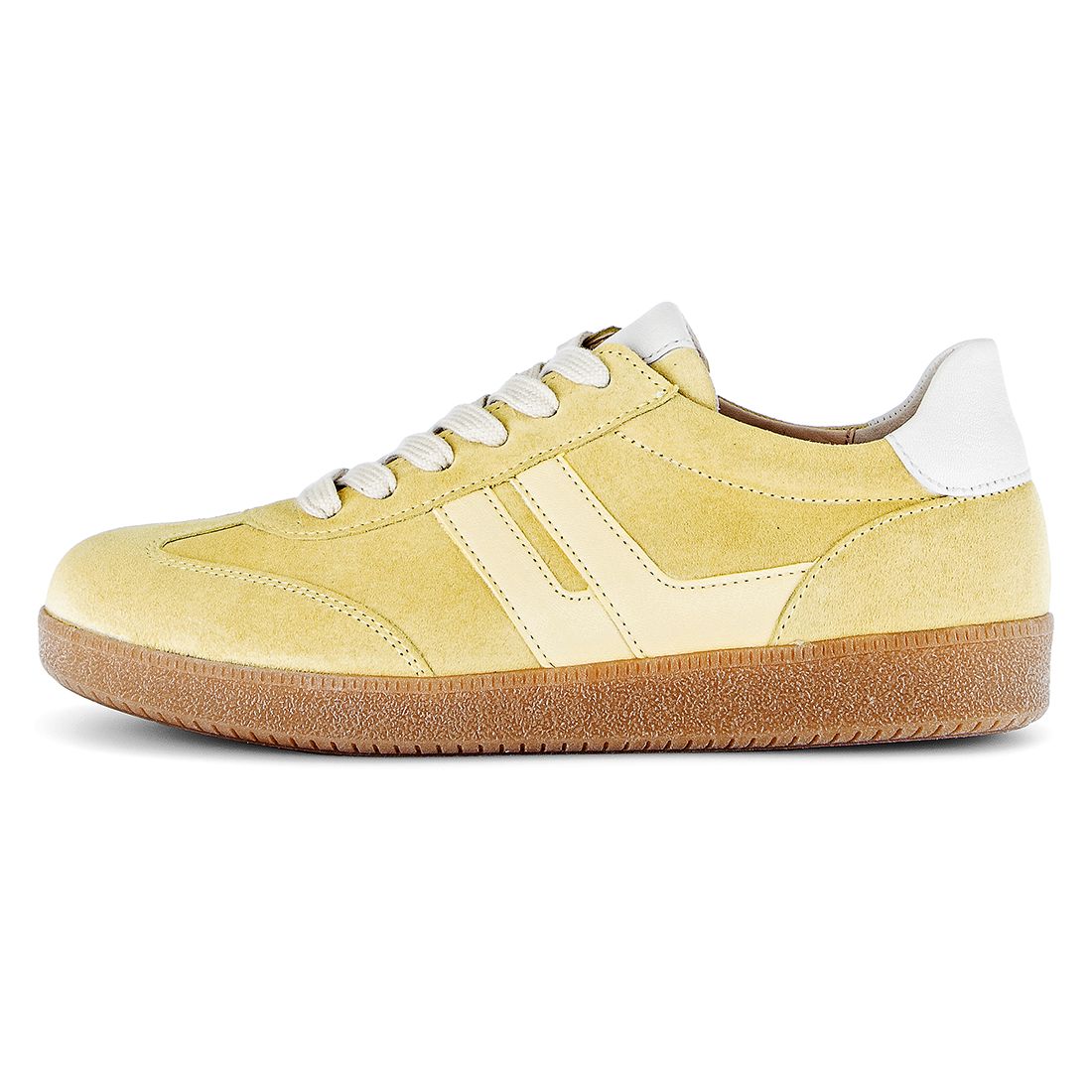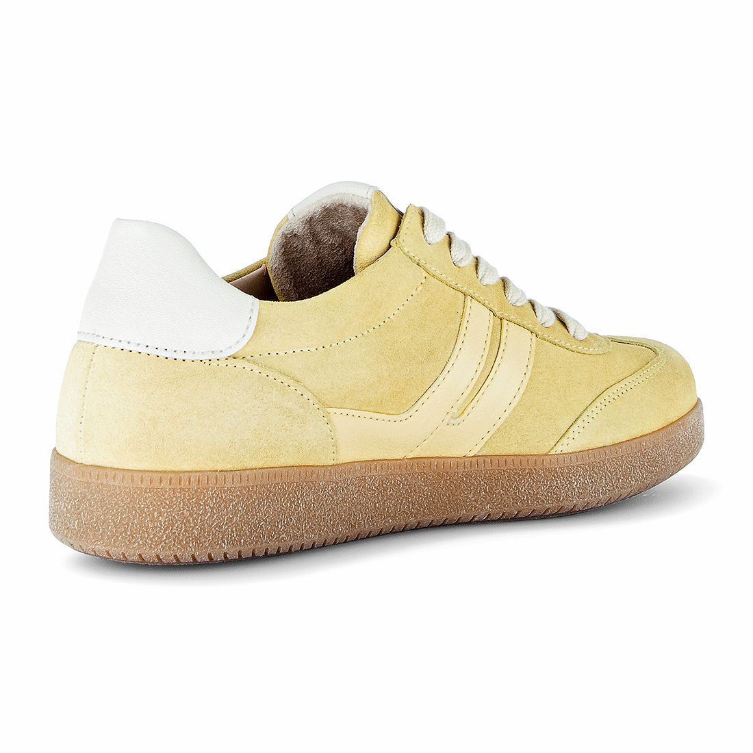 Sneaker i Lysegul ruskind og hvid skind med guld sktriber. Skoen har Optifit udtagelig læder indlægessål. Amindelig vidde F + Best Fitting for 2 mm ekstra bredde i forfoden. Gummisål med kile på 2 cm