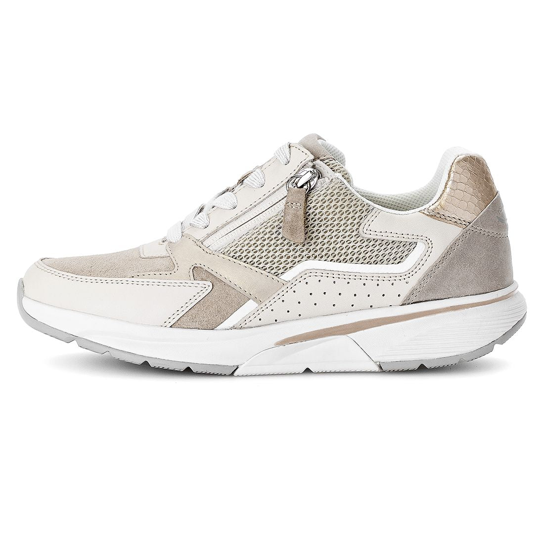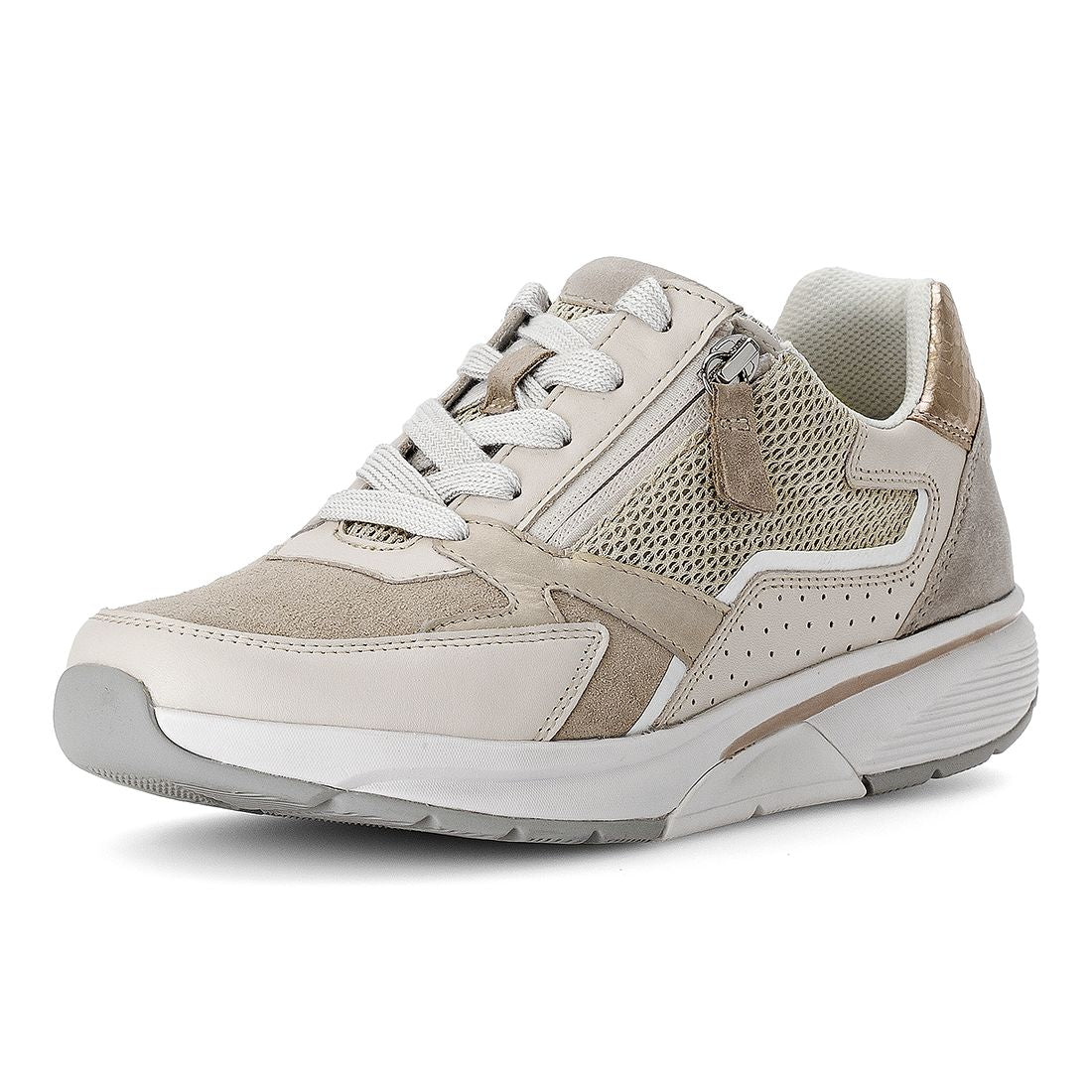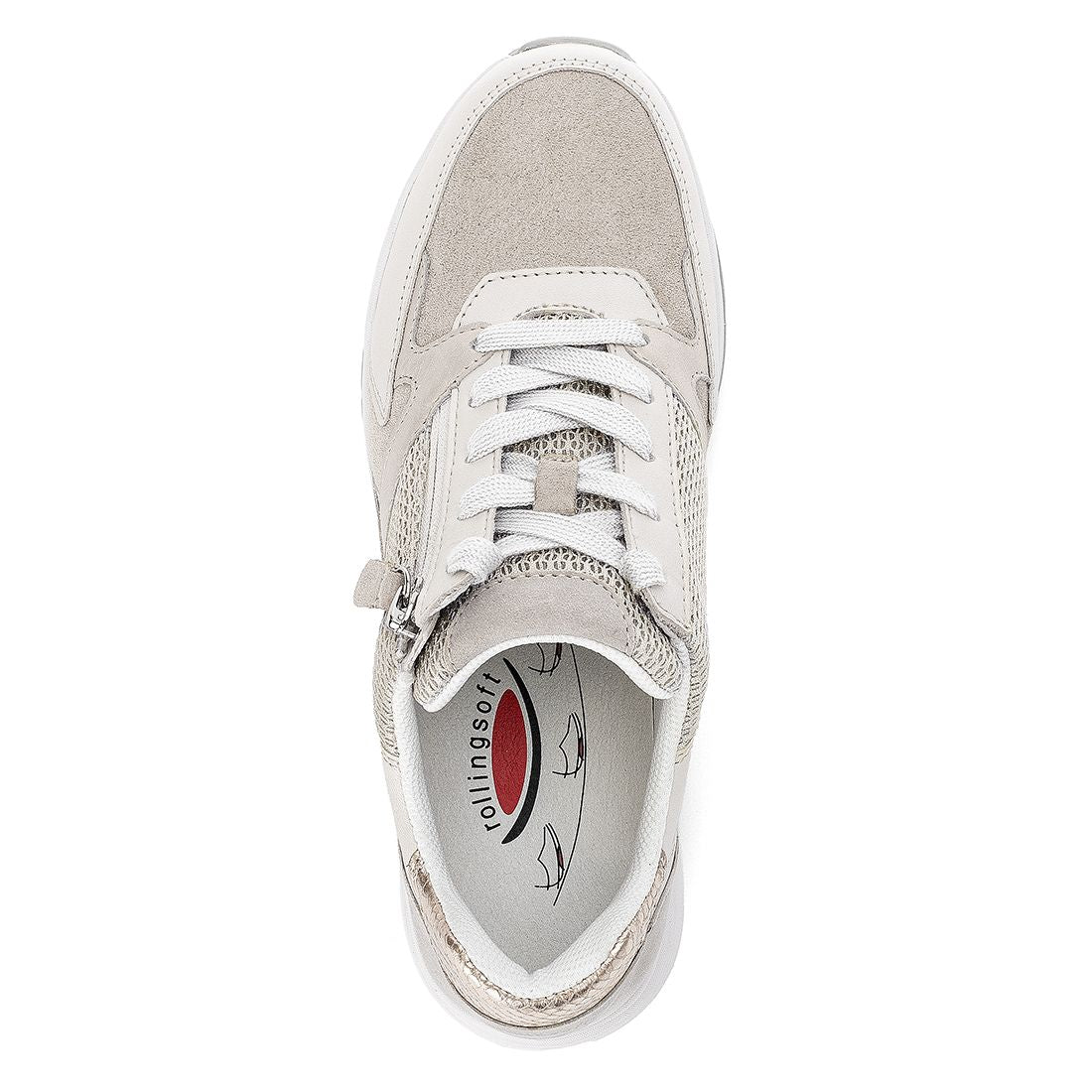 Sneaker i creme skind + beige ruskind med snøre + lynlås. Optifit udtagelig sål med Comfort vidde G. Gummi kile på 1,5 cm. Rollingsoft er stødabsorberende og sålens bue understøtter fodens naturlige bevægelse. Aflaster op igennem ben og ryg.