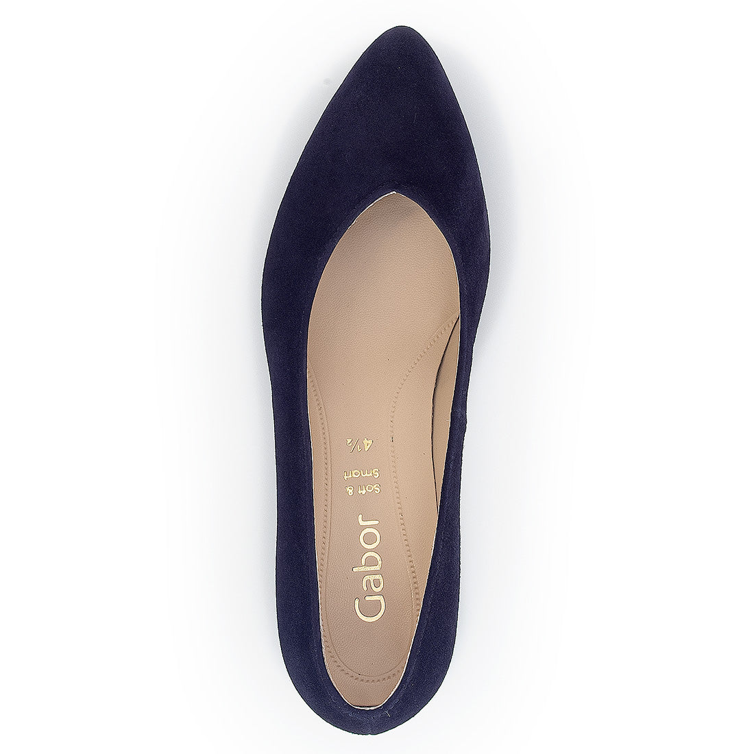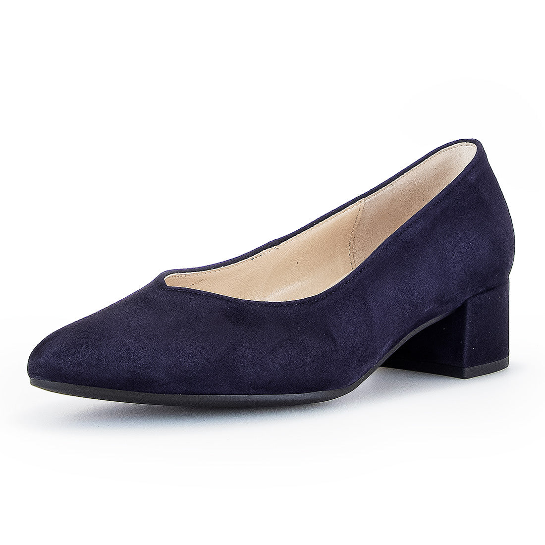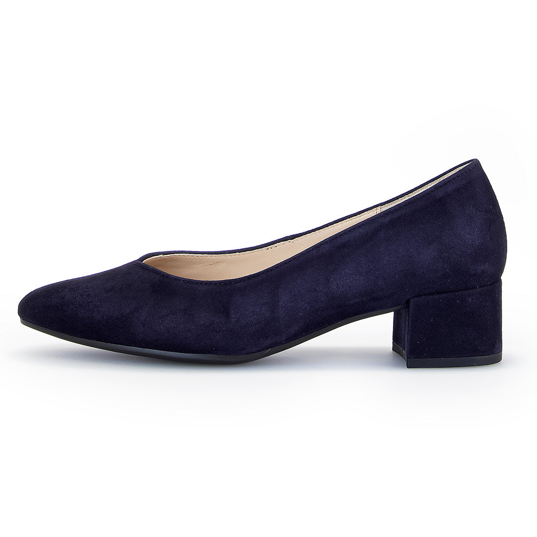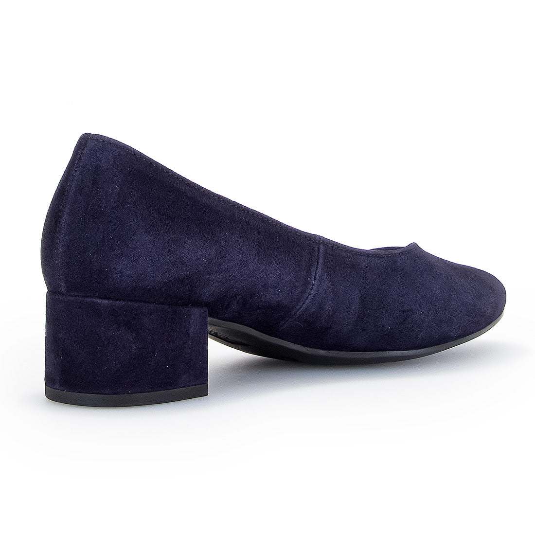 Atlantik blå ruskind pump. Normal vidde F. Lav betrukket hæl på 4 cm. Gummisål.