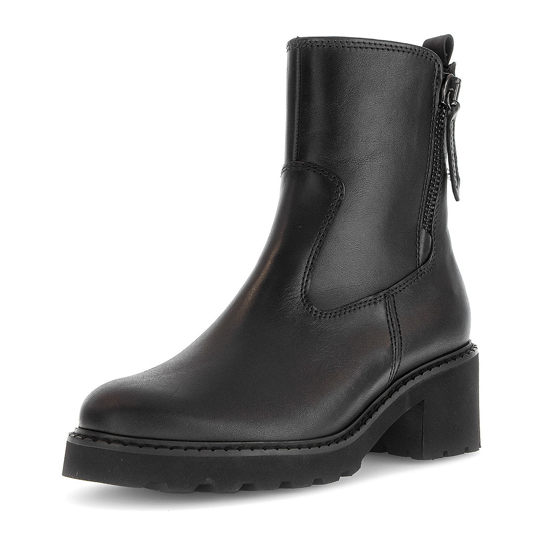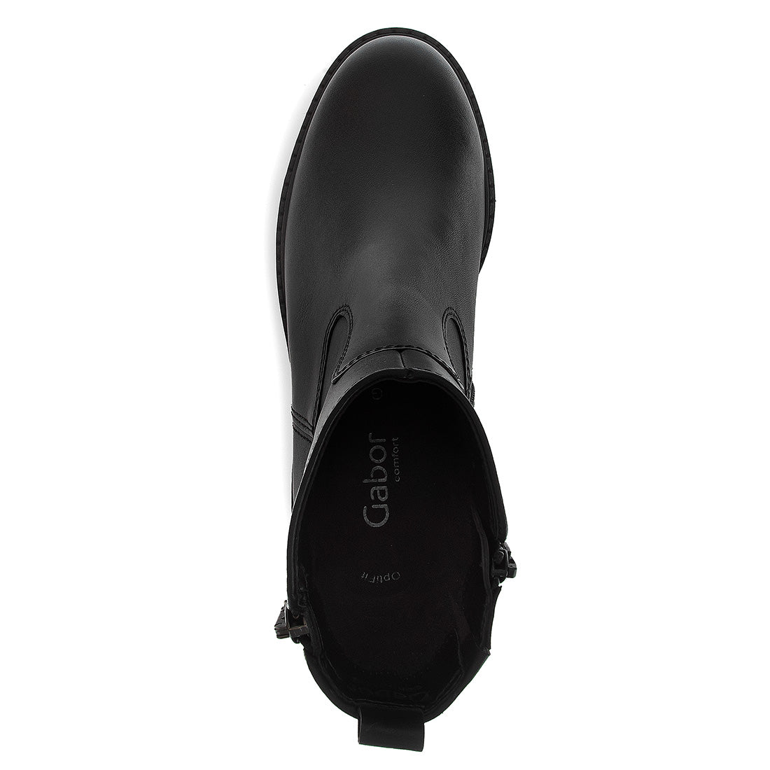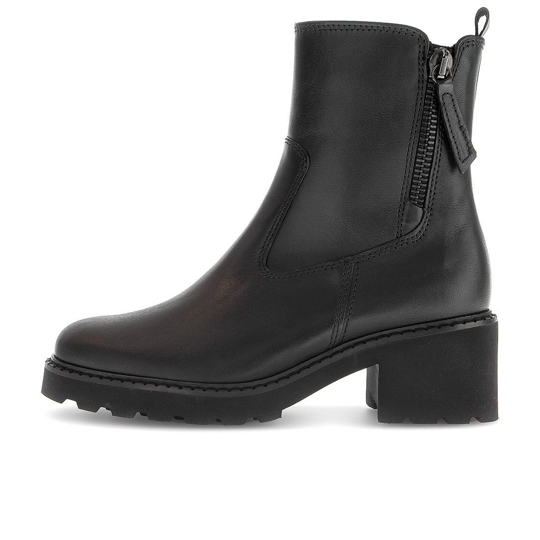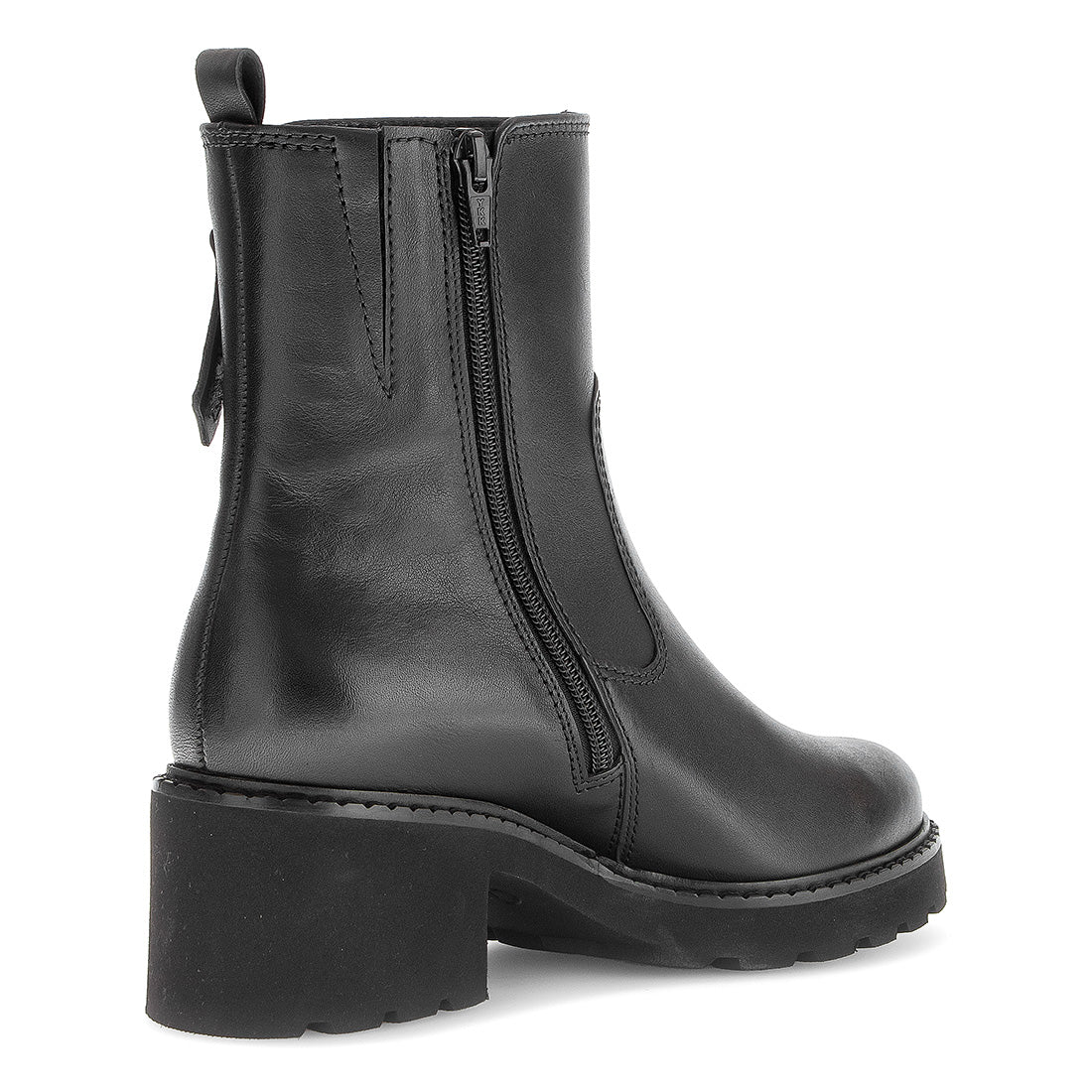 Sort skind støvle med lynlås på indersiden og pynte lynlås på ydersiden. Comfort vidde G og har Optifit udtagelig indlægssål. Støvlen har kraftig hæl på 4 cm og tyk sål. Skaft højde 18 cm