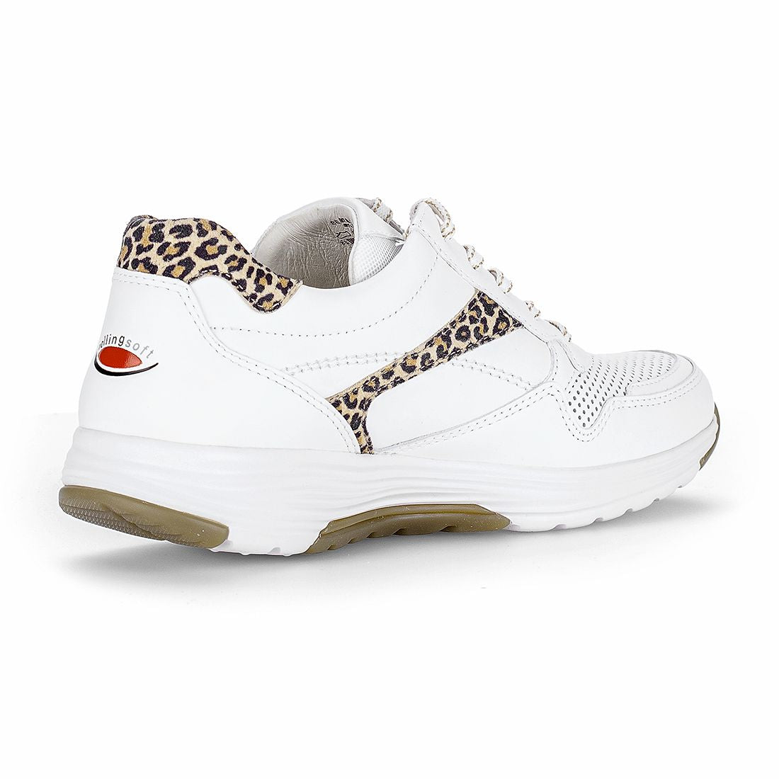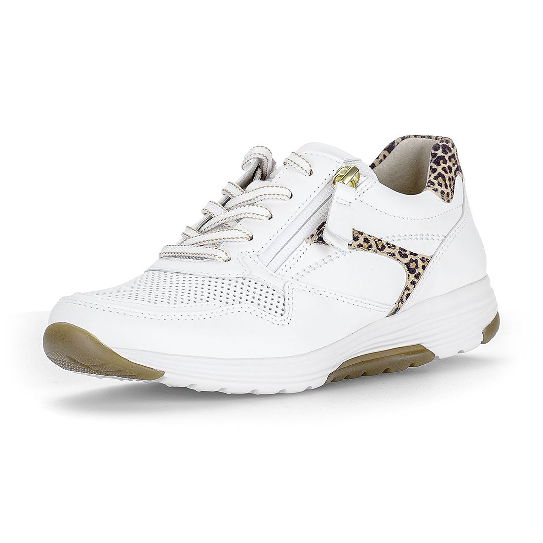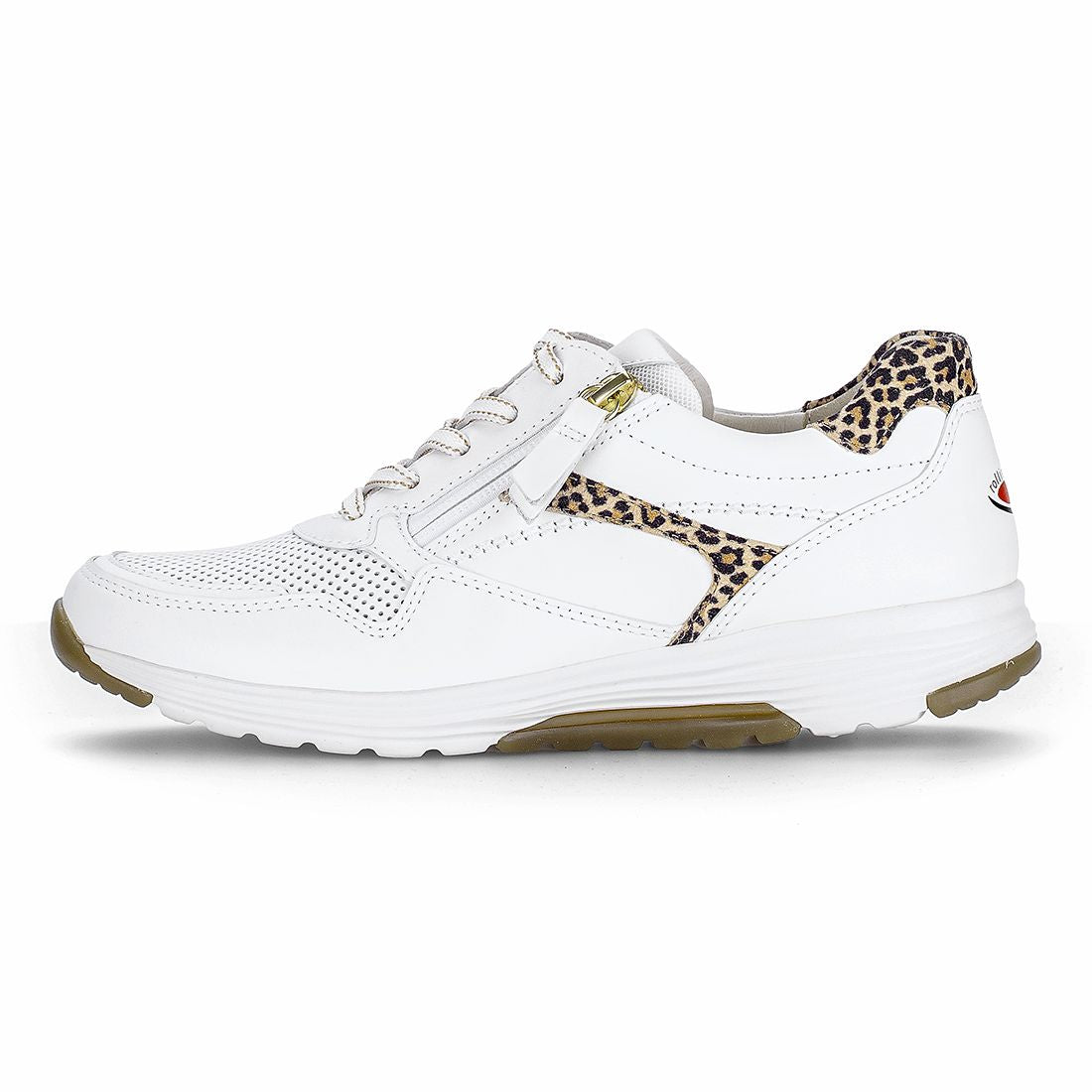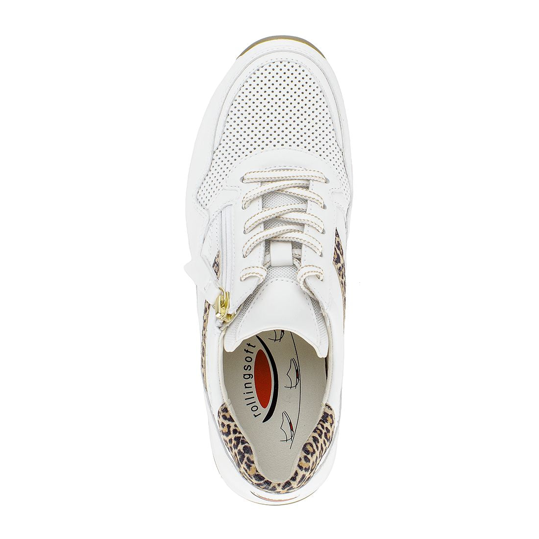 Hvid skind sneaker med leo detaljer , snøre og lynlås.Optifit udtagelig indersål i læder og lys kile på 2 cm. Rollingsoft er stødabsorberende og sålens bue understøtter fodens naturlige bevægelse. Aflaster op igennem ben og ryg.
