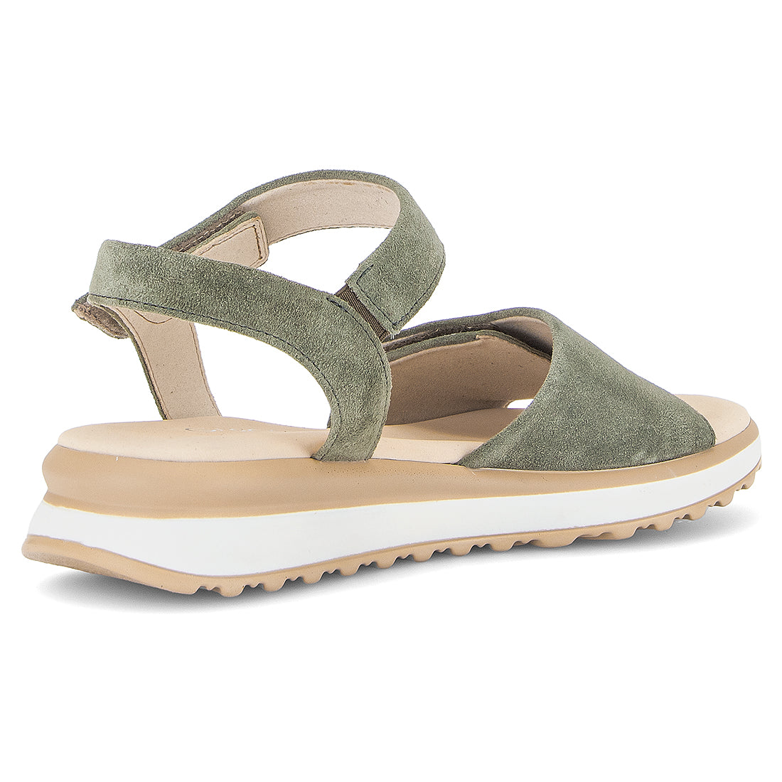 Grøn ruskind sandal med velcro lukning over vristen og foran. Lys læder sål med Comfort G, lidt mere bredde og volumen i tåen, forfod og vristområde. Kile på 1,5 cm. Gummisål
