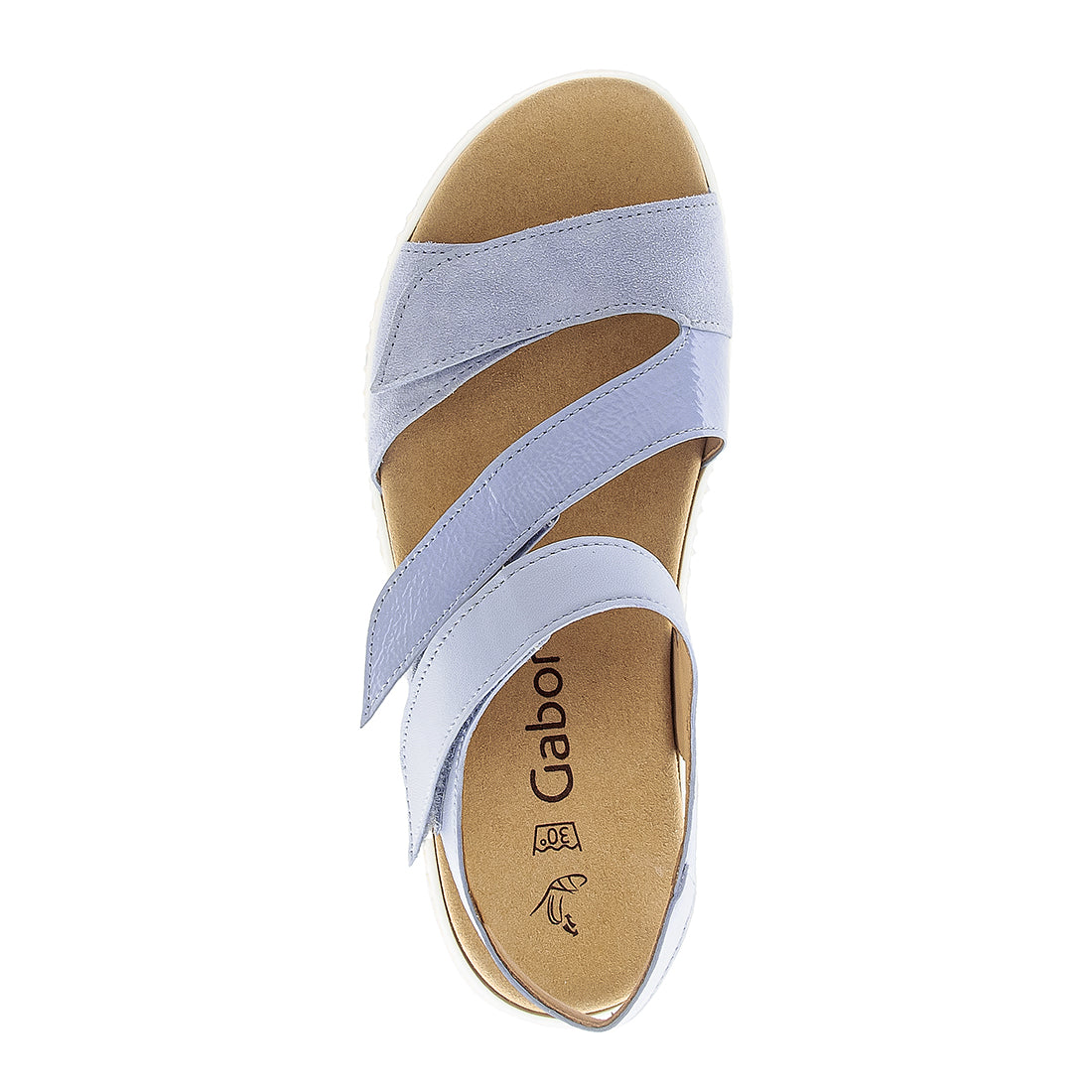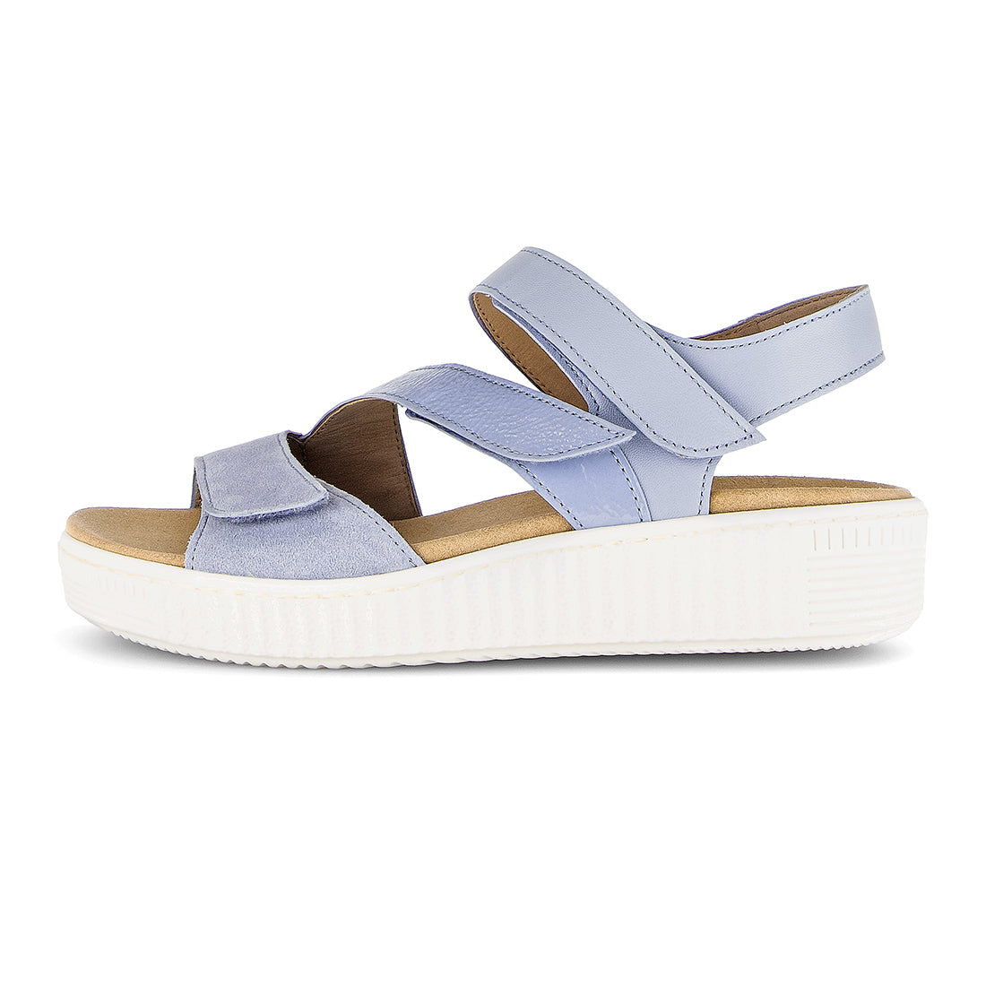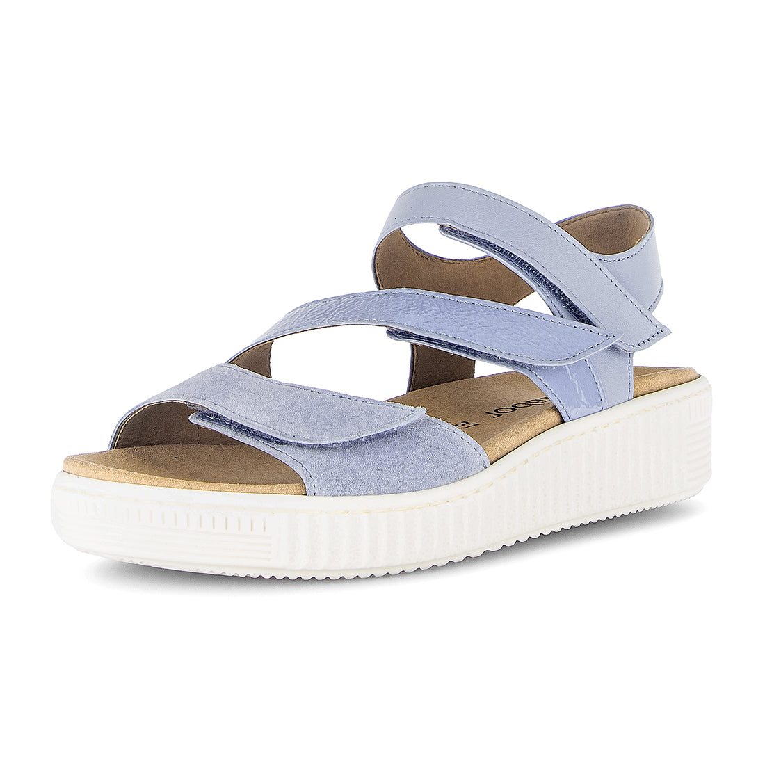 Lyseblå ruskind, skind og lak sandal med 3 velcro remme over foden. Med udtagelig Optifit indlægssål som kan vaskes. Normal vidde + Best Fitting for et par ekstra millimeter i forfoden/trædefladen. Lys gummisål med kile på 2 cm.