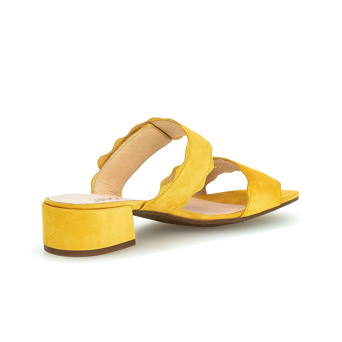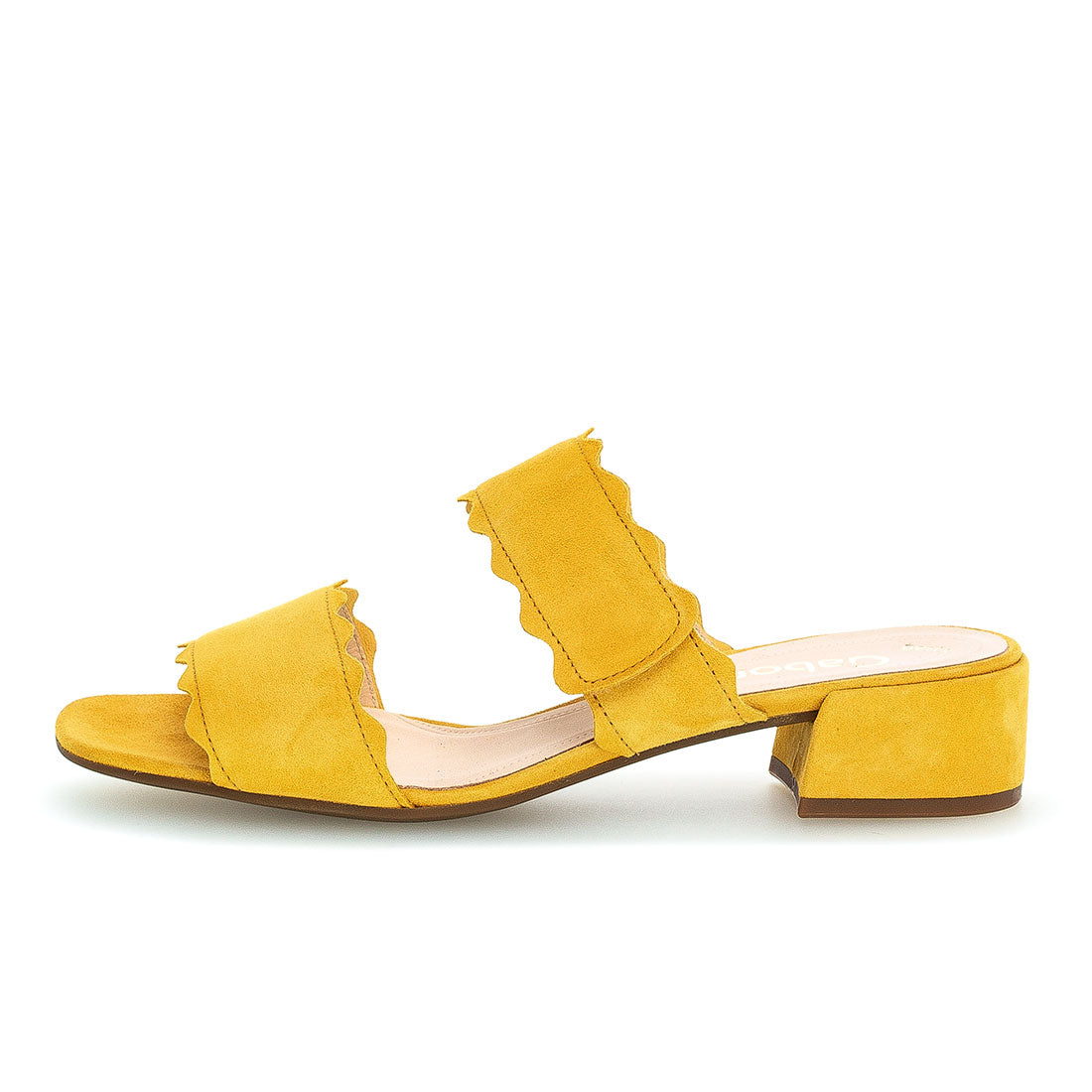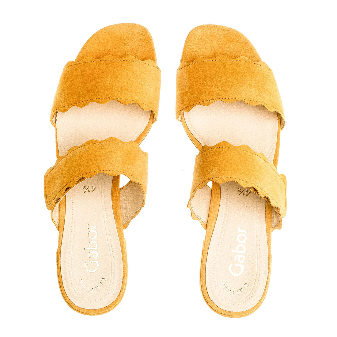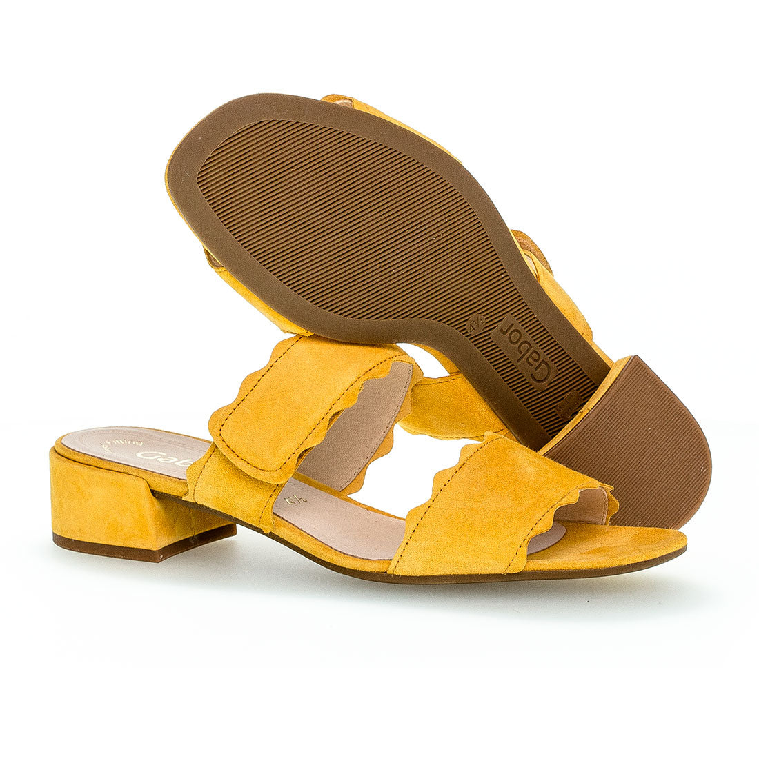 Sød mango gul sandal lige til at stikke i med to remme over foden. Øverste rem kan reguleres med velcro. Let gummisål og betrukket hæl på 3 cm. Best Fitting for et par ekstra millimeter i trædefladen.