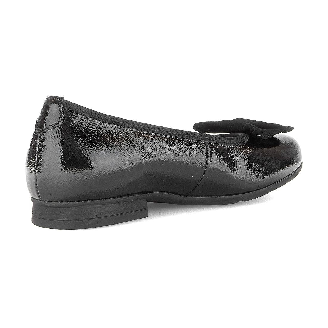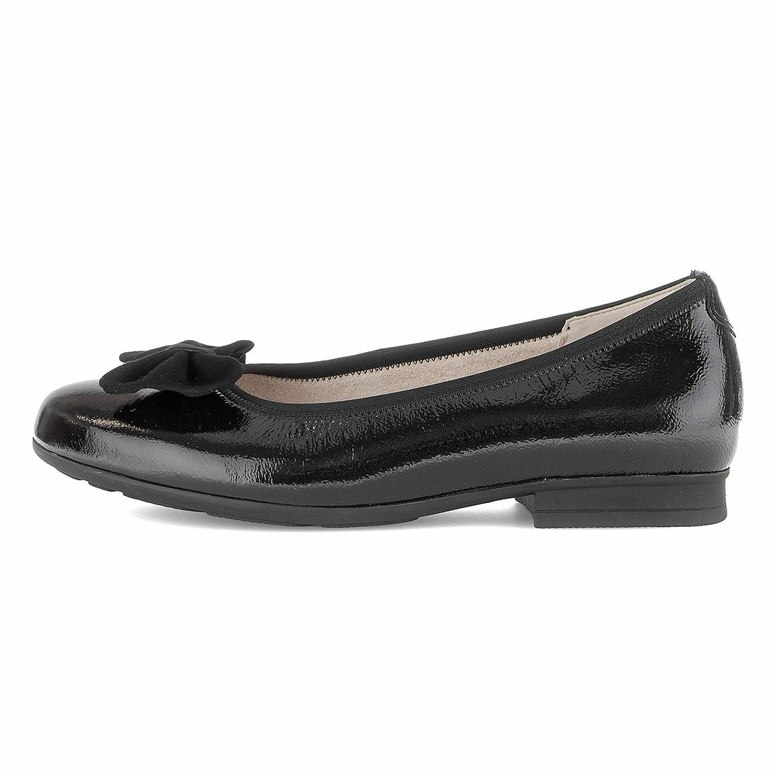 Sort lak ballerina med ruskinds sløjfe. Skoen har Comfort vidde G,mere volumen i tåen, forfod og vristområde. Har Optifit udtagelig indlægssål. Gummisål og hæl på 1,5 cm