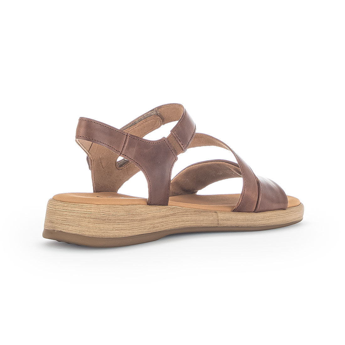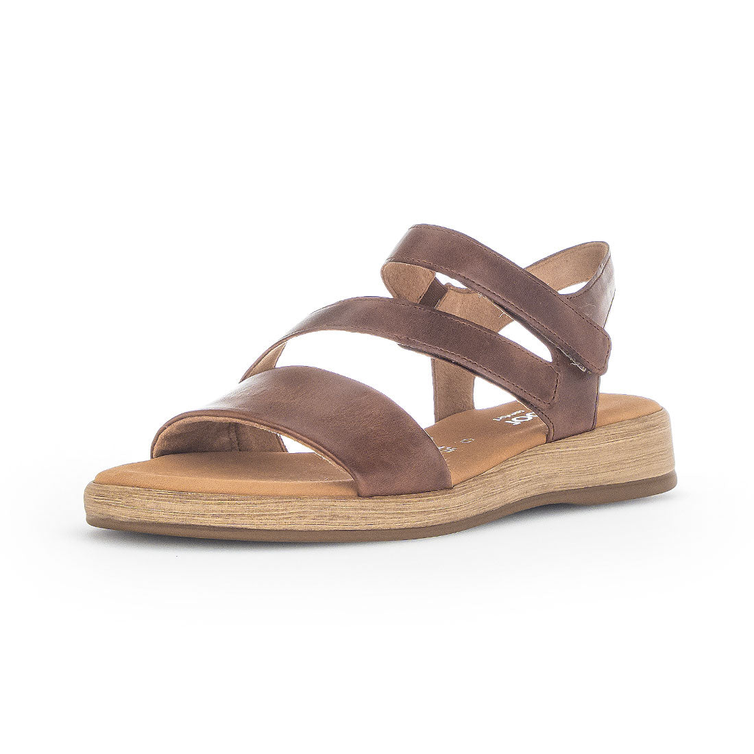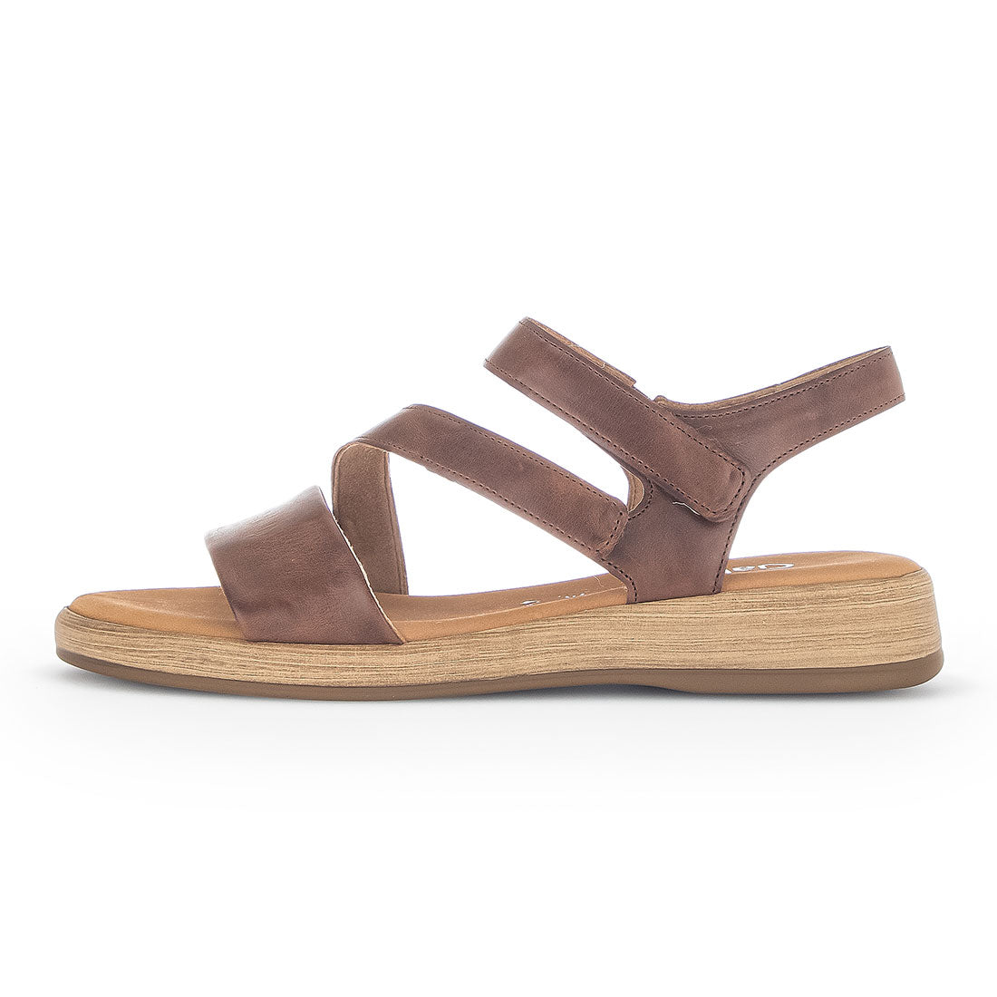 Peanut brun skind sandal med to skrå remme og velcro-lukning. Komfortvidde G og lille kilehæl på 2 cm for ekstra komfort og støtte.