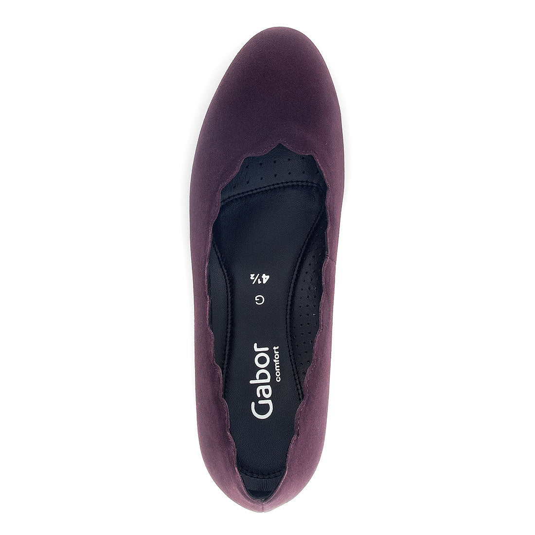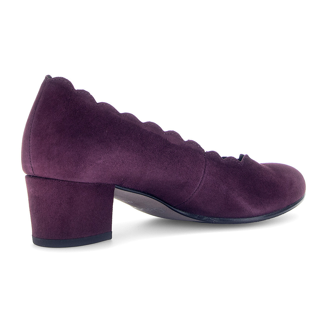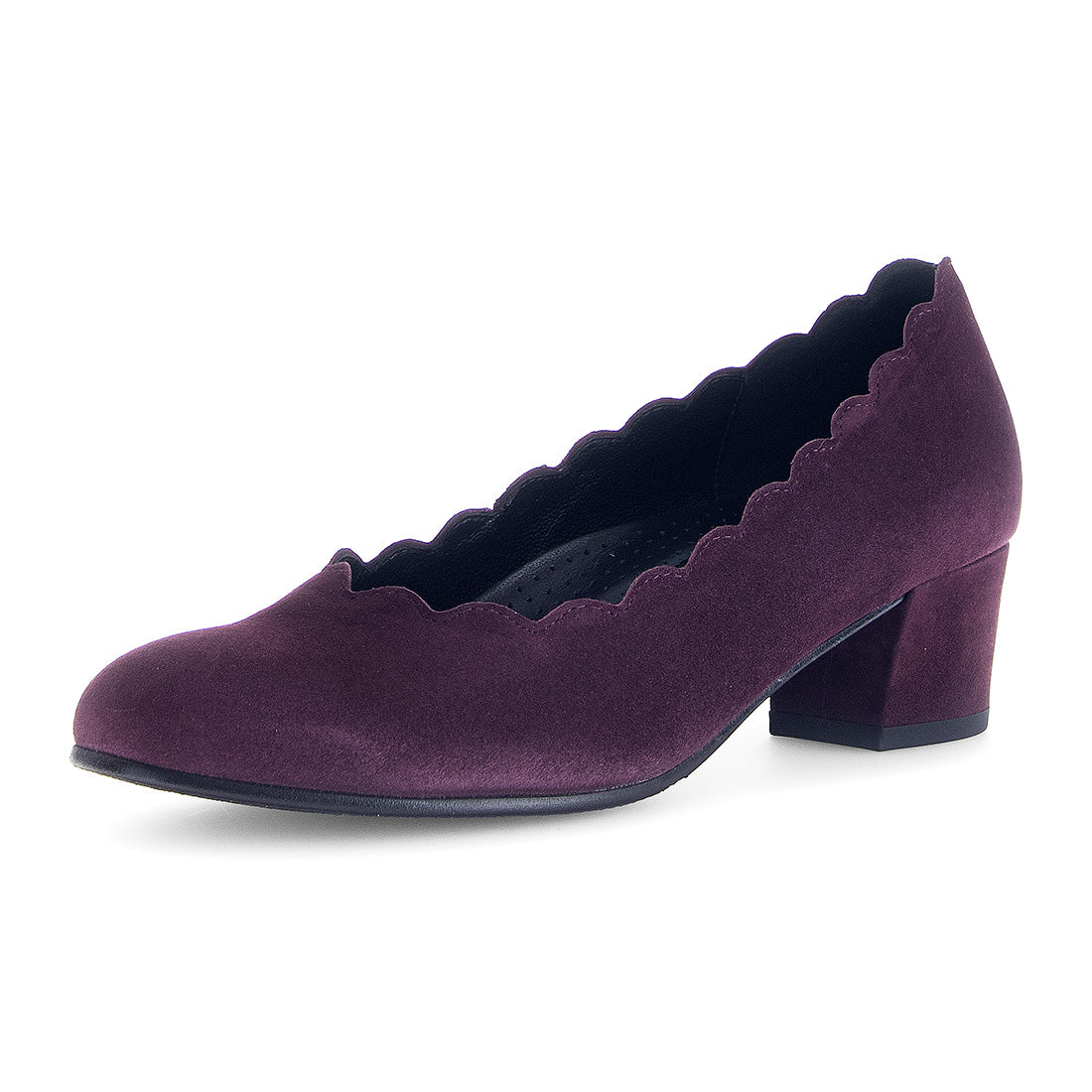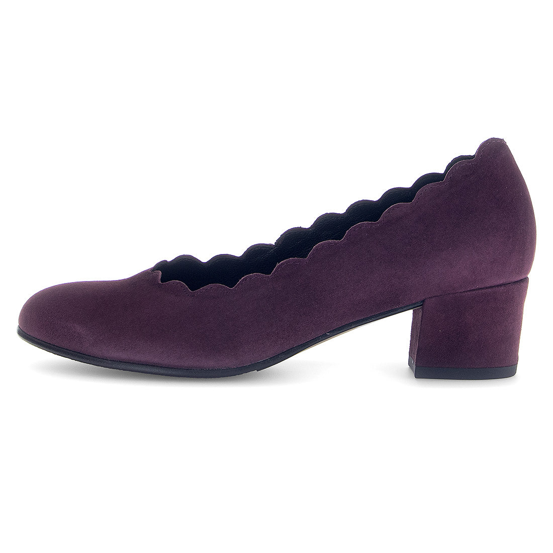 Lilla ruskind pump med bølge kant i udskæringen. Skoen har Comfort vidde G, lidt mere bredde og volumen i tåen, forfod og vristområde. Blød sort indersål med perforinger. Har betrukket hæl på 4 cm.