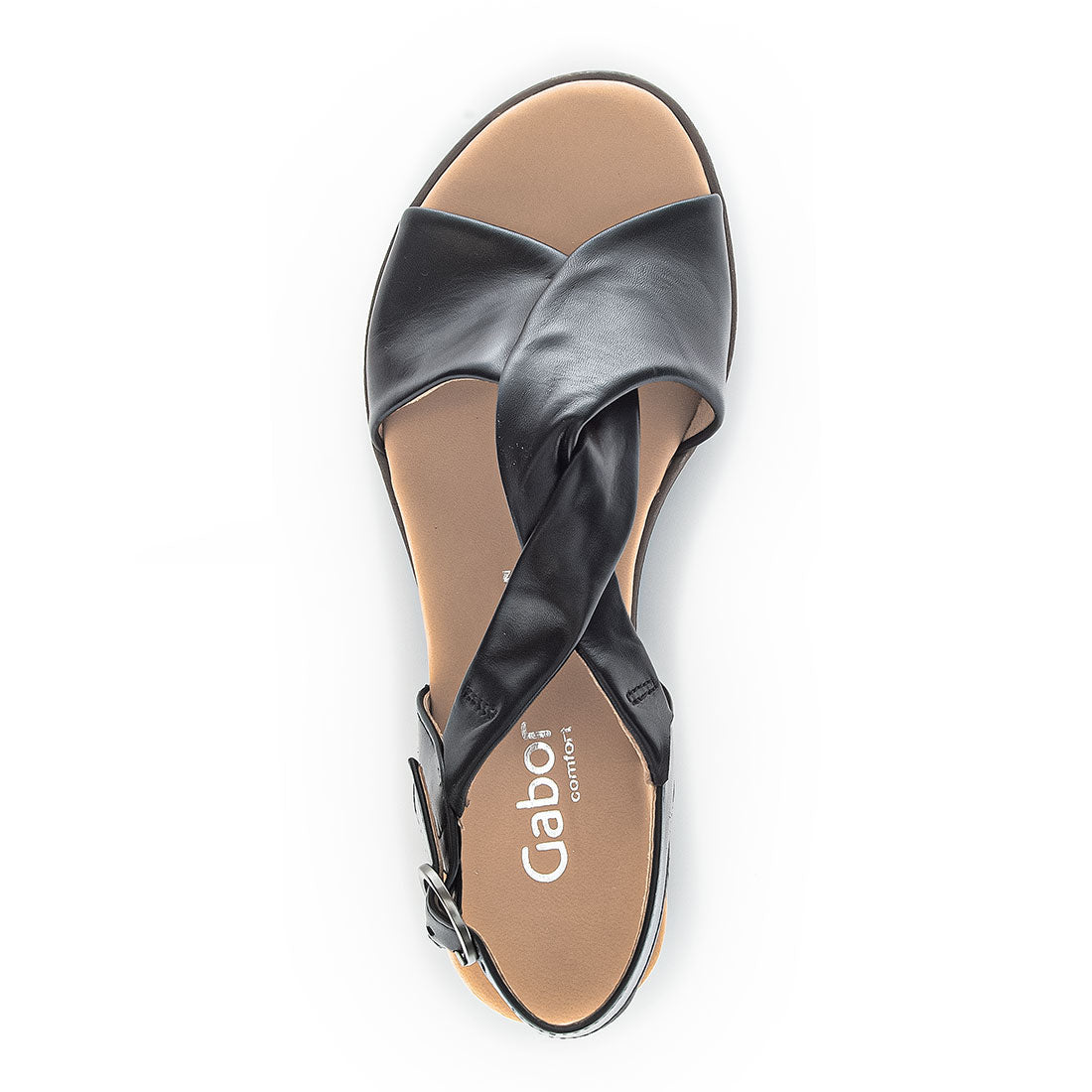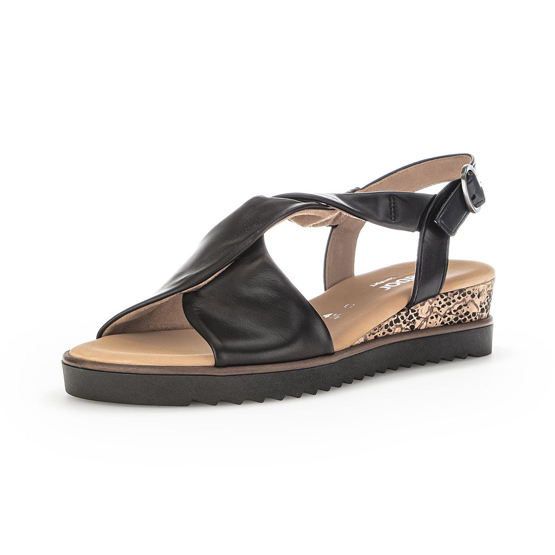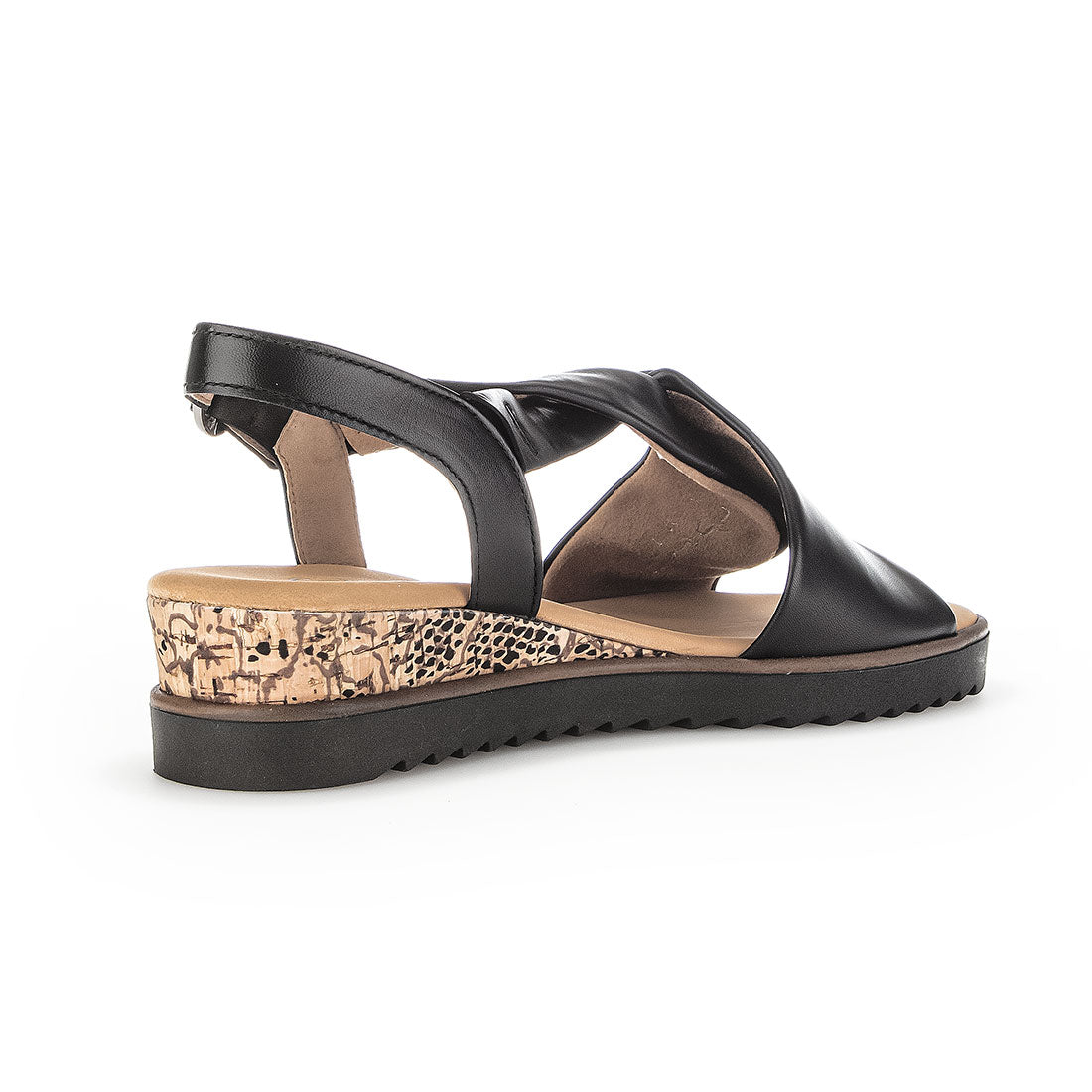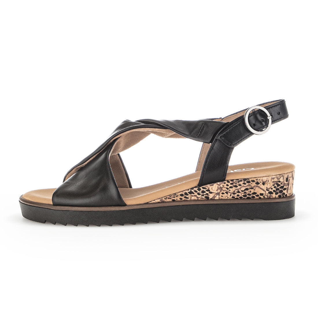 Sort skindsandal med bagrem og spænde. Comfort vidde G for ekstra plads. Lav leopardmønstret korkkile på 2,5 cm og sort gummisål. Samlet hælhøjde 4,5 cm.