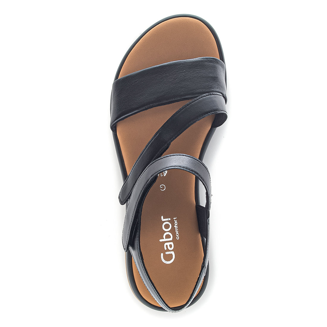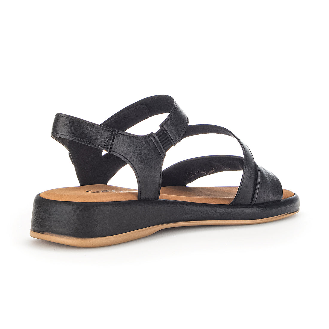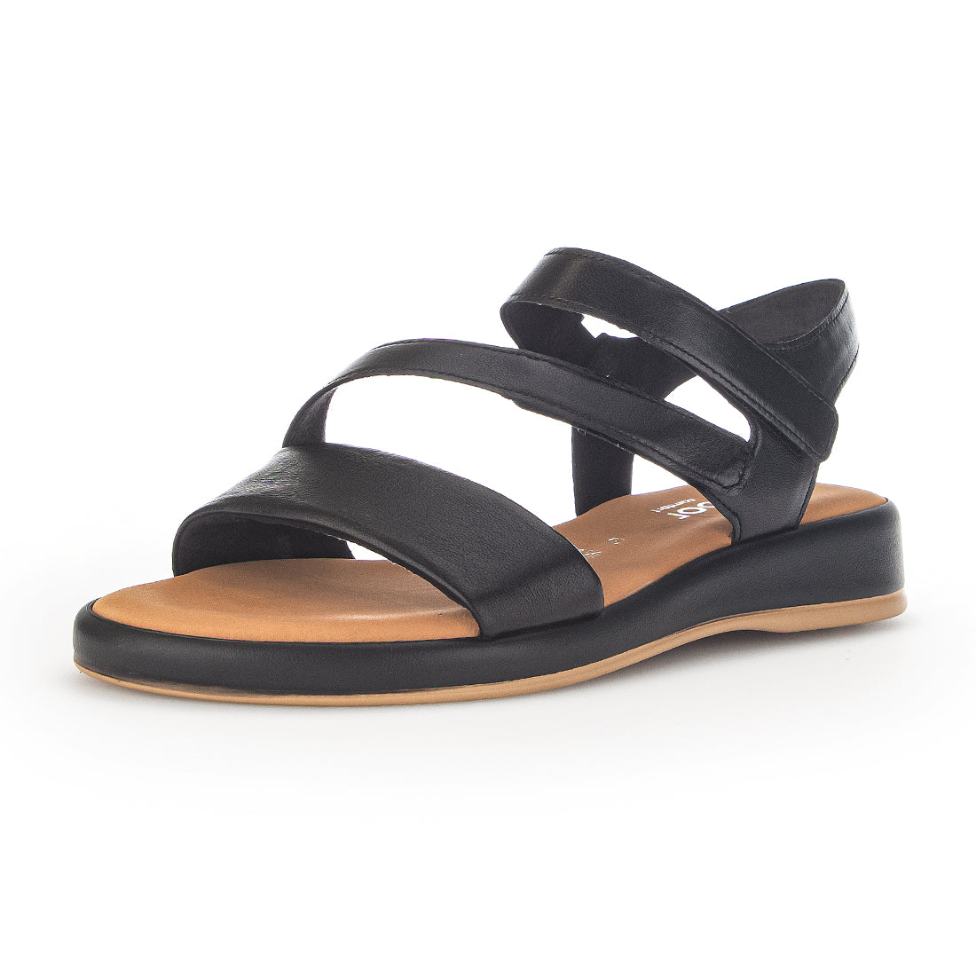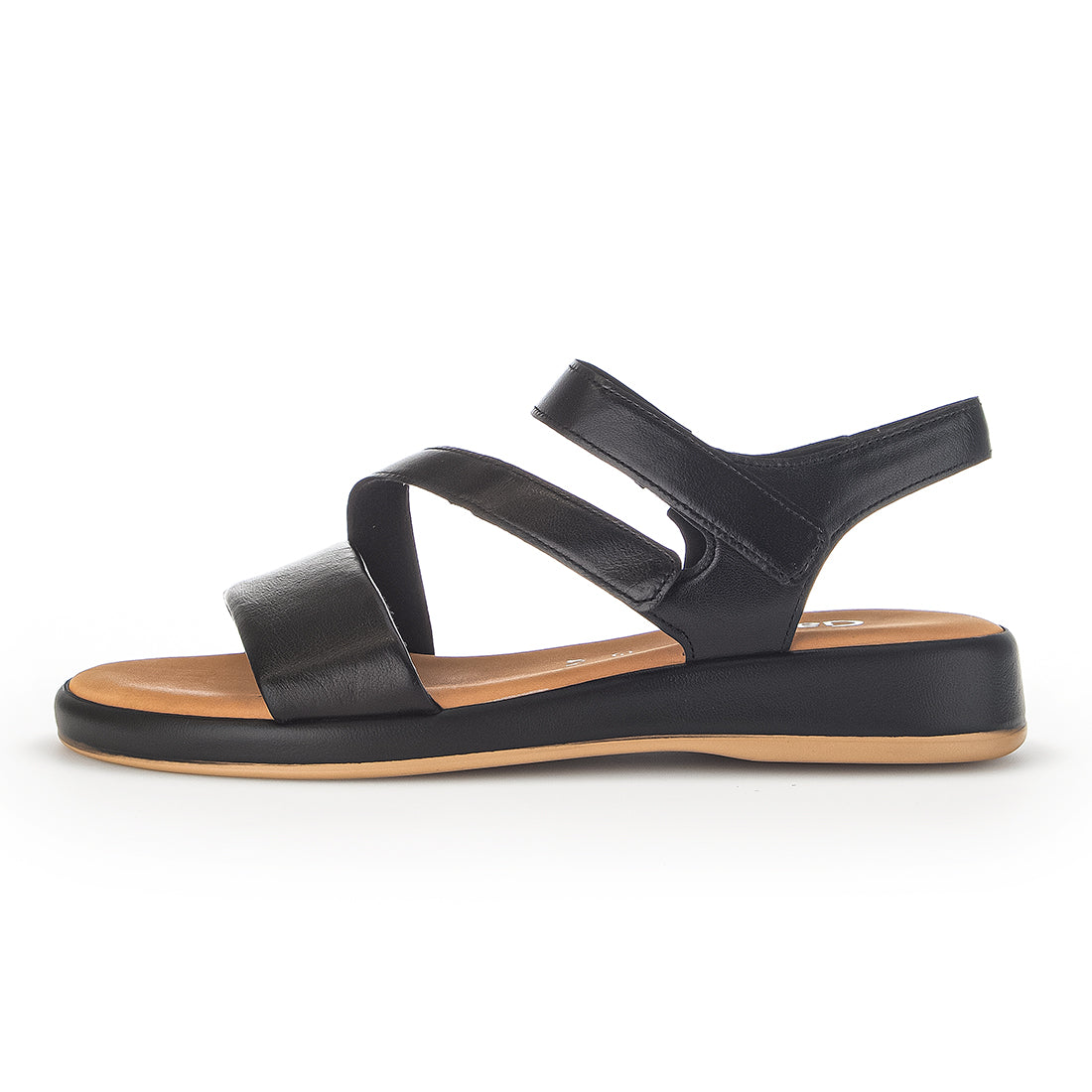 Sort skind sandal med to skrå velcroremme. Comfort vidde G med ekstra bredde og mere volumen i tå, forfod og vrist. Lille kilehæl på 2 cm.