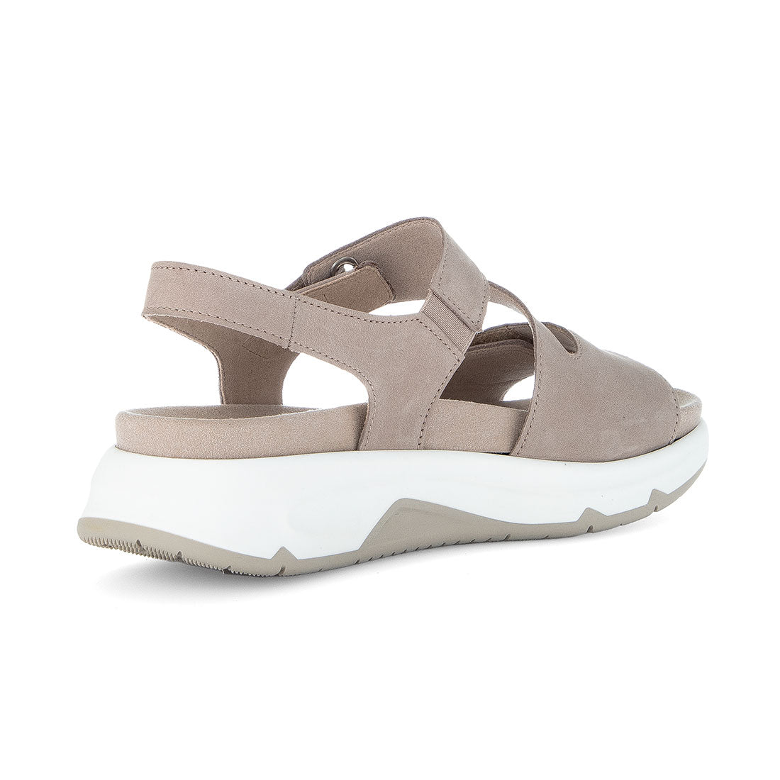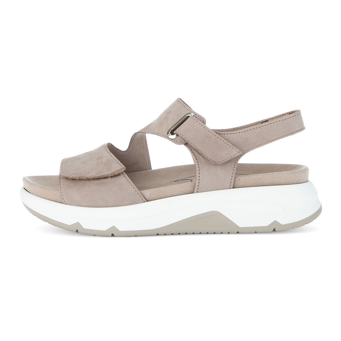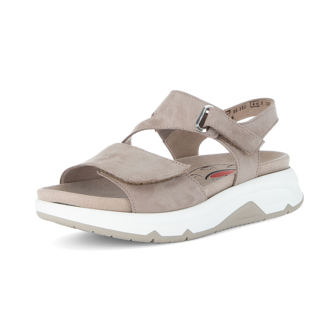 Sand nubuck sandal med velcro lukning over vristen og foran. Optifit udtagelig indersål med Comfort vidde G. Gummisål med kile 1,5 cm. Rollingsoft er stødabsoberende og sålens bue understøtter fodens naturlige bevægelse.