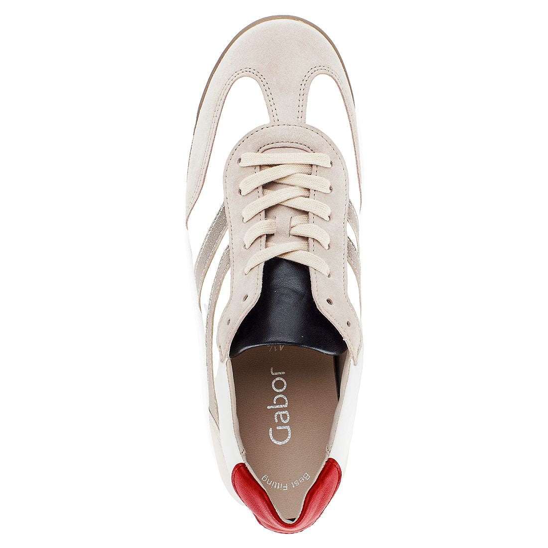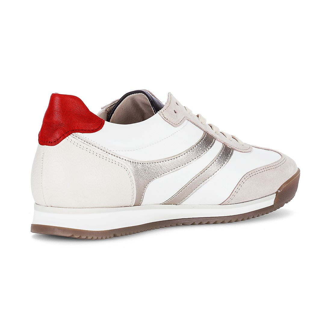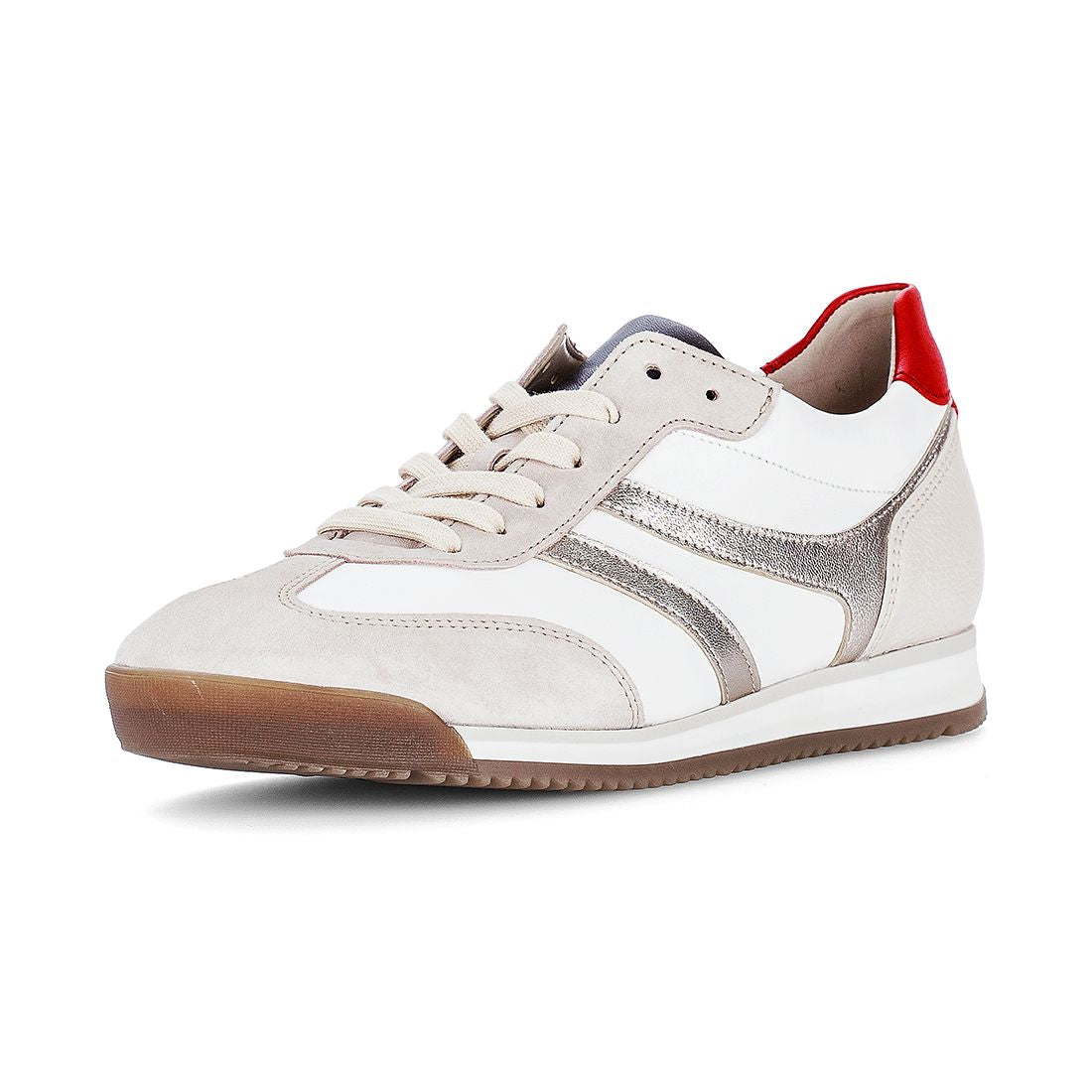 Hvid skind med beige ruskind sneaker med rød skind på hælen. Skoen har snøre, er med gummisål og skindforet indvendig og med udtagelig indlægessål. Best Fitting for 1,5 cm ekstra bredde i forfoden.