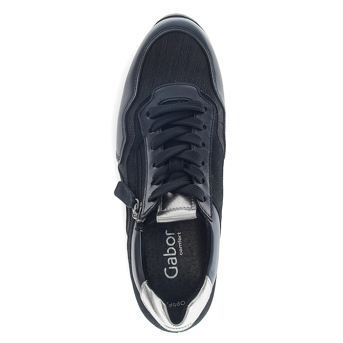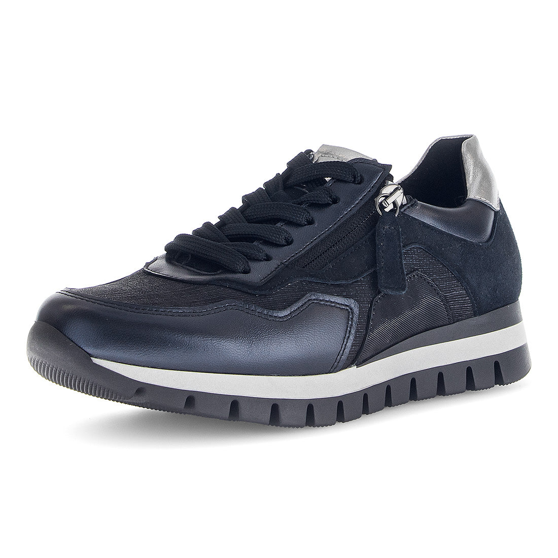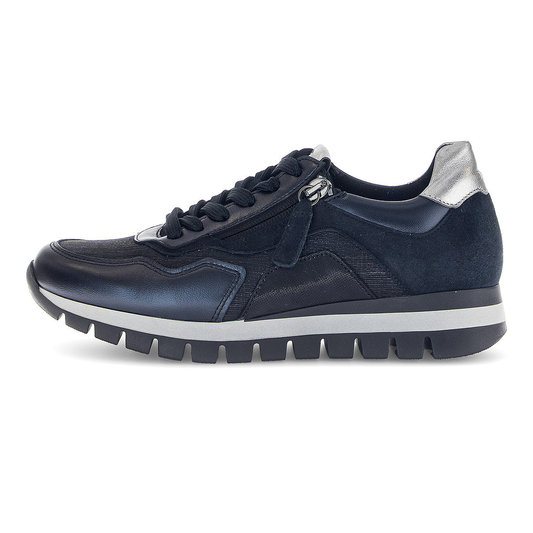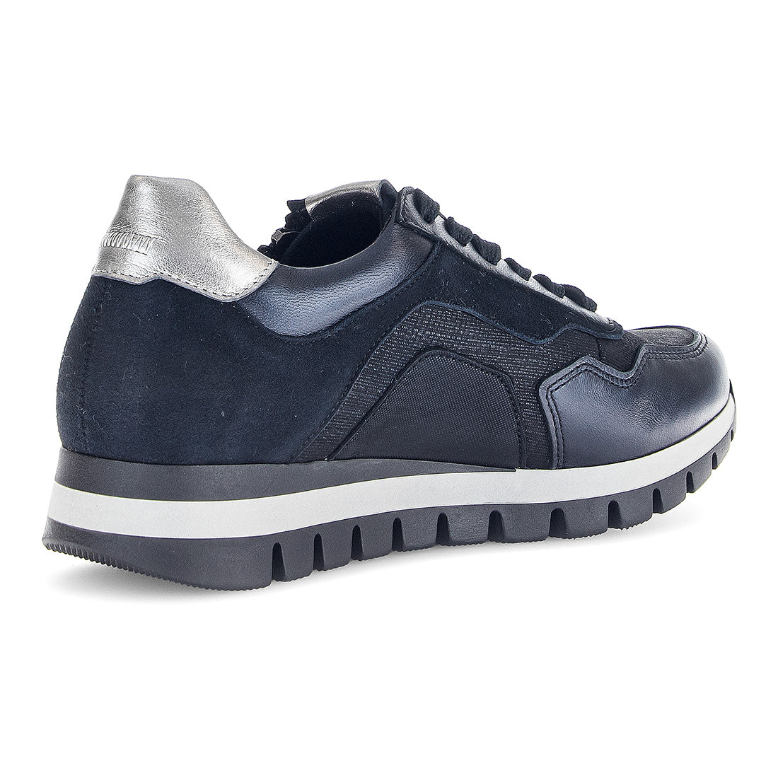 Blå skind, ruskind + præget skind sneaker med snørebånd og lynlås.Sølv detalje på bagkappen. Skoen har Comfort vidde H - ekstra bredde og er med Optifit udtagelige læder indersål. Sort / grå gummisål med kile på 1 cm.
