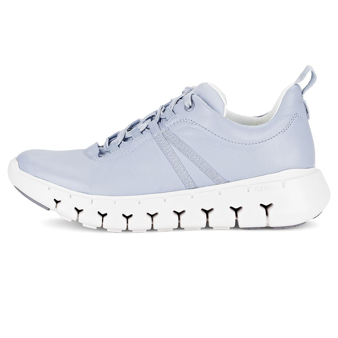 Lyseblå skind sneaker med snøre og den nye Flexflex sål som er super let, fleksibel og stødabsorberende. Skoen har Best Fitting for et par ekstra millimeter plads i trædefladenog Optifit udtagelig sål.