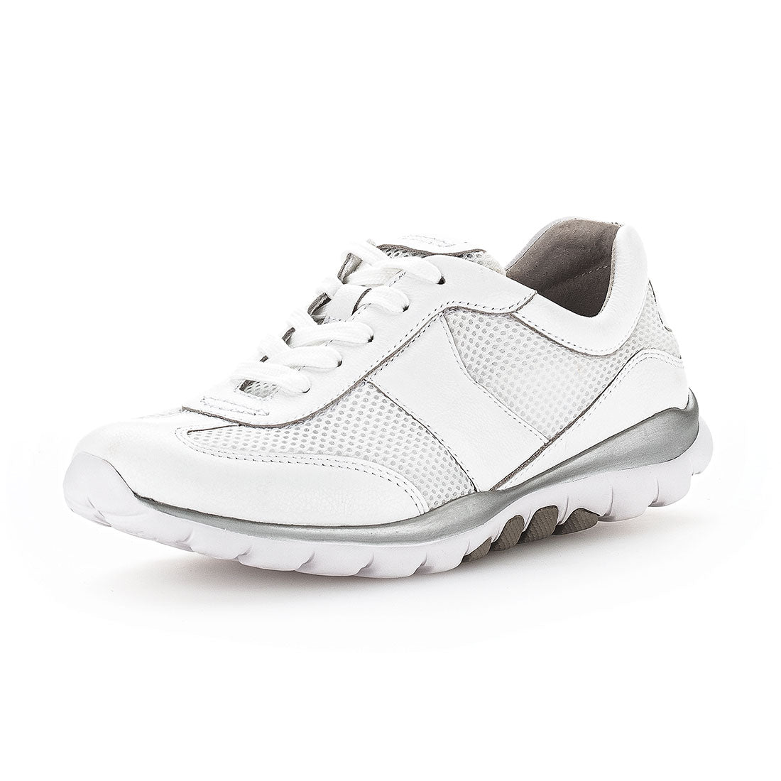 Hvid skind sneaker med mesh tekstil og snøre.Optifit udtagelig sål med Comfort vidde G.Hvid kile på 2 cm.Rolling Soft er stødabsoberende og sålens bue understøtter fodens naturlige bevægelse.Aflaster op igennem ben og ryg.
