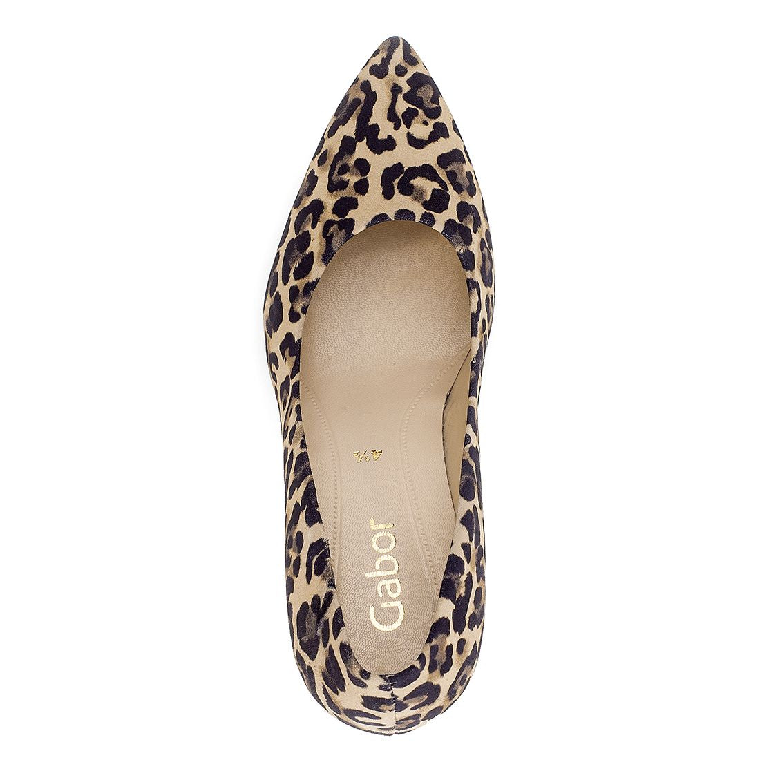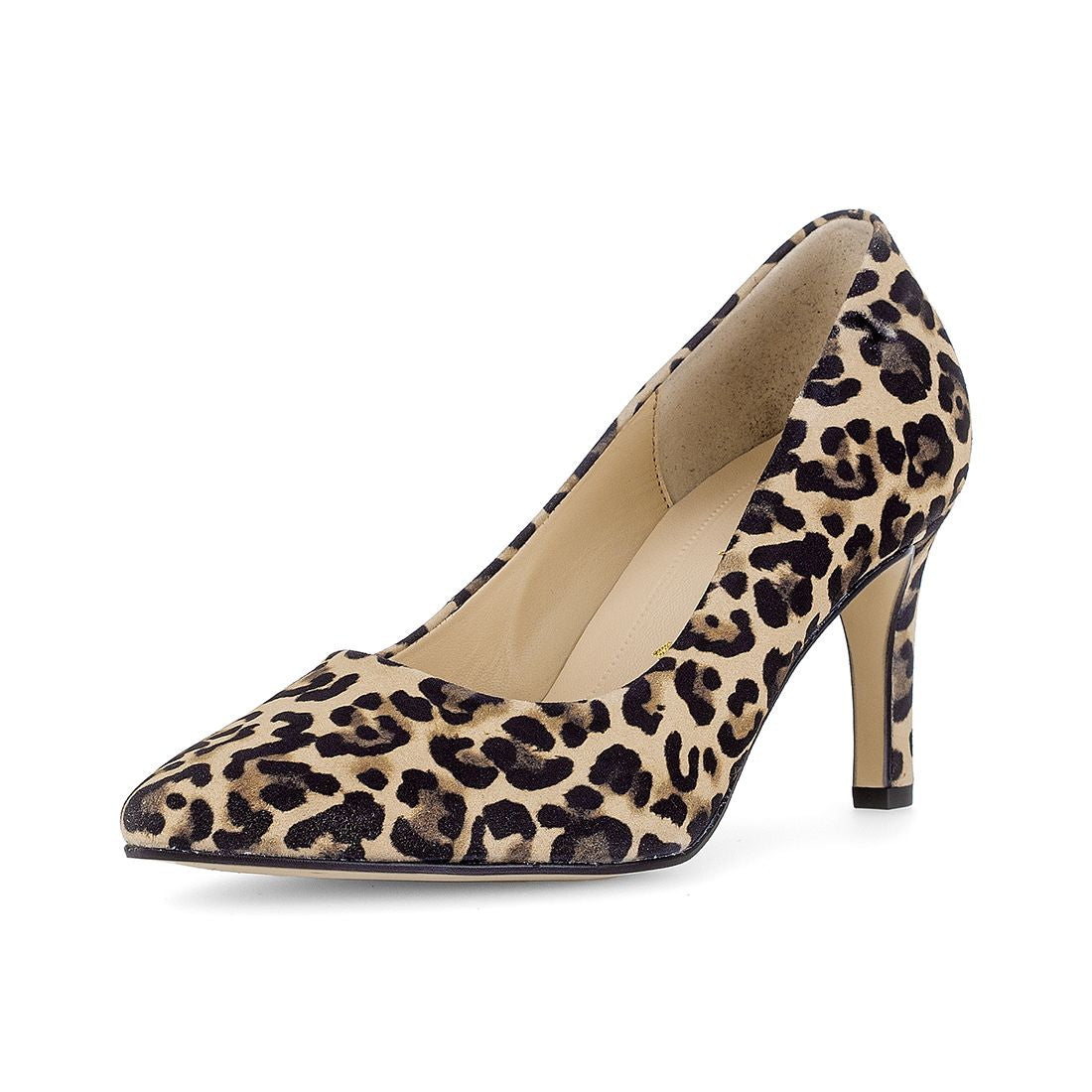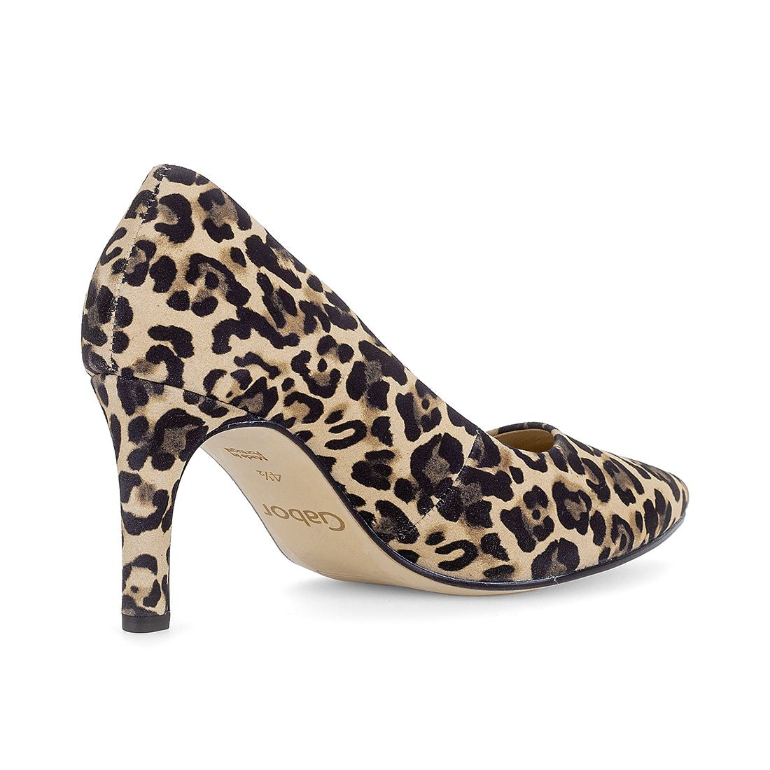 Flot og elegant leopard præget ruskind pump/stilet med spids tå og slank betrukket hæl. Lys læder indersål. Almindelig vidde F, så det er en let og slank model. Hælhøjde på 7 cm.