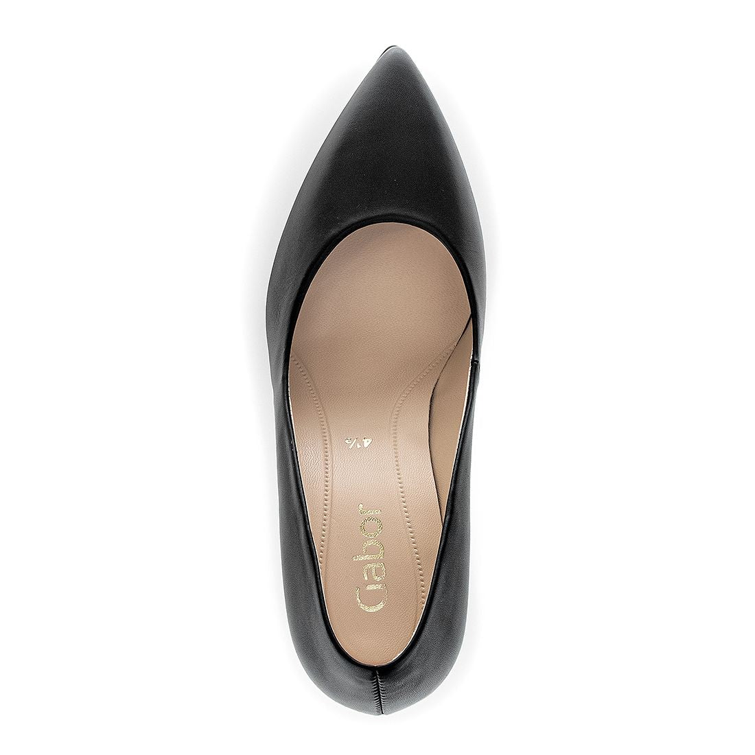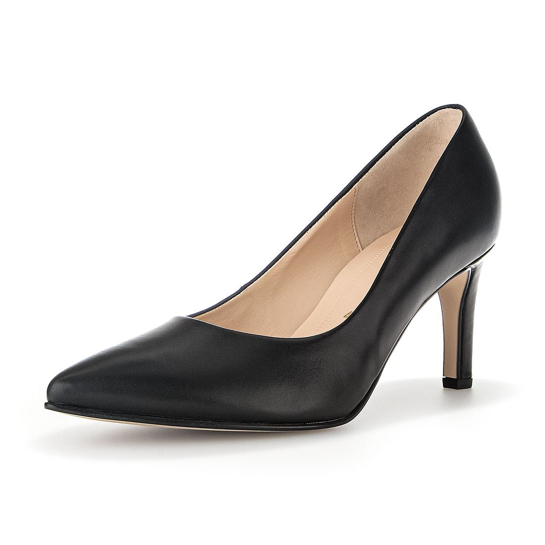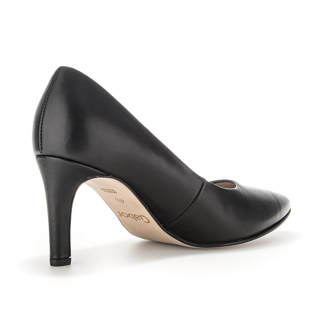 Flot og elegant sort skind pump / stilet med spids tå og slank betrukket hæl. Lys læder indersål. Almindelig vidde F. Hælhøjde på 7 cm.