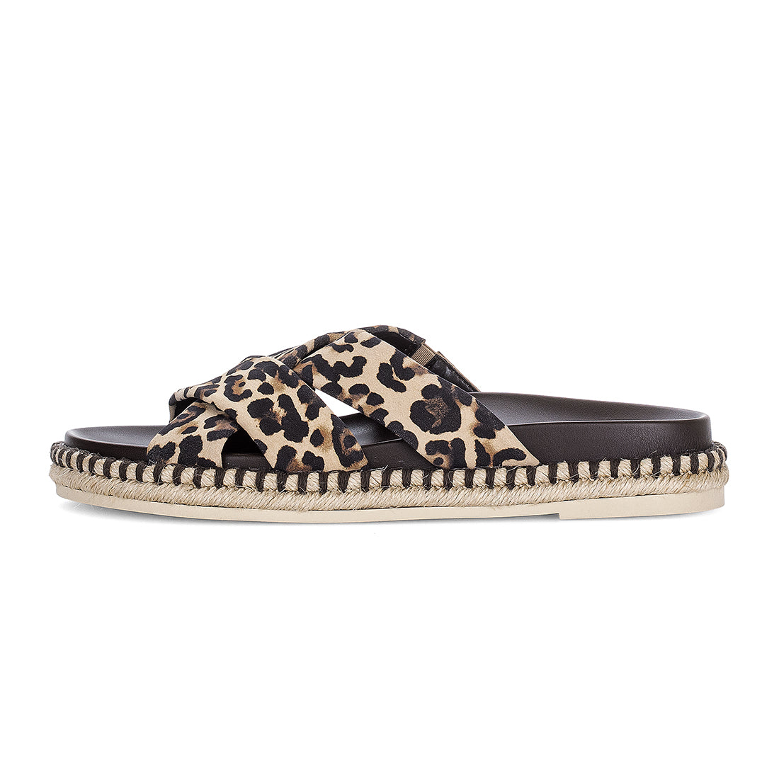 Beige og brun step i sandal med kryds remme over foden. Blød fodformet indersål med Best Fitting, så der er 2 mm ekstra plads i forfoden. Gummisål med bast kant ogj kile på 1 cm.