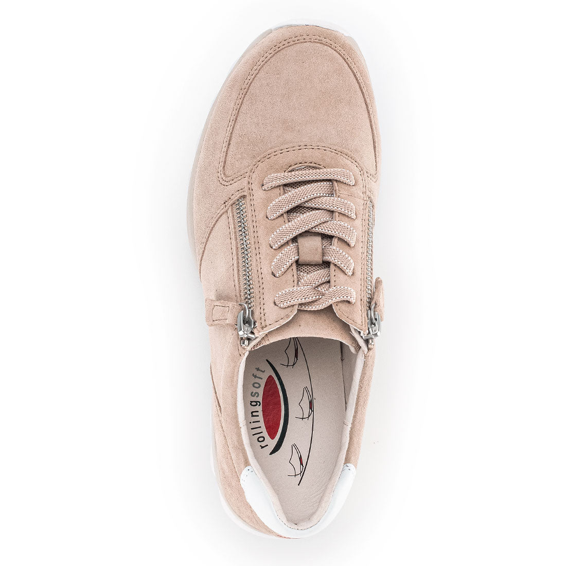 Beige ruskind sneakers med snøre og lynlås. Optifit udtagelig sål med Comfort vidde G. Gummi kile på 2 cm. Rollingsoft er stødabsorberende og sålens bue understøtter fodens naturlige bevægelse. Aflaster op igennem ben og ryg.