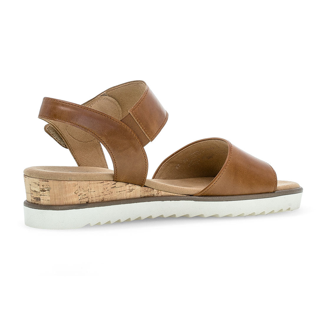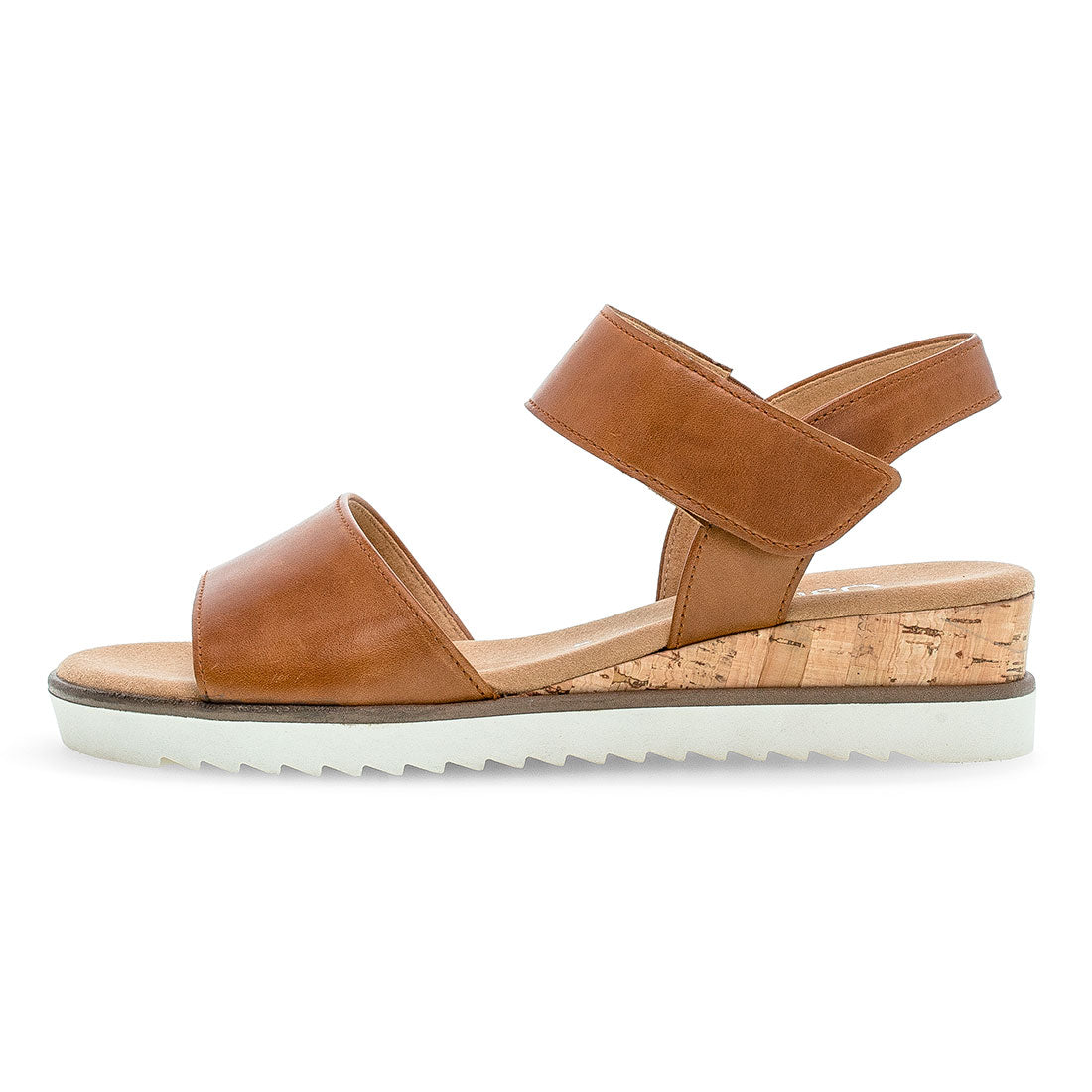 Smart brun skindsandal med velcrolukning. Brun læderindersål med Comfort vidde G for ekstra plads og bevægelsesfrihed. Lav korkkile på 2,5 cm samt hvid gummisål.