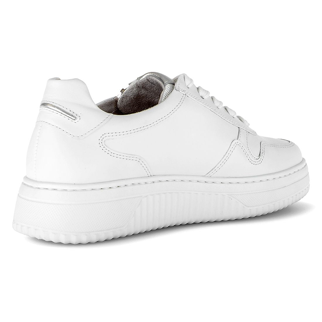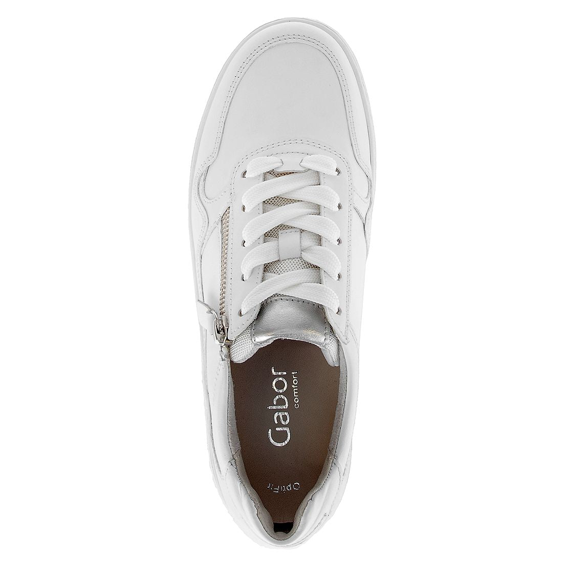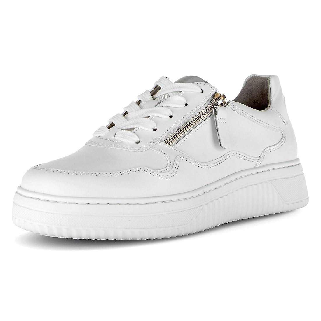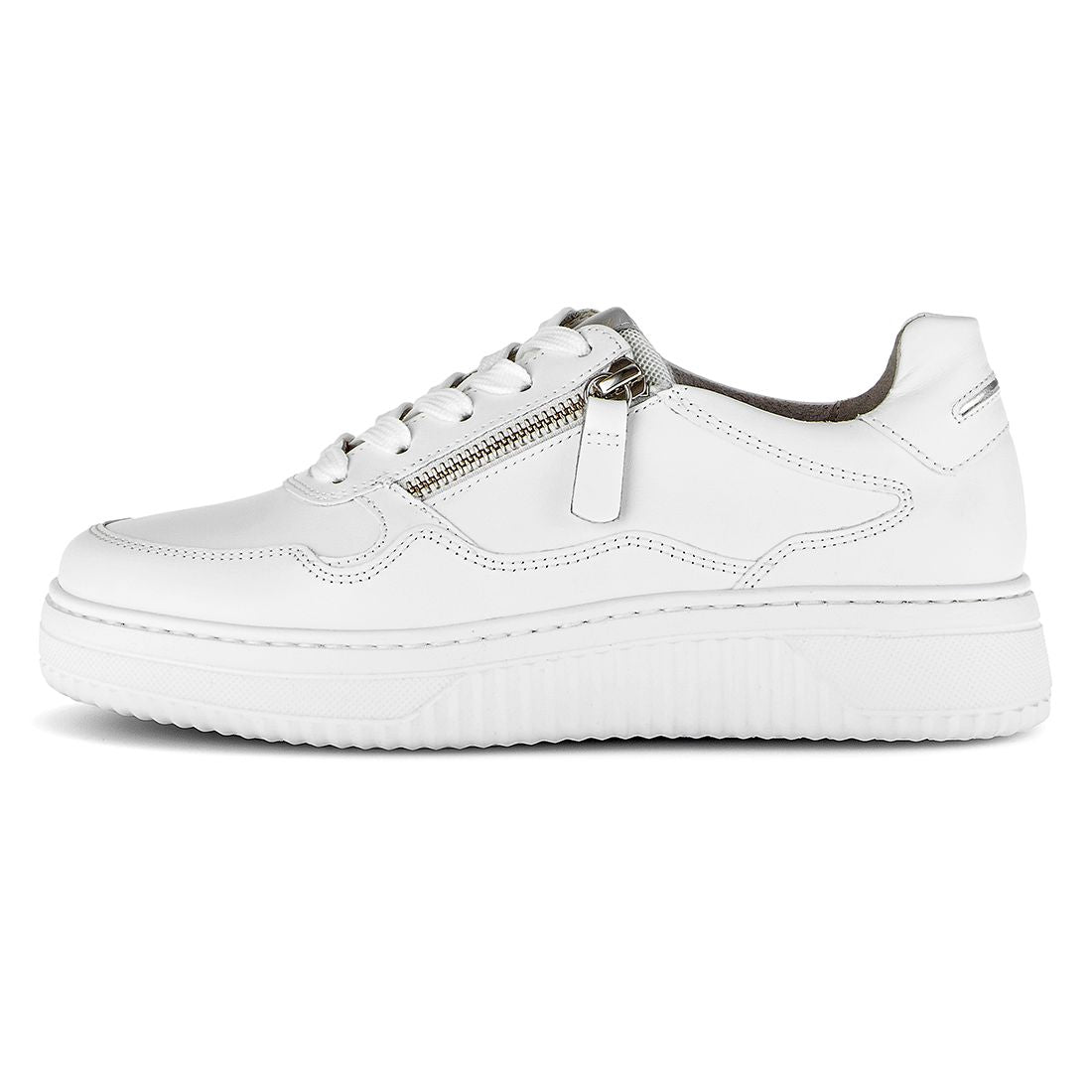 Hvid sneaker med Lynlås i den ene side og snøre. Skoen har Comfort vidde K (Gabors bredeste) og har Optifit udtagelig læder indersål Hvid gummisål kile 1,5 cm