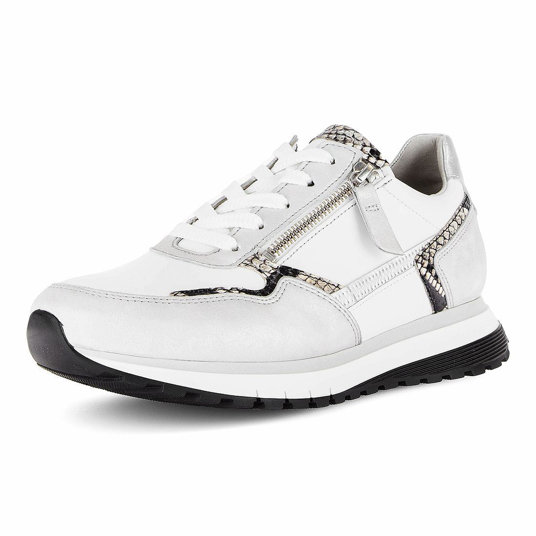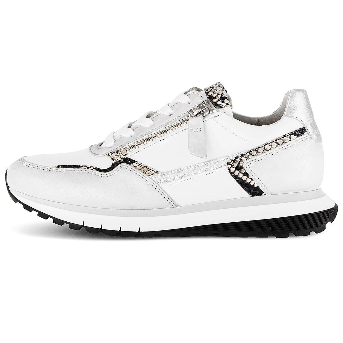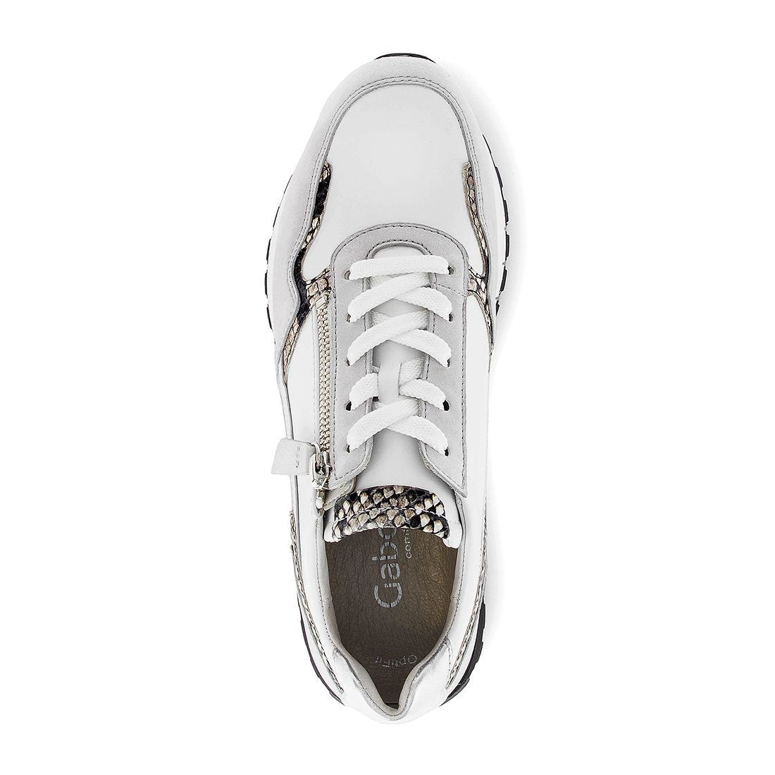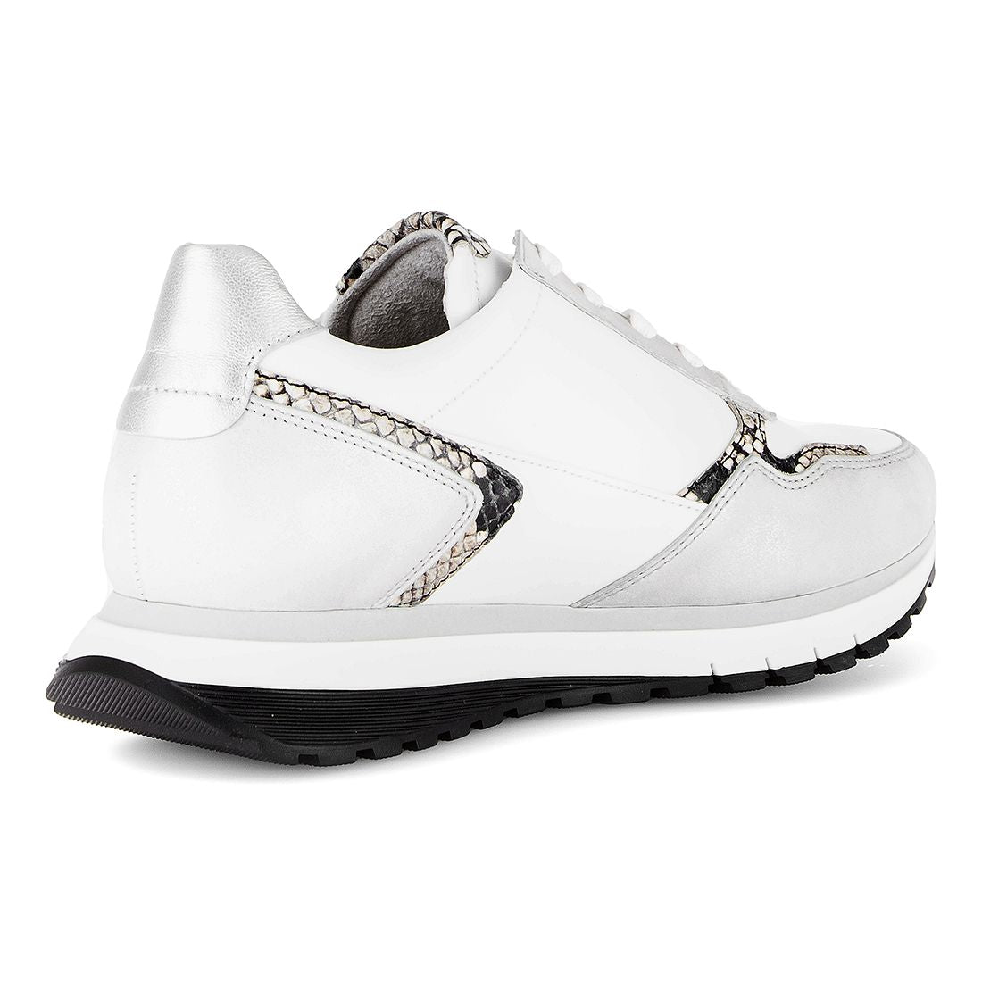 Sneaker i hvid skind med detaljer i sølvgrå og slangepræget skind. Skoen har snøre og lynlås og er med Comfort vidde H. Optifit udtagelig indlægssål. Gummisål med kile på 1 cm