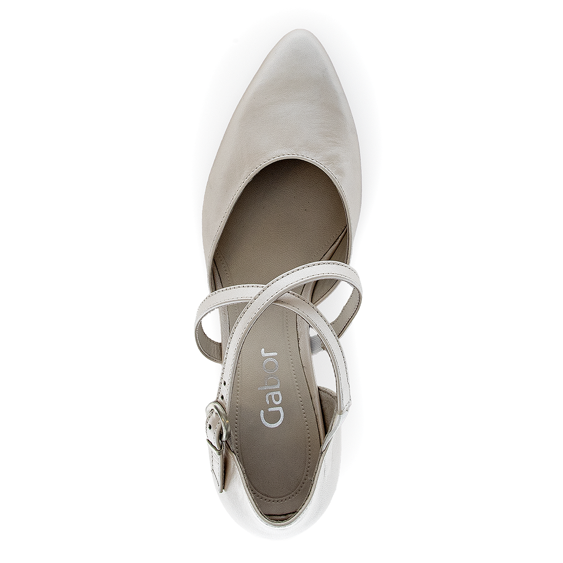 Off-white perlemors skind pump med 2 remme der krydser over foden (lukkes med tryklås spænde). Betrukket hæl på 5,5 cm. Almindelig vidde F.