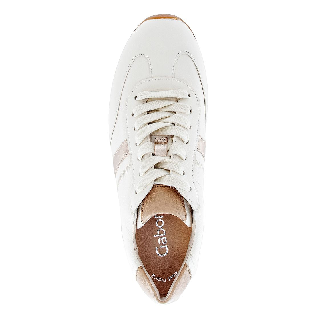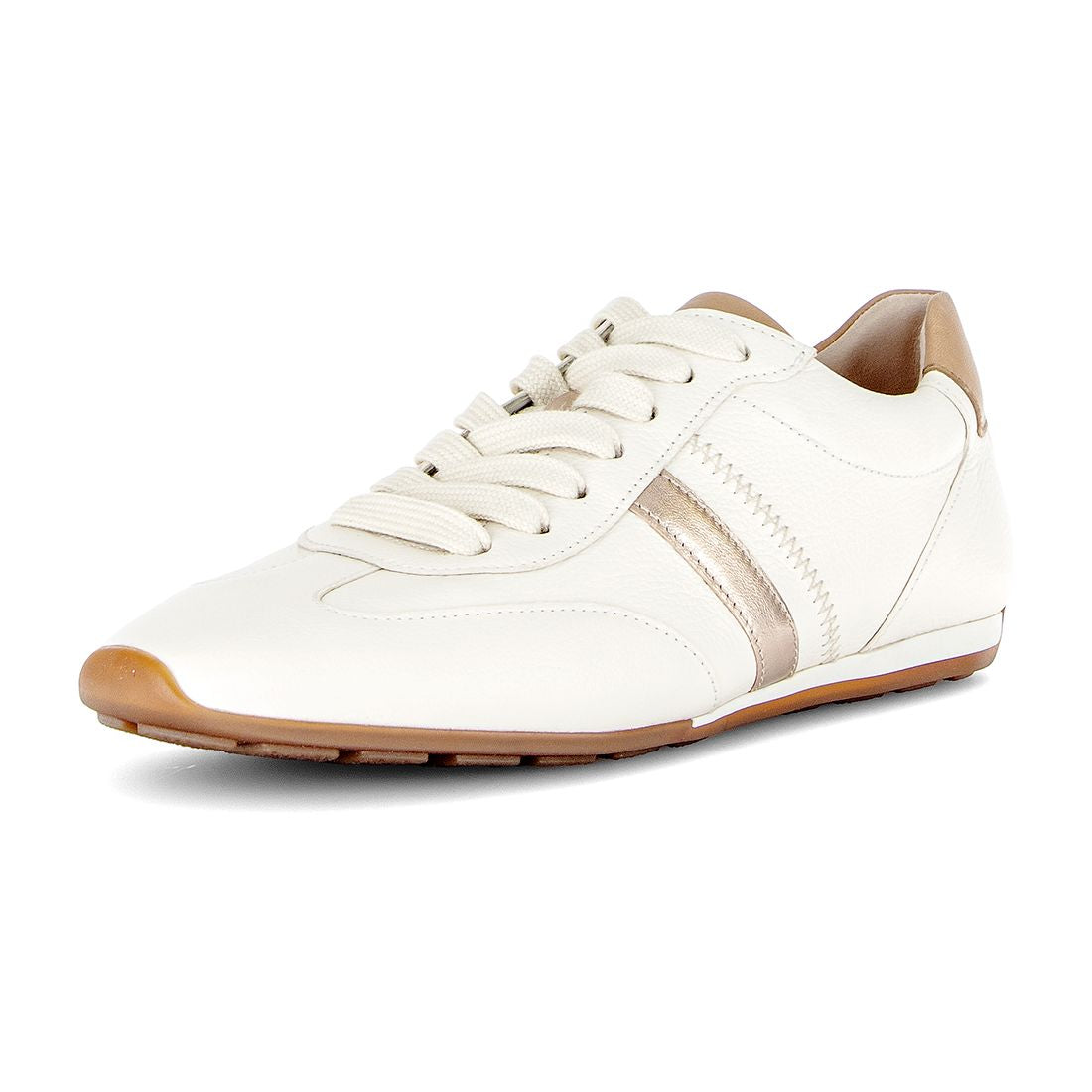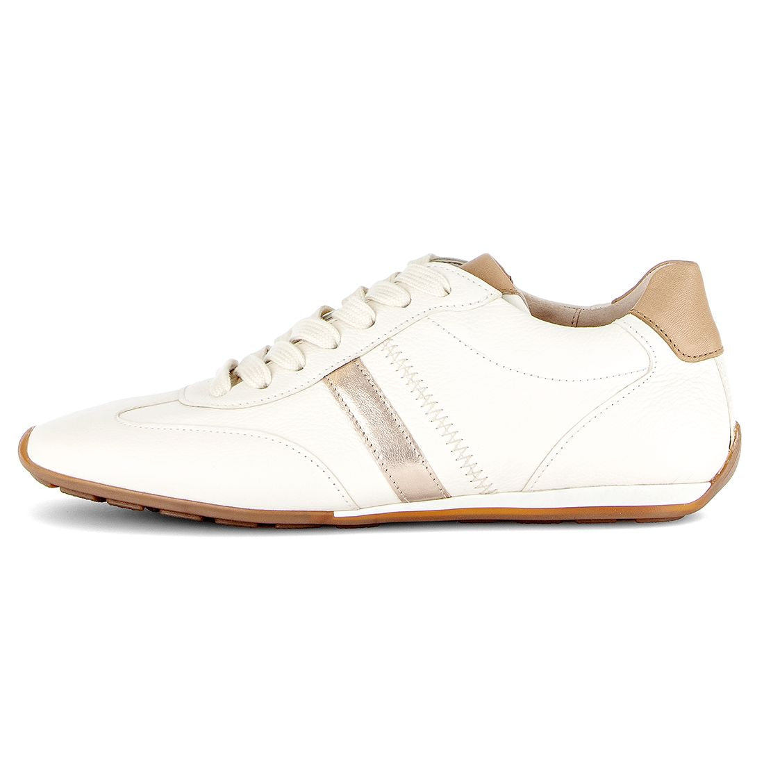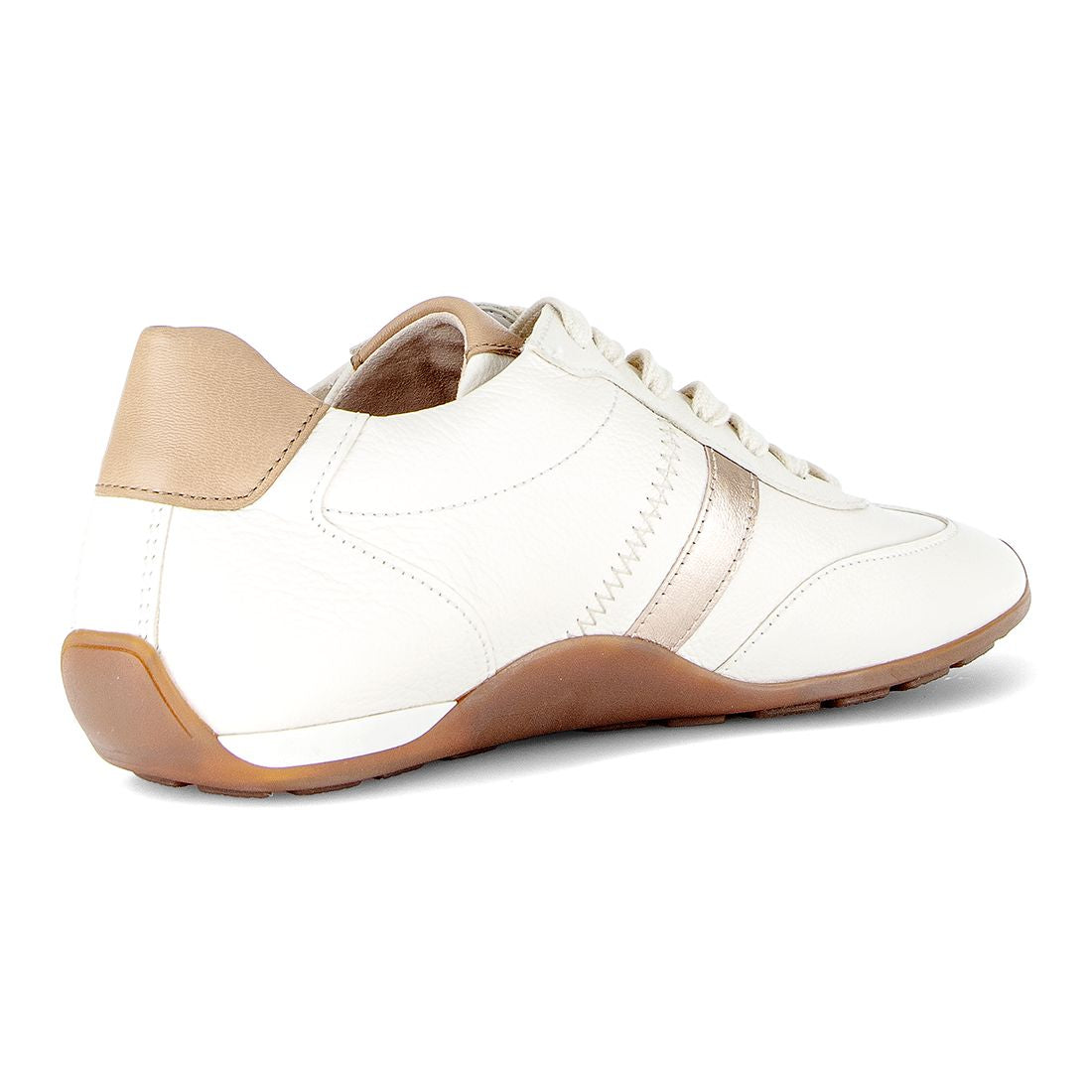 Off-white skind sneaker med guld stribe og snøre. Skoen er almindelig vidde F + Best Fitting for et par ekstra millimeter plads i trædefladen. Skoen har Optifit udtagelig indlægssål. Gummisål 1 cm kile.