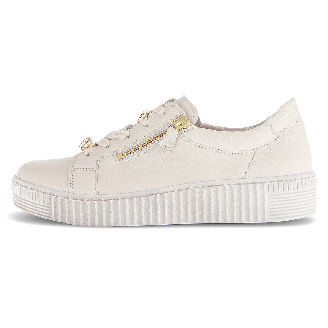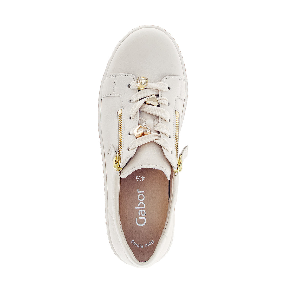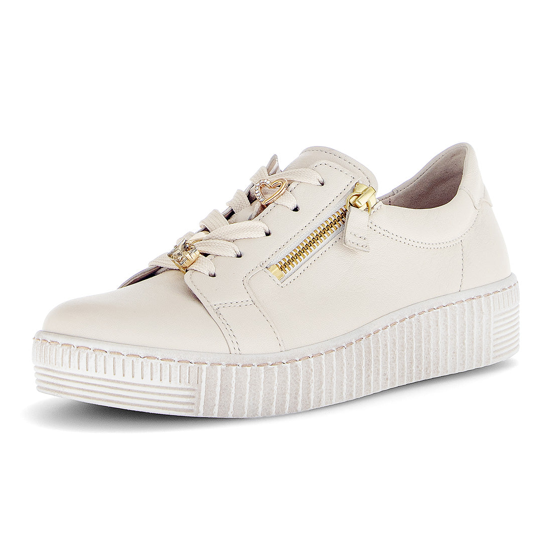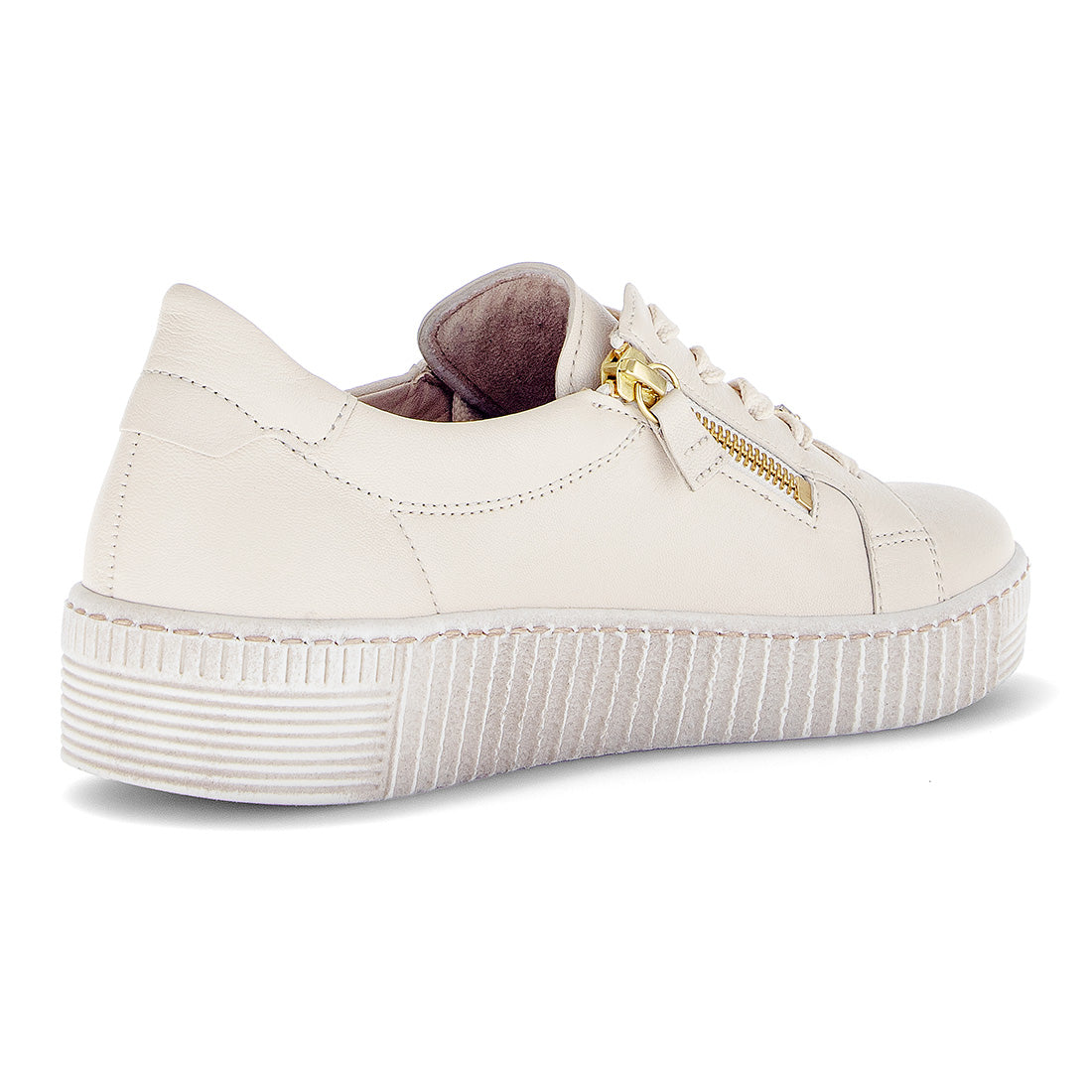 Sneaker i off white skind med snøre og lynlås, så den er let at få på. Løse pynte ting på snøren. Optifit udtagelig læder indlægssål og almindelig vidde + Best Fitting for lidt ekstra plads i forfoden/trædefladen. Gummisål med kile på 1,5 cm