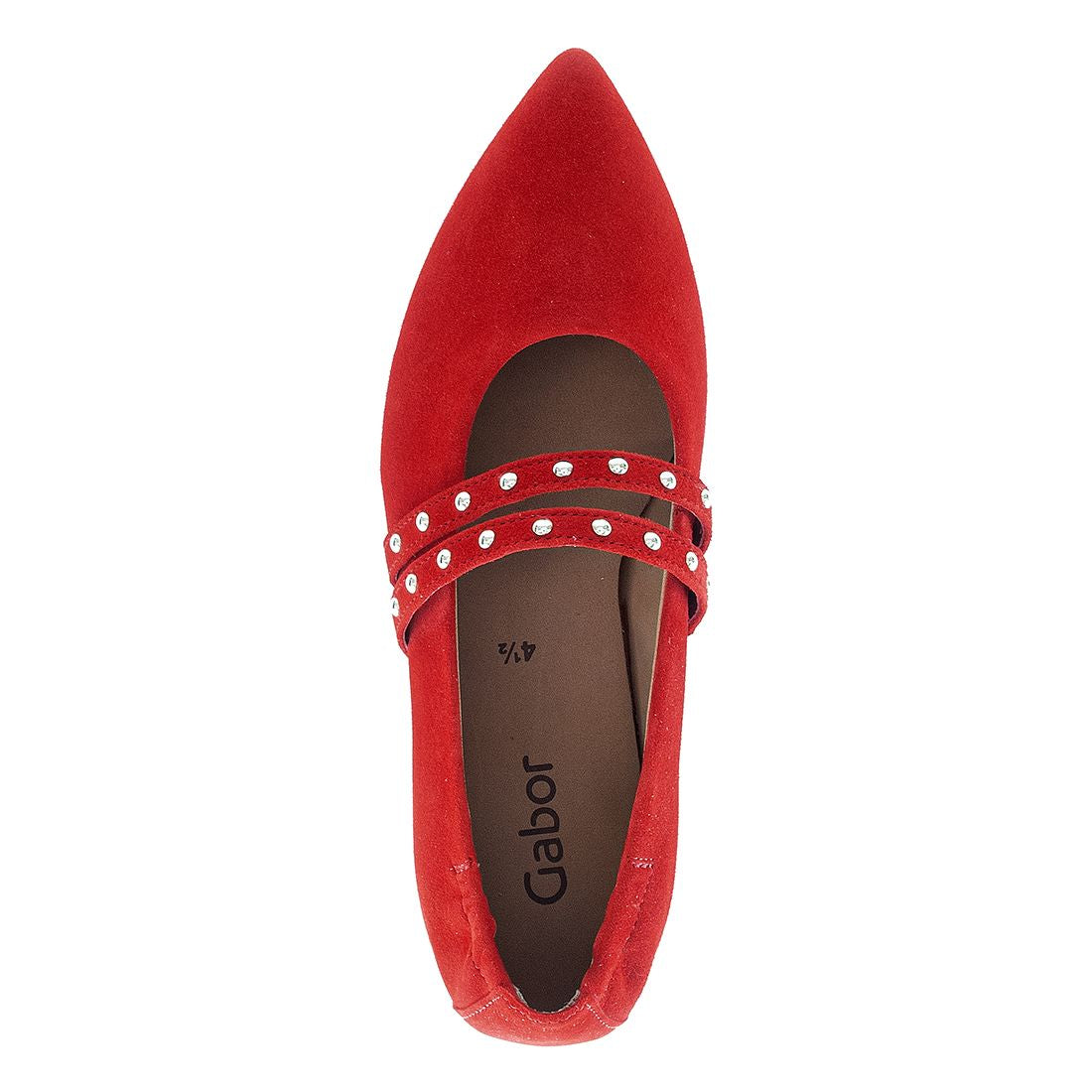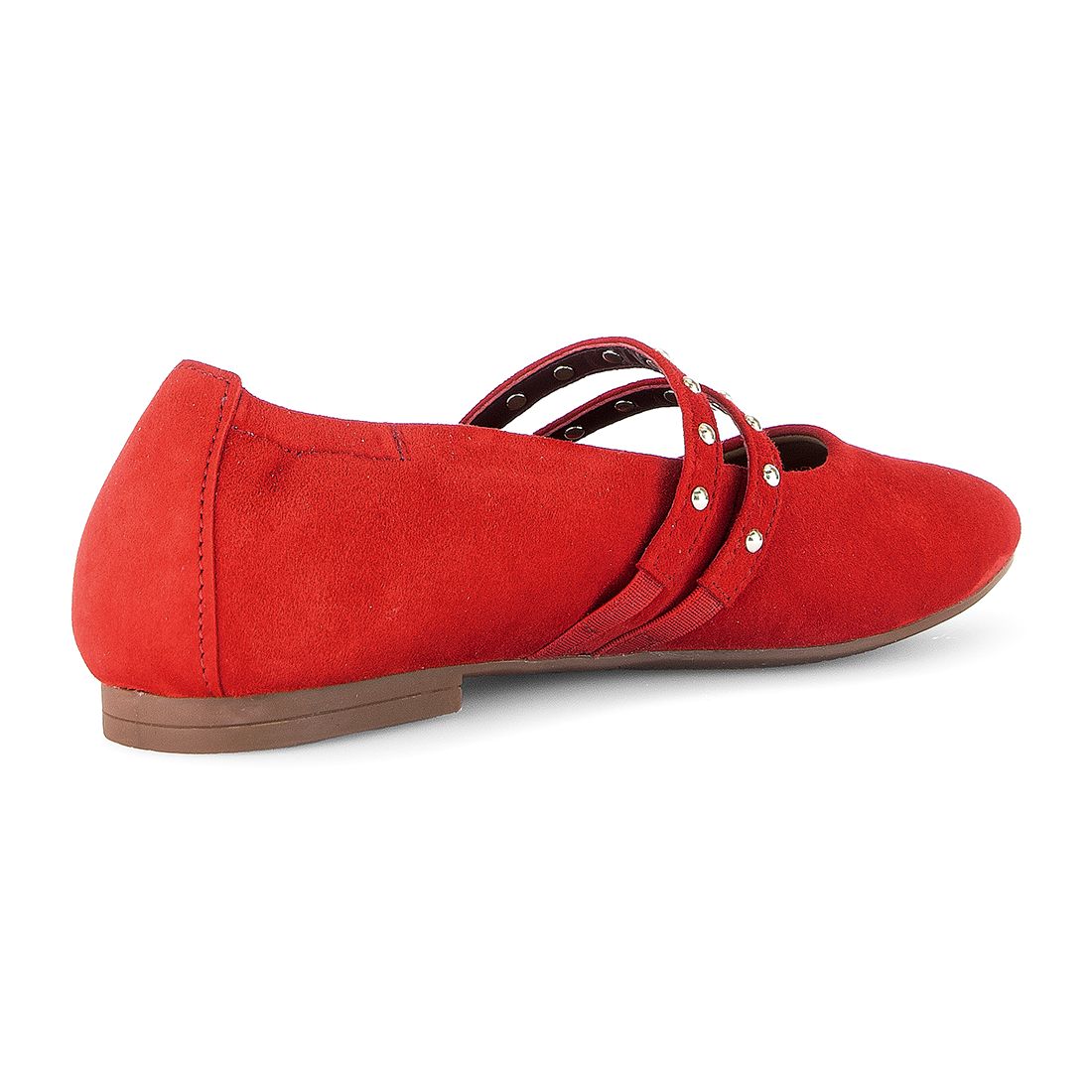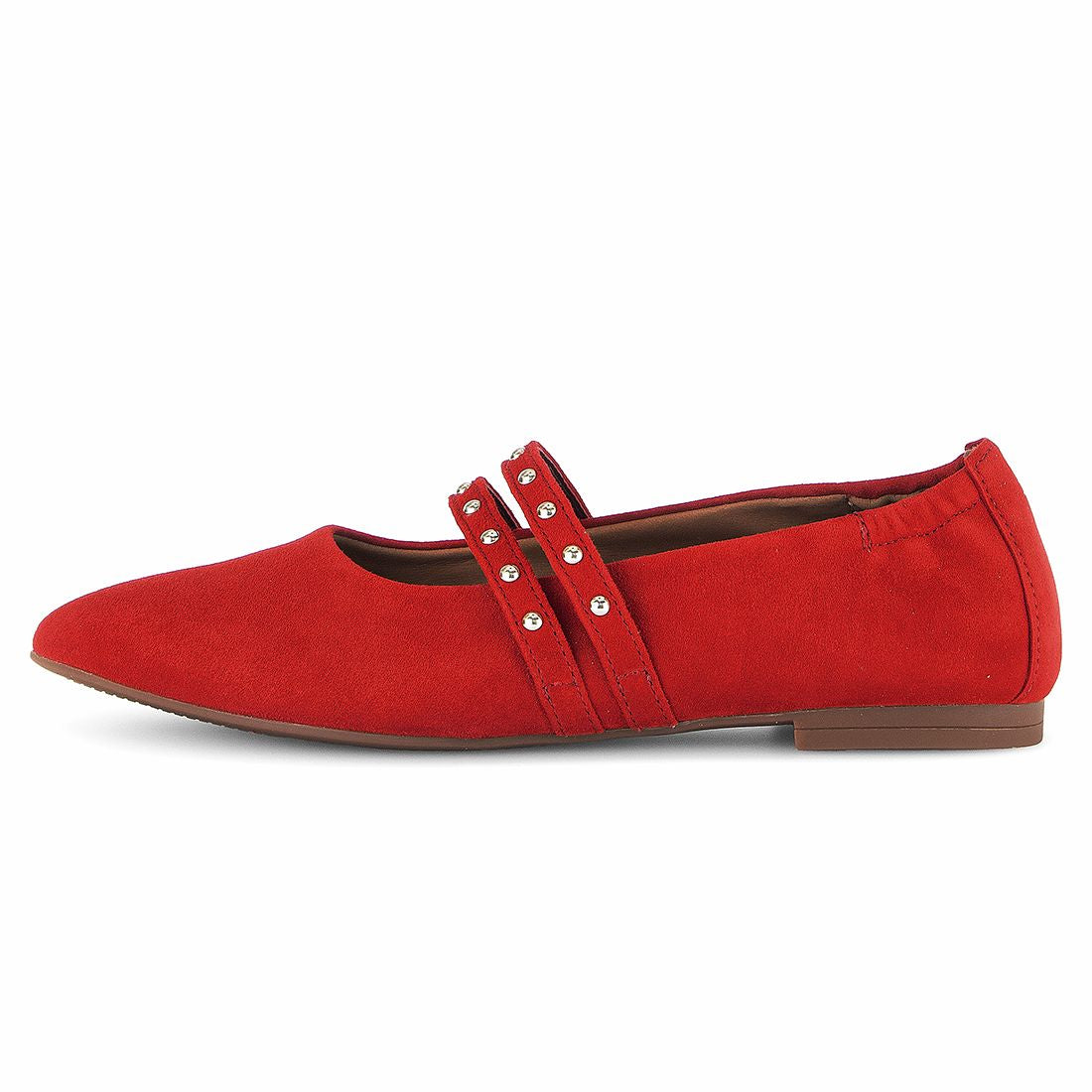 Rød ruskind ballerina med 2 remme over foden med små guld nitter og spids tå. Rynke detalje i hælkappen. Hæl 0,5 cm