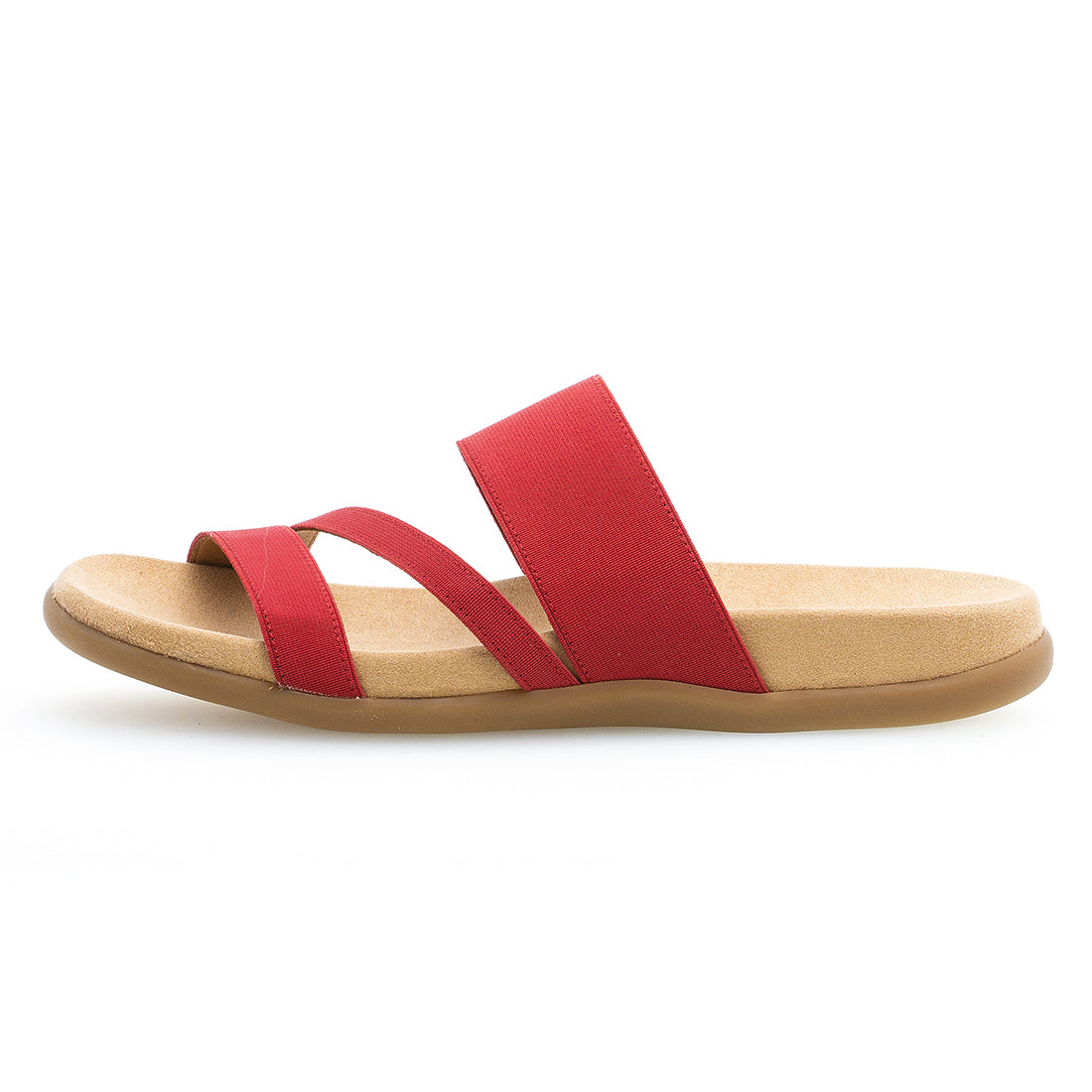 Sandal i rød tekstil elastik og læder på undersiden af remmene. Lige til at stikke i med formet indersål og Best Fitting, så der er 2 mm ekstra i forfoden. Lys gummisål/kile på 1 cm
