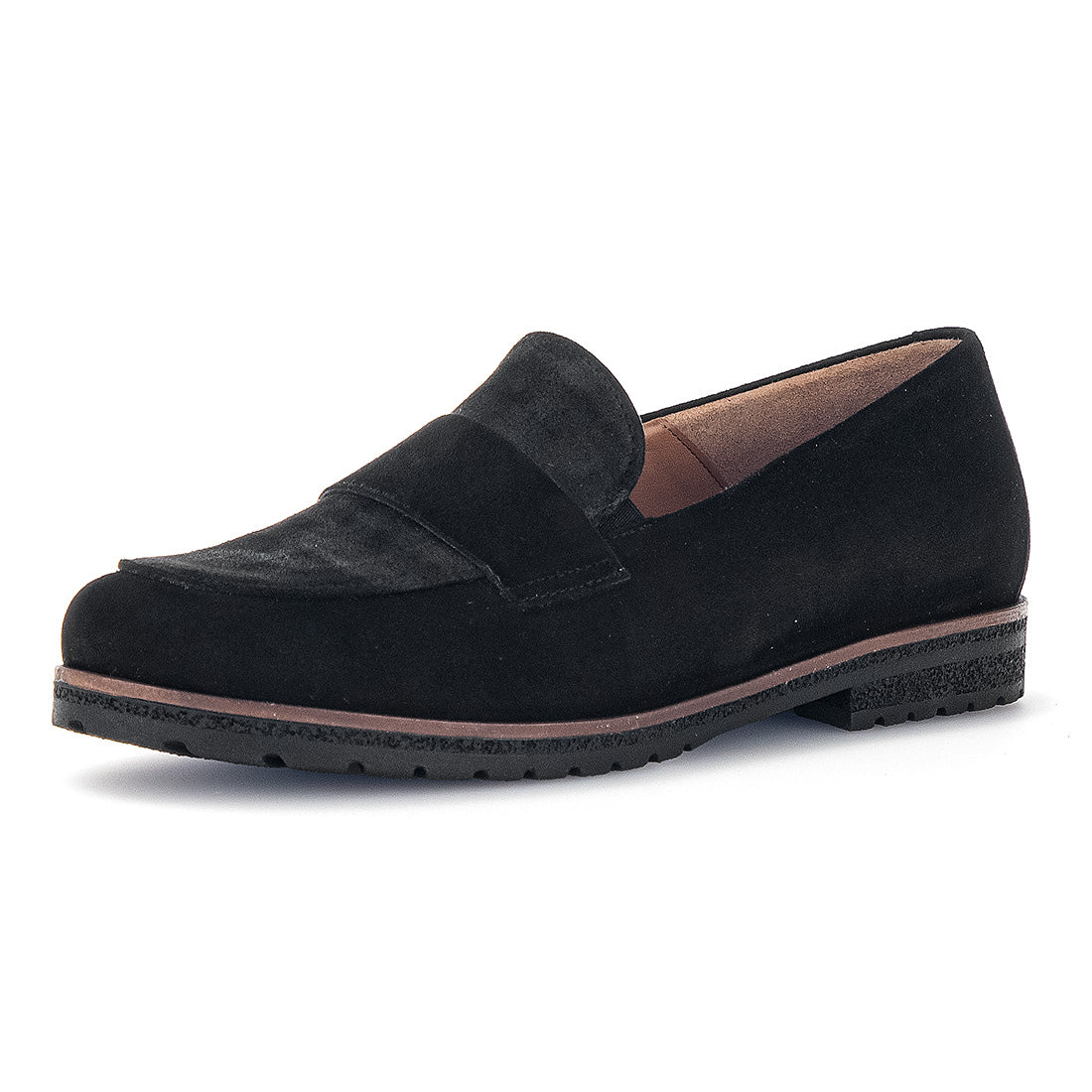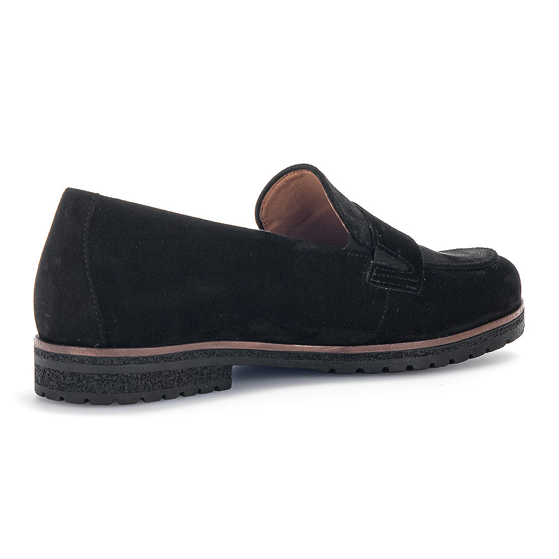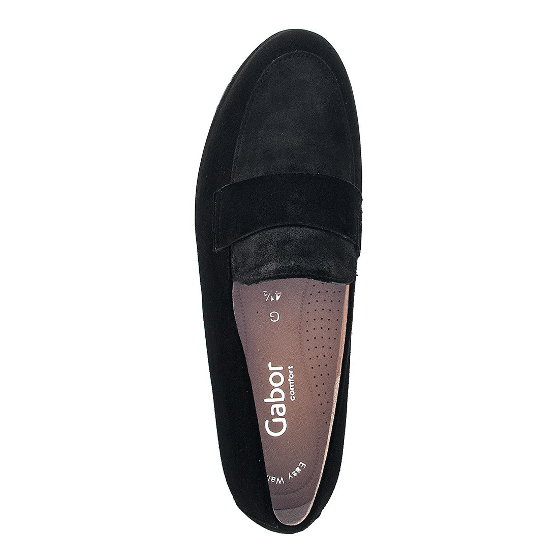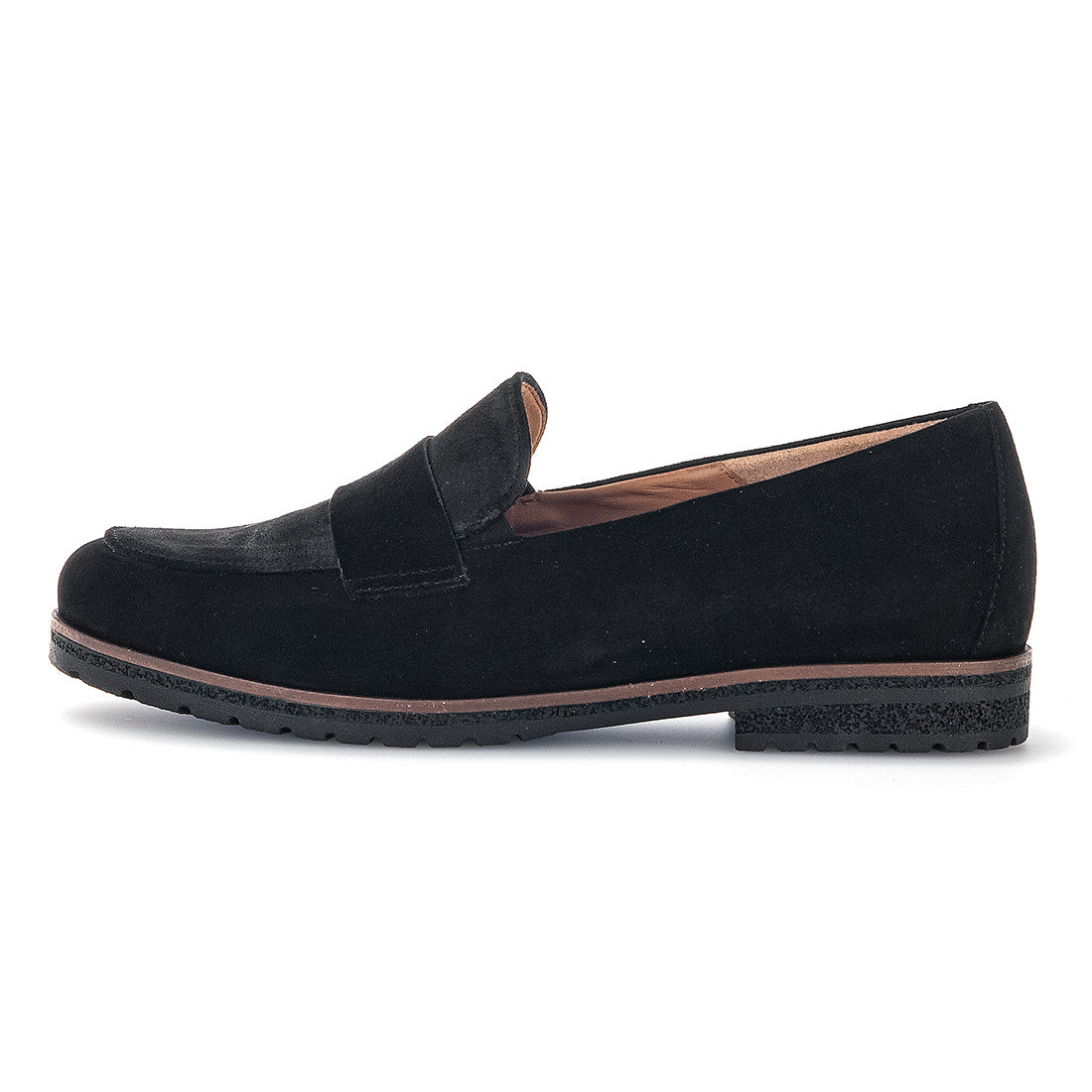 Loafer i sort ruskind og med Easy Walking komfort i den ekstra polstrede indersål. Skoen har Comfort vidde G og gummisål og hæl på 1,5 cm.