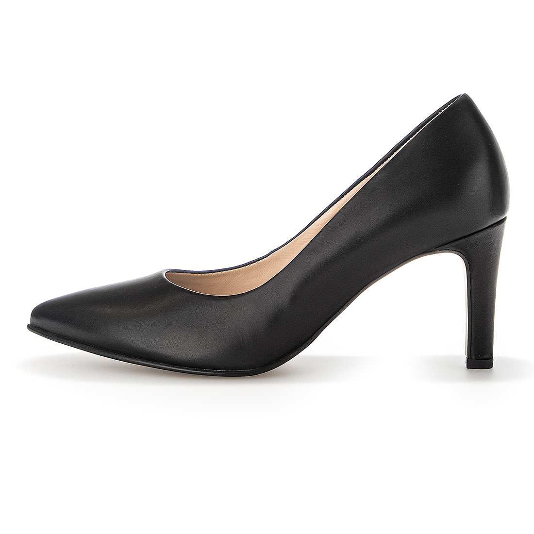 Flot og elegant sort skind pump / stilet med spids tå og slank betrukket hæl. Lys læder indersål. Almindelig vidde F. Hælhøjde på 7 cm.