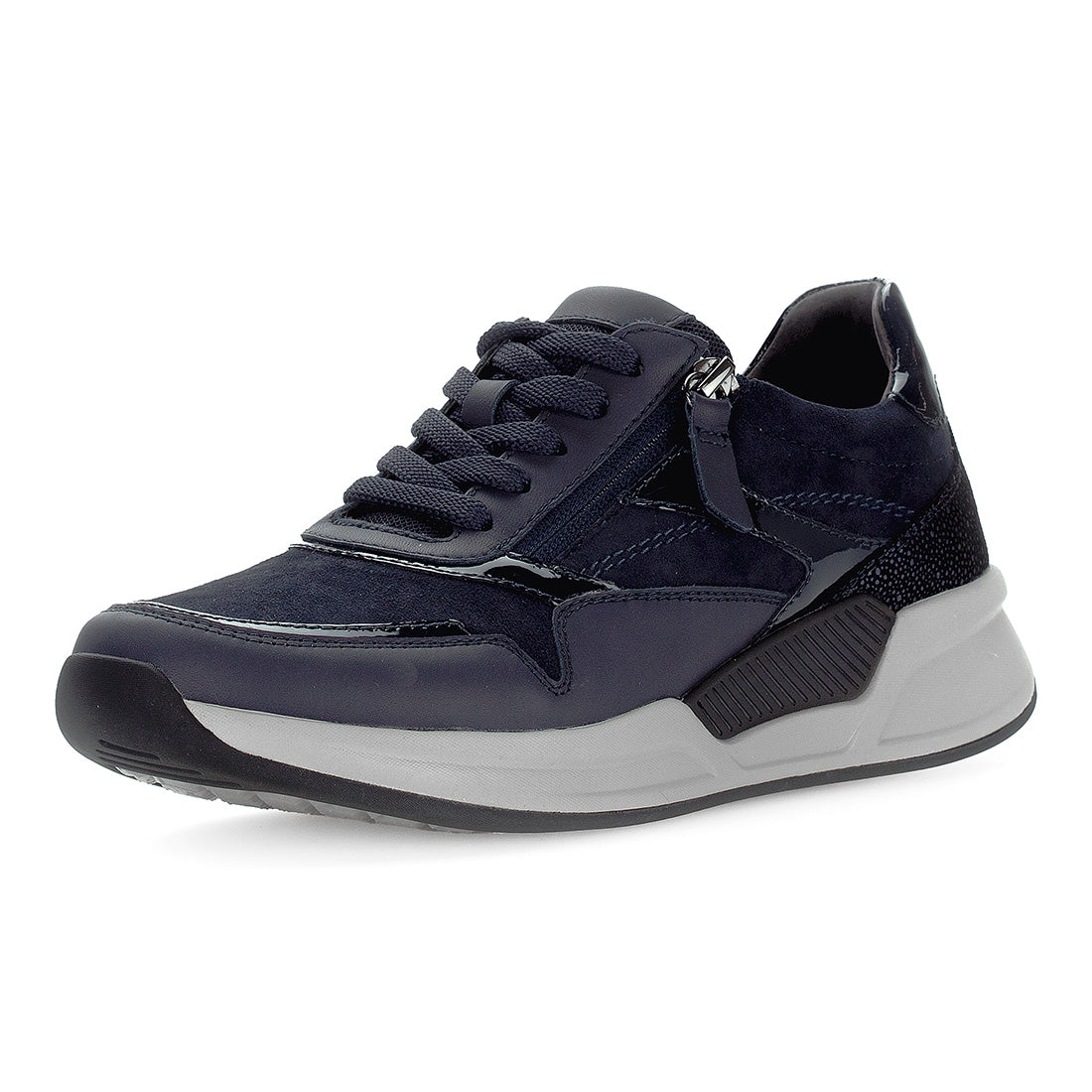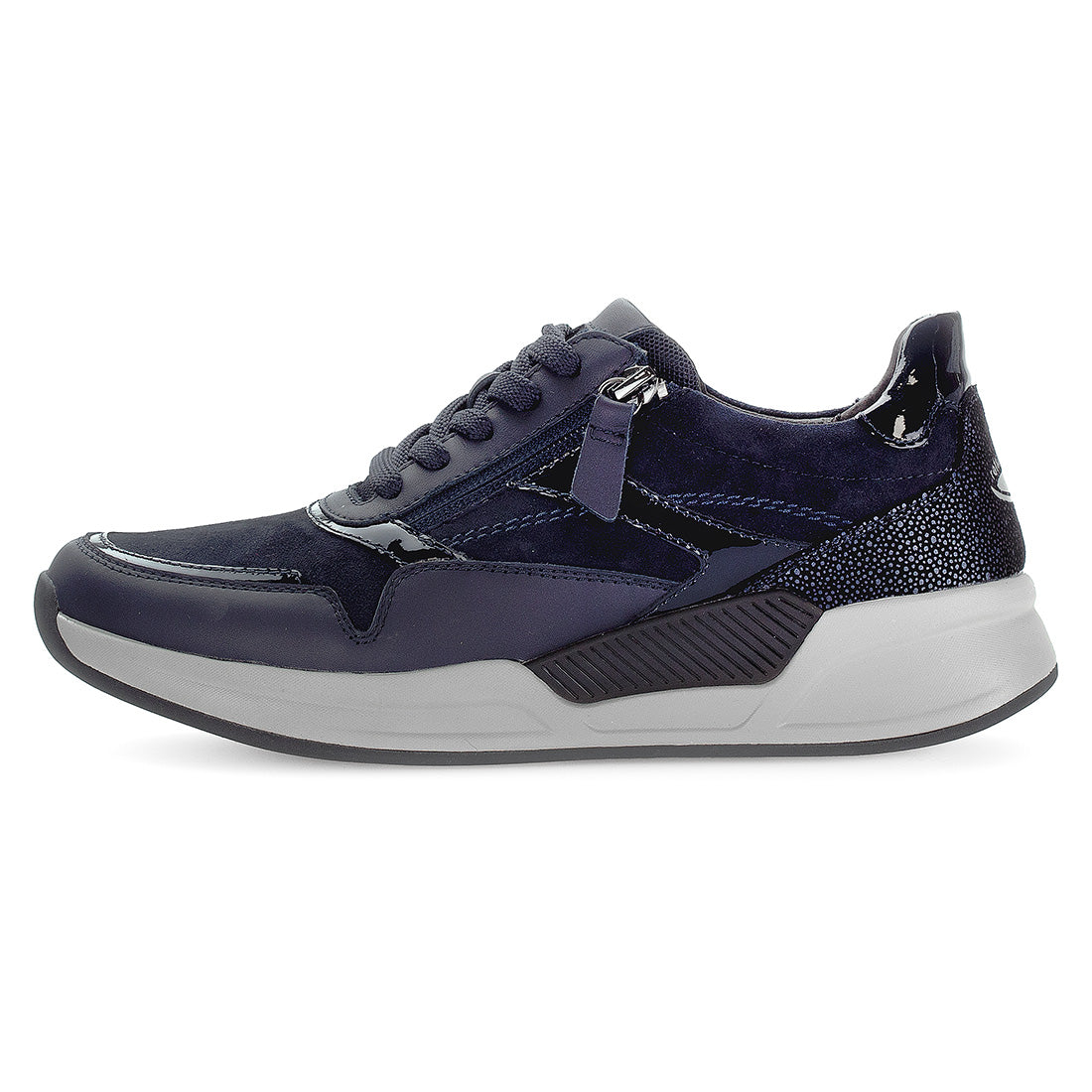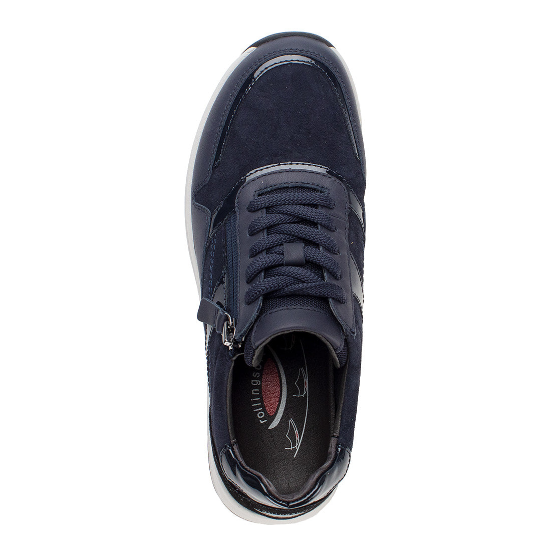 Blå skind, ruskind og lak sneaker med lynlås og snøre. Optifit udtagelig sål med Comfort vidde G, Kile på 2 cm. Rollingsoft er stødabsoberende og sålens bue understøtter fodens naturlige bevægelse. flaster op igennem ben og ryg.