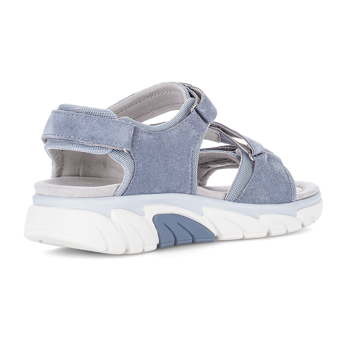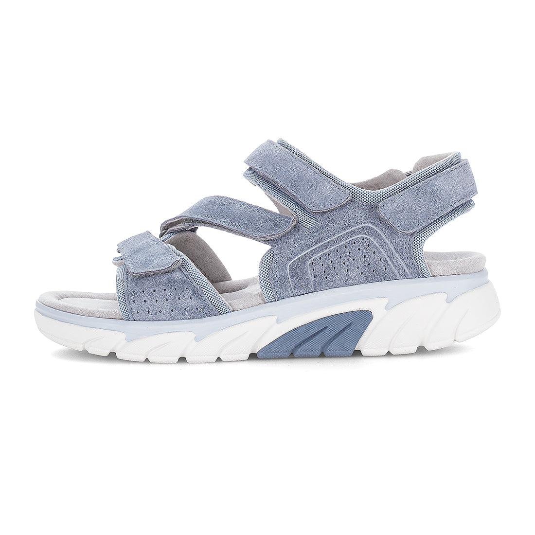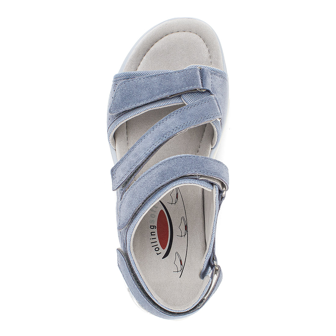 Denim blå ruskind sandal med 3 velcro remme over foden og bagrem. Comfort vidde G Gummisål med kile på 1,5 cm. Rolling Soft er stødabsoberende og sålens bue understøtter fodens naturlige bevægelser.