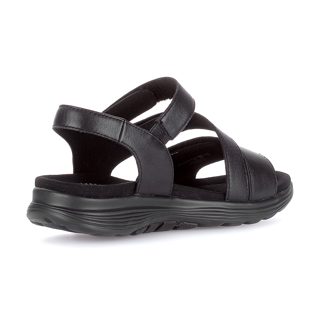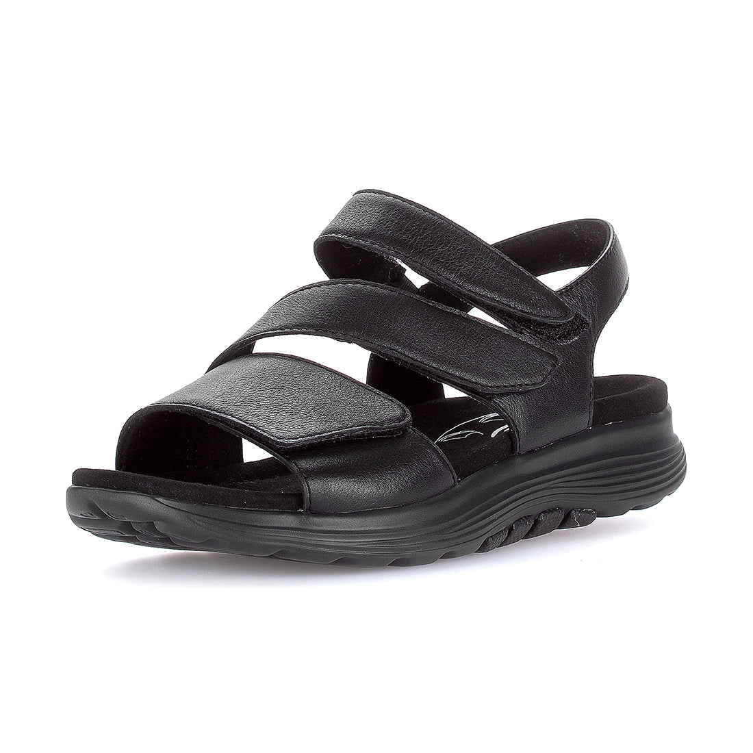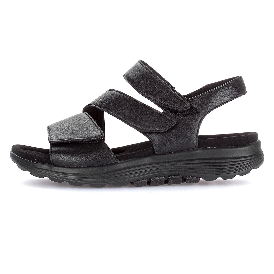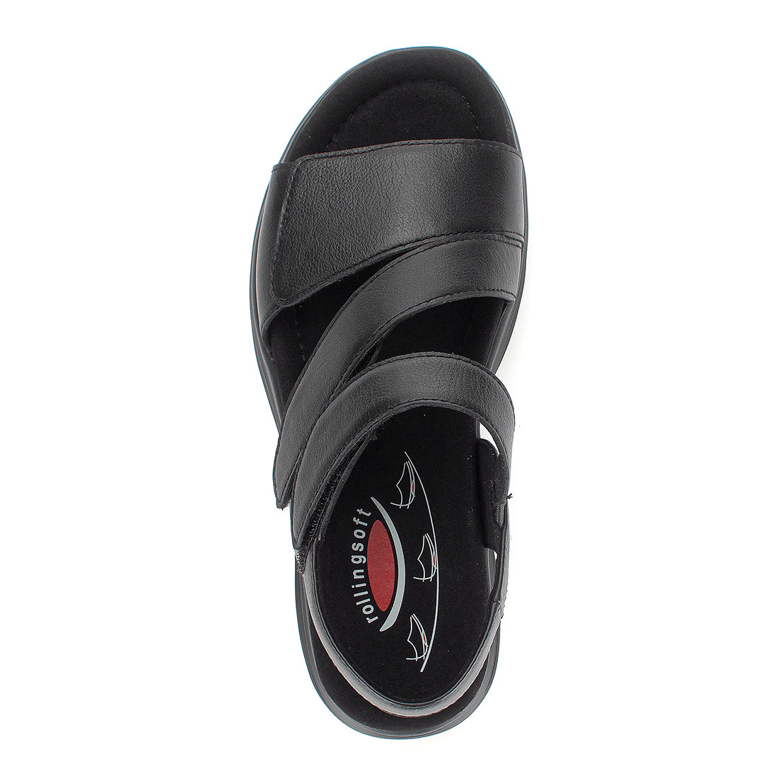 Sort skind sandal med tre velcroremme og over vristen. Comfort vidde G. Sort gummisål med 1,5 cm kile. Rollingsoft-teknologi sikrer stødabsorbering og naturlig fodbevægelse, der aflaster ben og ryg.
